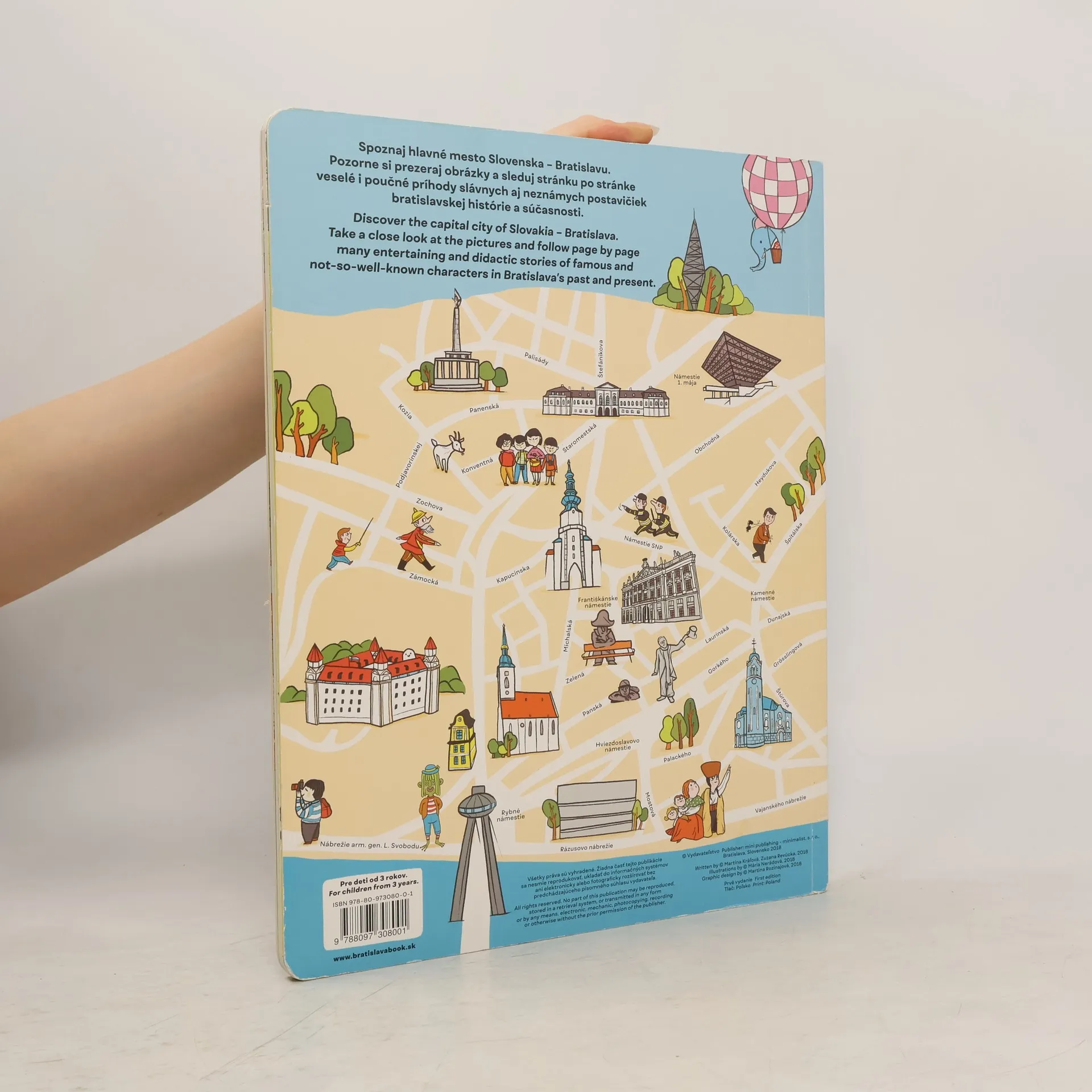 Detská obrázková kniha o hlavnom meste Slovenska – Bratislave. Deti samé alebo s rodičmi spoznávajú hlavné mesto hravou a náučnou formou. Na 14 stranách sledujú zábavné a náučné príbehy hlavných postáv. Deti tak trénujú svoju pozornosť, predstavivosť a fantáziu. Taktiež sa zoznamujú s naším nádherným hlavným mestom a významnými rodákmi alebo osobnosťami, ktoré pôsobili v Bratislave, ako napríklad Johann Nepomuk Hummel, Johann Wolfgang von Kempelen, Hans Christian Andersen, Ferdinand Martinengo, Ondrej Nepela, Ignác Lamár, Napoleon, Mária Terézia … Popritom spoznávajú historické pamiatky, architektúru, či tradičné špeciality ako napríklad bratislavské rožky, ktoré môžu malí čitatelia nájsť ukryté na každej z našich dvojstrán. Kniha má aj výchovný charakter - na príbehoch, ktoré sa prelínajú postupne na stranách knihy, sa deti učia k ochrane historických pamiatok a životného prostredia. Na 14 stranách môžete sledovať zábavné a náučné príbehy hlavných postáv. Ústredné postavy sú predstavené v úvode knihy, ďalšie nájdu deti pri jej čítaní. Na zadnej strane knihy sa nachádza ilustrovaná mapa Starého mesta s vyznačením hlavných dominánt mesta.
