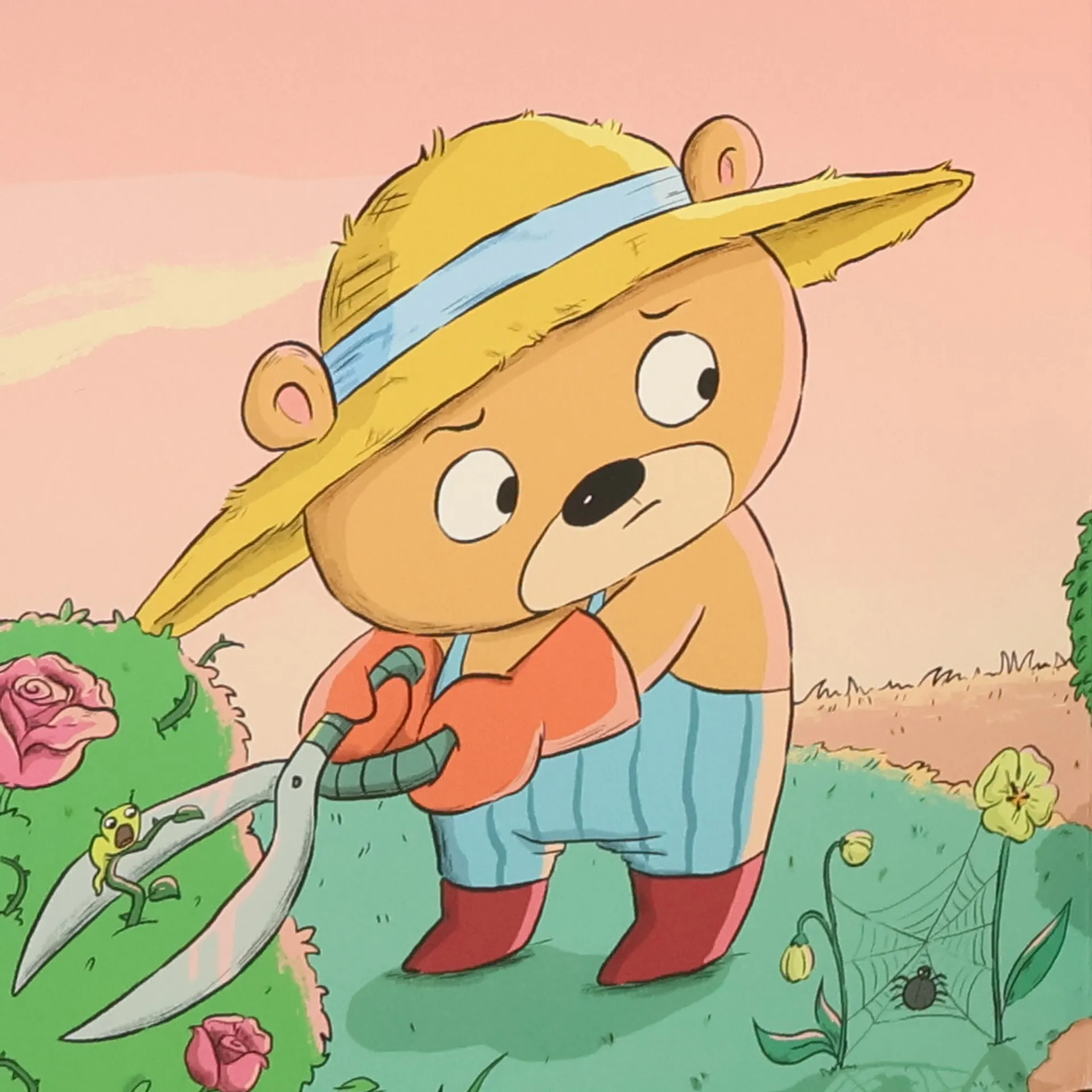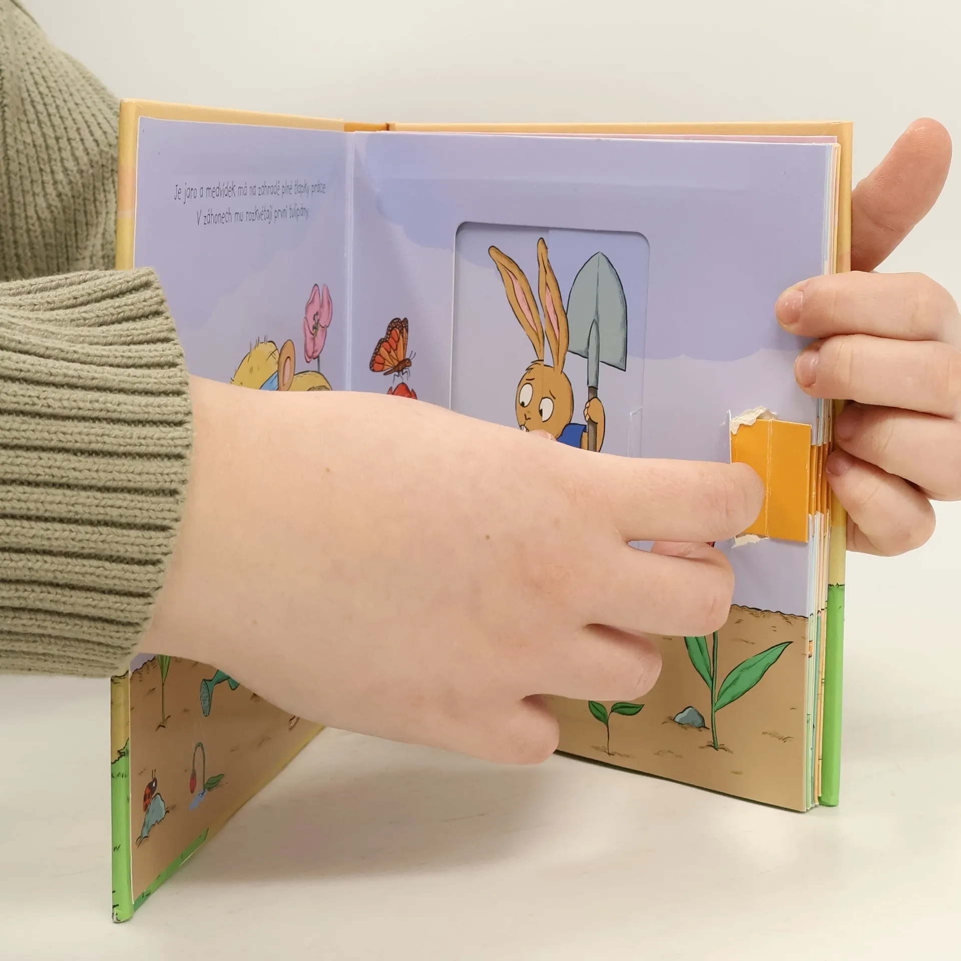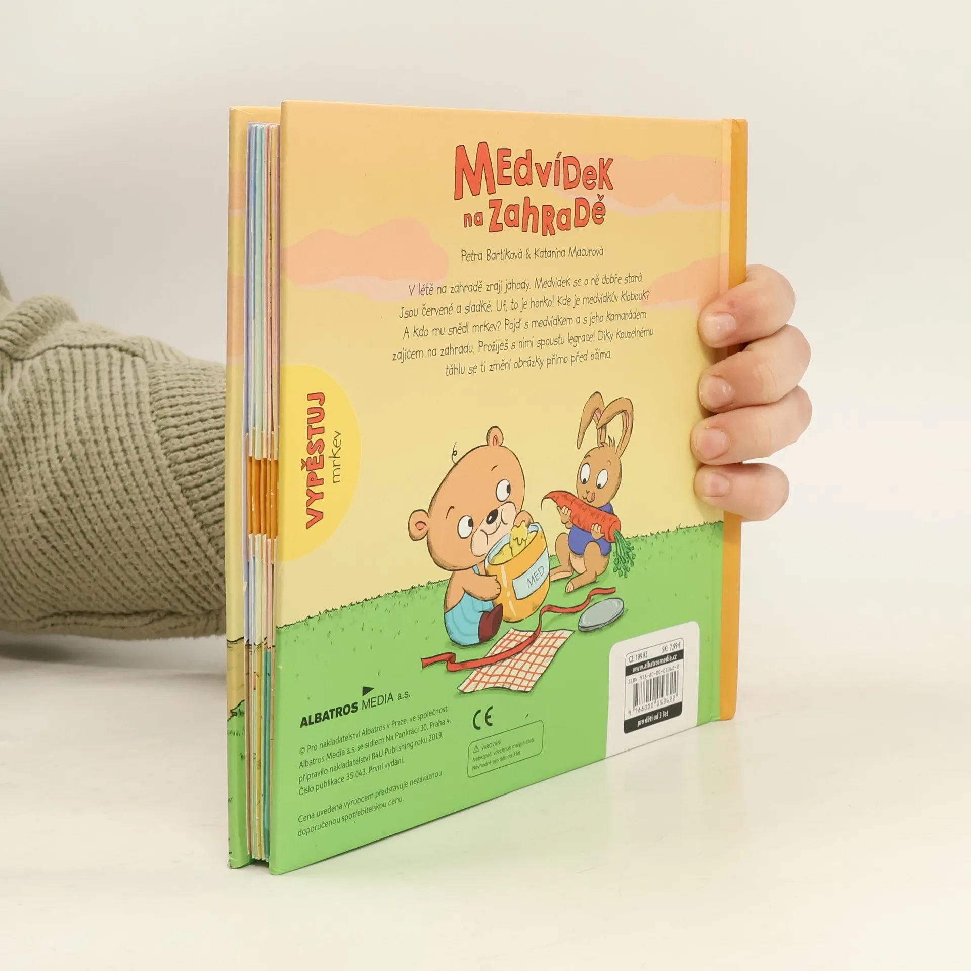 V létě na zahradě zrají jahody. Medvídek se o ně dobře stará. Jsou červené a sladké. Uf, to je horko! Kde je medvídkův klobouk? A kdo mu snědl mrkev? Pojď s medvídkem a s jeho kamarádem zajícem na zahradu. Prožiješ s nimi spoustu legrace! Díky kouzelnému táhlu se ti změní obrázky přímo před očima.
