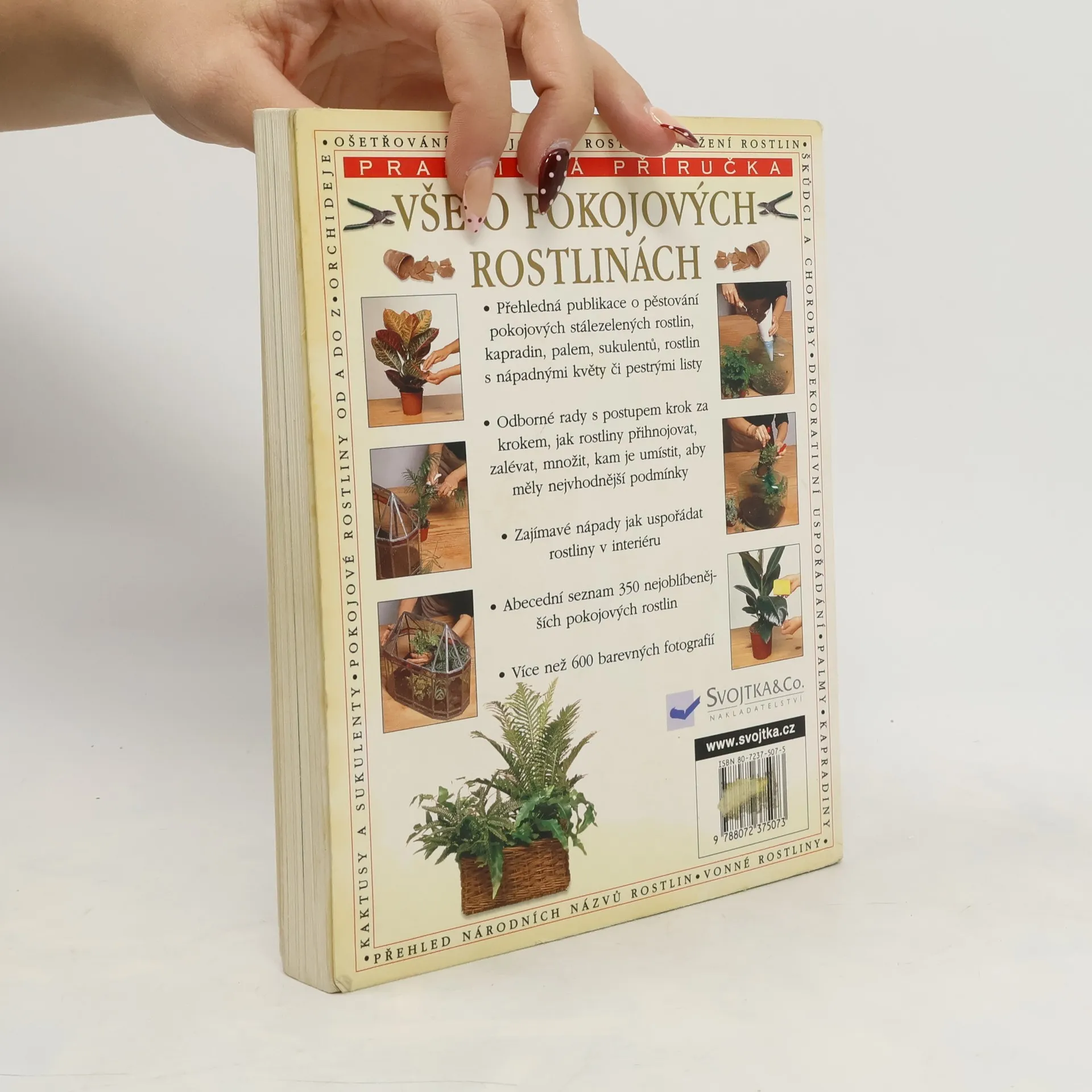 Přehledná publikace o pěstování pokojových stále zelených rostlin, kapradin, palem, sukulentů, rostlin s nápadnými květy či pestrými listy. . Odborné rady s postupem krok za krokem, jak rostliny přihnojovat, zalévat, množit, kam je umístit, aby měly nejvhodnější podmínky . Zajímavé nápady jak uspořádat rostliny v interiéru . Abecední seznam 350 nejoblíbenějších pokojových rostlin . Více než 600 barevných fotografií