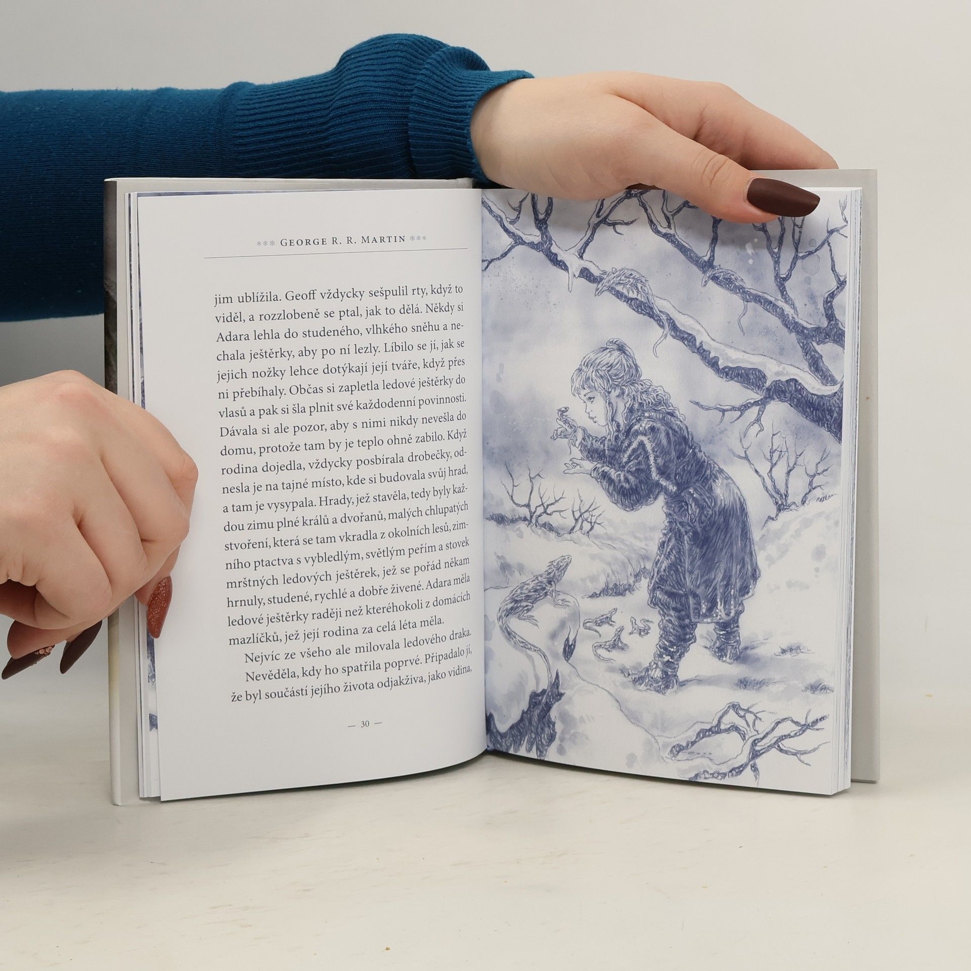 Ledový drak byl stvoření opředené legendami a vzbuzující strach. Žádný člověk totiž ledového draka nikdy nezkrotil. Když přeletěl přes oblohu, zůstala po něm jen strašlivá zima a zmrzlá země. Ale Adara se ho nebála. Adara totiž byla zimní dítě, narodila se za nejkrutějšího mrazu, jaký kdo pamatoval. Už si nevzpomínala, kdy ledového draka spatřila poprvé. Připadalo jí, že byl součástí jejího života odjakživa, že ji zdálky pozoroval, jak si hraje na studeném sněhu, když už ostatní děti dávno utekly do tepla. Když jí byly čtyři roky, poprvé se ho dotkla, a v pěti letech se poprvé proletěla na jeho širokém, chladivém hřbetě. Později, když jí bylo sedm, jednoho klidného letního dne přiletěli ze severu ohniví draci a napadli poklidnou farmu, jež byla Adařiným domovem. A jedině zimní dítě – a ledový drak, který Adaru miloval – dokázali zachránit svět před úplným zničením. Na příběhy Ledového draka, které mu vyprávěla chůva, vzpomíná i Jon Sníh při hlídce na Zdi v Písni ledu a ohně. Ledový drak George R. R. Martina, jednoho z nejrespektovanějších autorů fantasy literatury, doplněný ilustracemi Luise Royo, je nezapomenutelným příběhem o odvaze, lásce a oběti.
