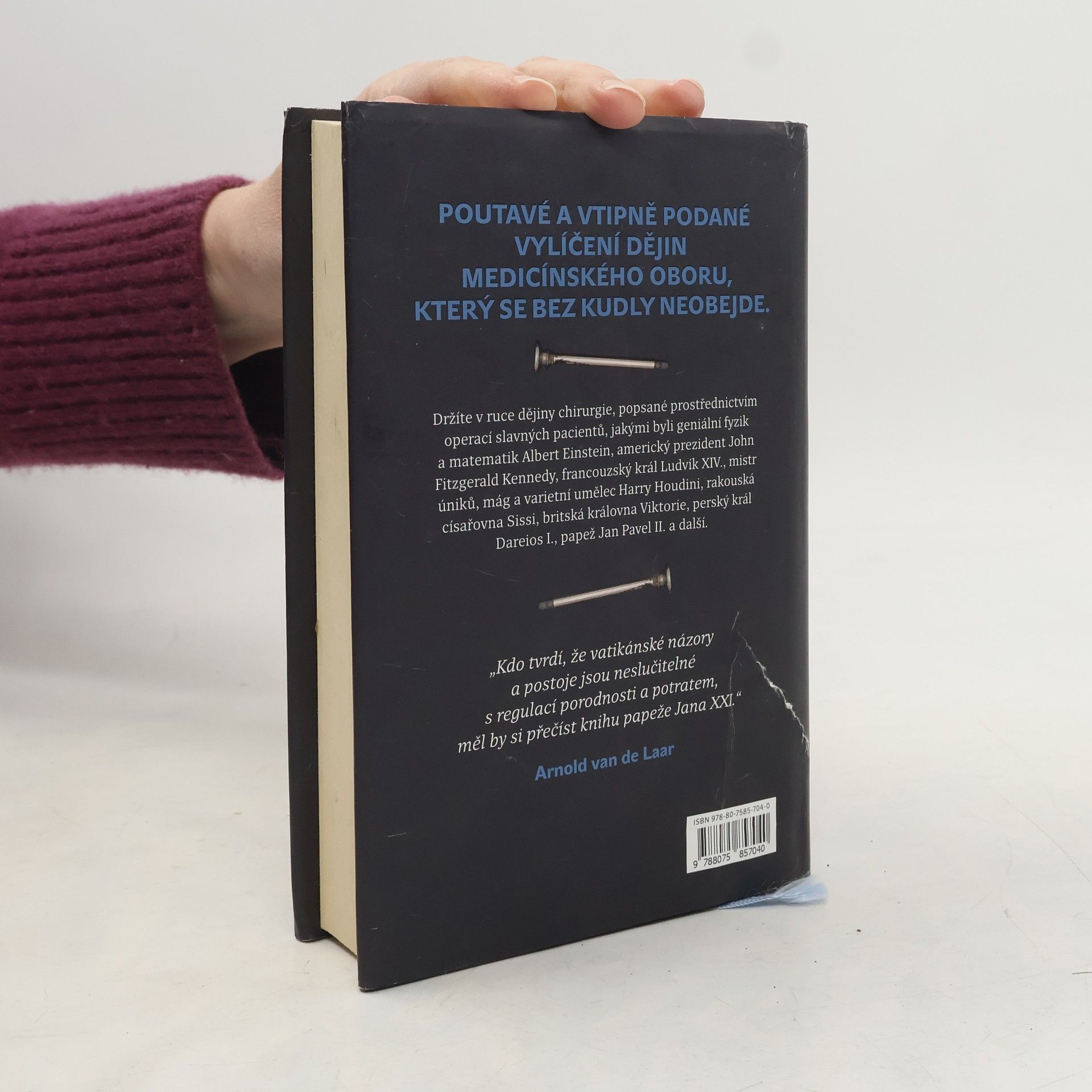 Nizozemský lékař Arnold van de Laar líčí dějiny chirurgie zasvěcenému i laickému čtenáři se smyslem pro detail i anekdotickou zkratku. Zvolil k tomu případy proslulých pacientů, jako byl geniální fyzik a matematik Albert Einstein, americký prezident John Fitzgerald Kennedy, francouzský král Ludvík XIV., mistr úniku, mág a varietní umělec Harry Houdini, rakouská císařovna Sisi, britská královna Viktorie, perský král Dareios, papež Jan Pavel II. a další. Ve 29 kapitolách sledujeme napínavé příběhy, zdárné zákroky i zákroky méně podařené. Od první kapitoly popisující čin chirurga-amatéra, amsterdamského kováře Jana De Doota ve „zlatém“ sedmnáctém století, až po výjimečnou operaci paúhoře elektrického prochází čtenář dobami, kdy „nejdůležitějším atributem v úspěšné praxi… byl rychlý kůň“, vrací se do historie, aby poznal příběh starý 2500 let, žasne nad srovnáním způsobů léčby „tenkrát“ a dnes, připomene si doby, kdy péče o hygienu takřka neexistovala a o anestezii se nikomu ani nesnilo. Poutavé, vtipně podané vylíčení dějin medicínského oboru, který se bez nože neobejde.