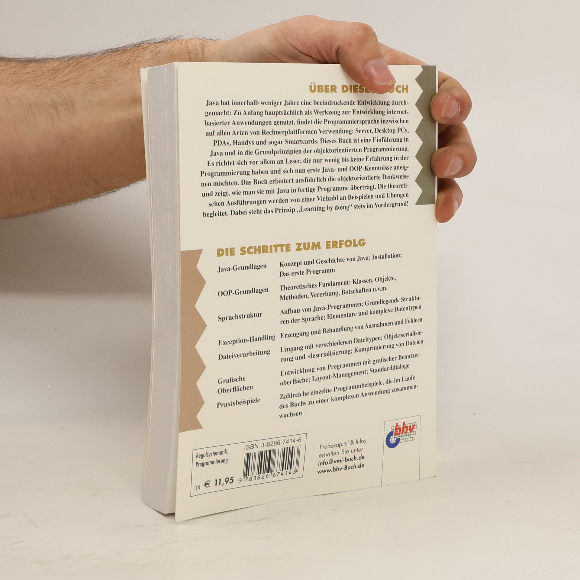 Dieses Buch ist eine Einführung in Java und in die Grundprinzipien der objektorientierten Programmierung. Es richtet sich vor allem an Leser, die nur wenig bis keine Erfahrung in der Programmierung haben und sich nun erste Java- und OOP-Kenntnisse aneignen möchten. Das Buch erläutert ausführlich die objektorientierte Denkweise und zeigt, wie man sie mit Java in fertige Programme überträgt. Die theoretischen Ausführungen werden von einer Vielzahl an Beispielen und Übungen begleitet.