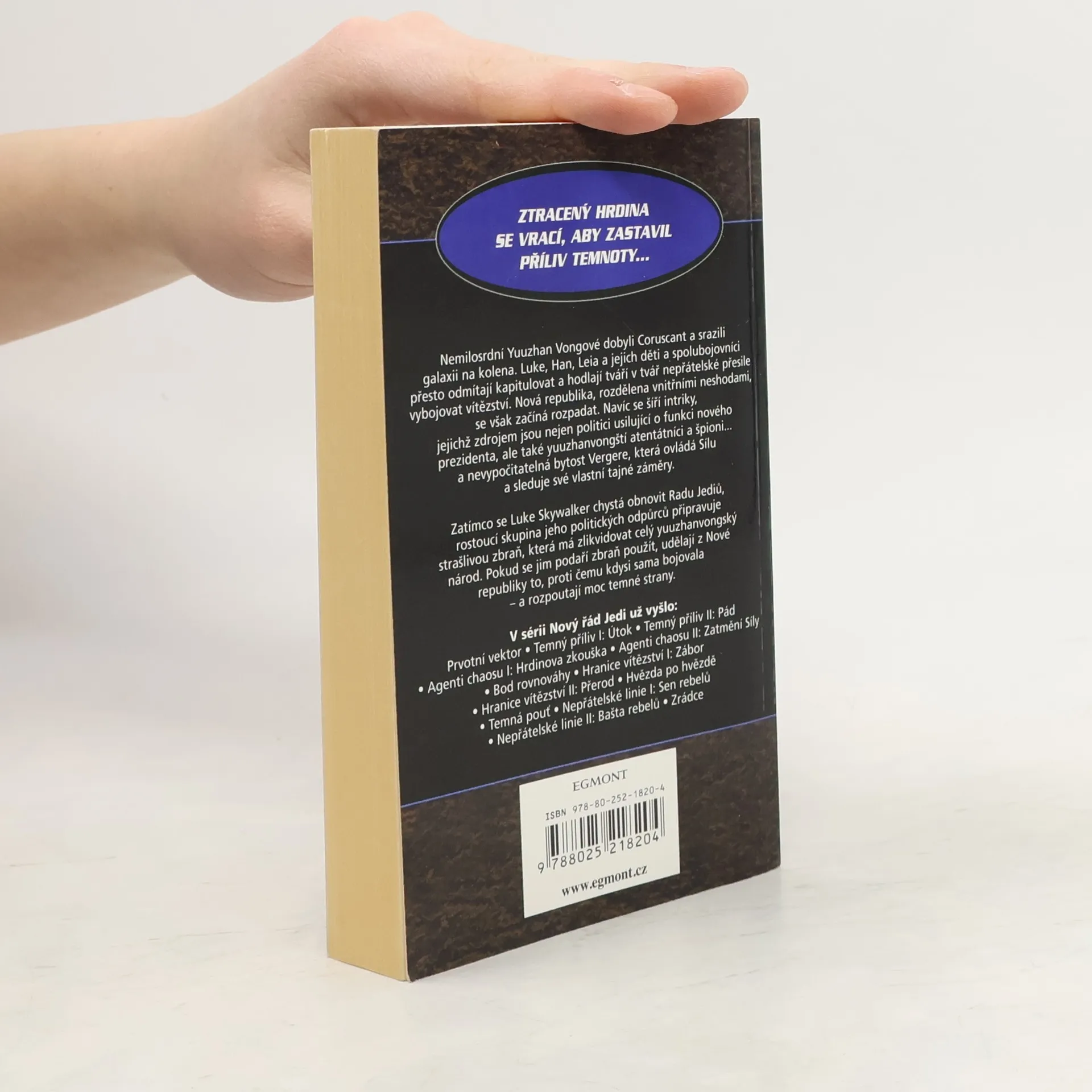 Ztracený hrdina se vrací, aby zastavil příliv temnoty... Nemilosrdní Yuuzhan Vongové dobyli Coruscant a srazili galaxii na kolena. Luke, Han, Leia a jejich děti a spolubojovníci přesto odmítají kapitulovat a hodlají tváří v tvář nepřátelské přesile vybojovat vítězství. Nová republika, rozdělena vnitřními neshodami, se však začíná rozpadat. Navíc se šíří intriky, jejichž zdrojem jsou nejen politici usilující o funkci nového prezidenta, ale také yuuzhanvongští atentátníci a špioni... a nevypočitatelná bytost Vergere, která ovládá Sílu a sleduje své vlastní tajné záměry. Zatímco se Luke Skywalker chystá obnovit Radu Jediů, rostoucí skupina jeho politických odpůrců připravuje strašlivou zbraň, která má zlikvidovat celý yuuzhanvongský národ. Pokud se jim podaří zbraň použít, udělají z Nové republiky to, proti čemu kdysi sama bojovala - a rozpoutají moc temné strany.