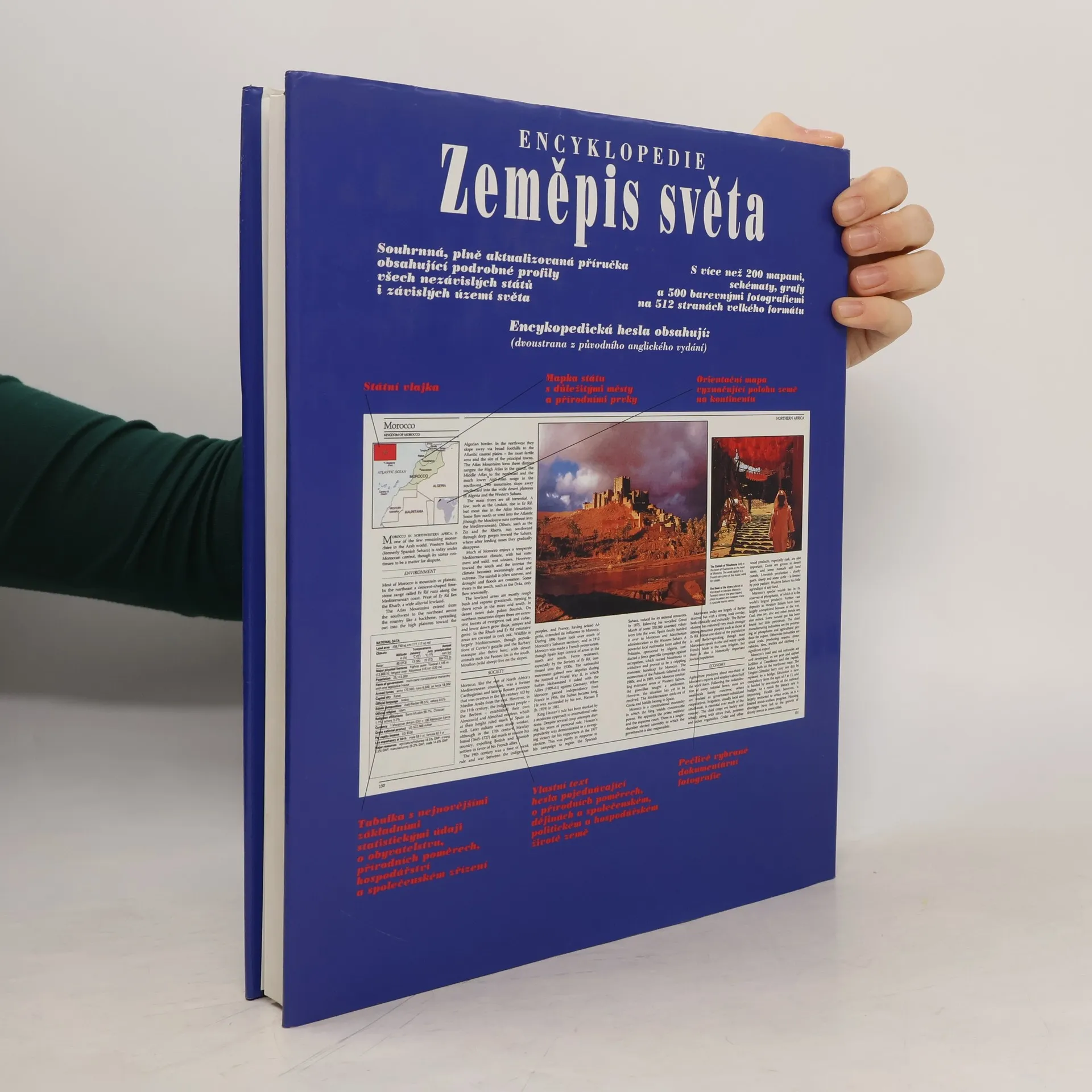 V posledním desetiletí jsme byli svědky posunů hranic a vzniku nových států, ale dosud chyběla souhrnná příručka, která by informovala o těchto změnách. Encyklopedie Zeměpis světa se zaměřuje na všechny země, včetně těch vzniklých po rozpadu SSSR, Jugoslávie a Československa. Obsahuje podrobné profily 189 zemí, které jsou mnohem obsáhlejší než obvyklé encyklopedické svazky, a zahrnuje mapy, fakta, statistiky a fotografie, což ji činí jednou z nejpraktičtějších příruček. Rozsah hesel se liší, od 50 stran pro USA po jednostránkové profily menších zemí, přičemž každé heslo je založeno na aktuálních údajích a strukturováno tak, aby usnadnilo porovnávání. Profily zahrnují tři hlavní oddíly: Přírodní poměry, Společnost a Hospodářství, popisující klimatické podmínky, historické události, kulturu a hospodářství. Země jsou rozděleny podle geografických oblastí, přičemž každá má svou mapu a obsahuje státní vlajku, umístění na kontinentu a základní statistické údaje. Některá hesla obsahují i ilustrované články o unikátních kulturních a historických jevech. V knize jsou uvedena chybná ISBN 80-901727-6-8 a 80-7176-022-6.