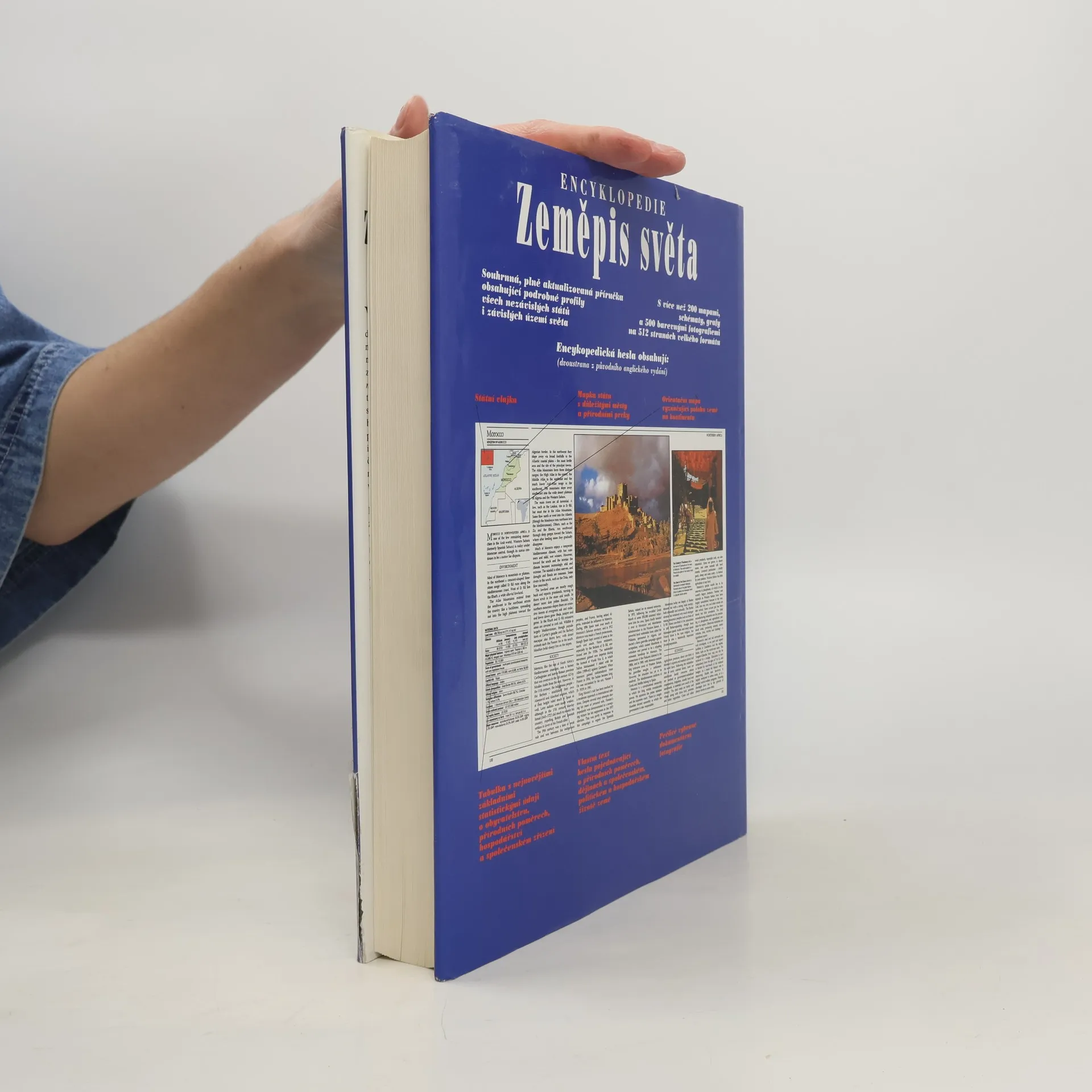 V posledním desetiletí jsme byli svědky posunů hranic a vzniku nových států, ale dosud chyběla souhrnná příručka, která by informovala o těchto změnách. Encyklopedie Zeměpis světa se zaměřuje na všechny země, včetně těch vzniklých po rozpadu SSSR, Jugoslávie a Československa. Obsahuje podrobné profily 189 zemí, které jsou mnohem obsáhlejší než obvyklé encyklopedické svazky, a zahrnuje mapy, fakta, statistiky a fotografie, což ji činí jednou z nejpraktičtějších příruček. Rozsah hesel se liší, od 50 stran pro USA po jednostránkové profily menších zemí, přičemž každé heslo je založeno na aktuálních údajích a strukturováno tak, aby usnadnilo porovnávání. Profily zahrnují tři hlavní oddíly: Přírodní poměry, Společnost a Hospodářství, popisující klimatické podmínky, historické události, kulturu a hospodářství. Země jsou rozděleny podle geografických oblastí, přičemž každá má svou mapu a obsahuje státní vlajku, umístění na kontinentu a základní statistické údaje. Některá hesla obsahují i ilustrované články o unikátních kulturních a historických jevech. V knize jsou uvedena chybná ISBN 80-901727-6-8 a 80-7176-022-6.