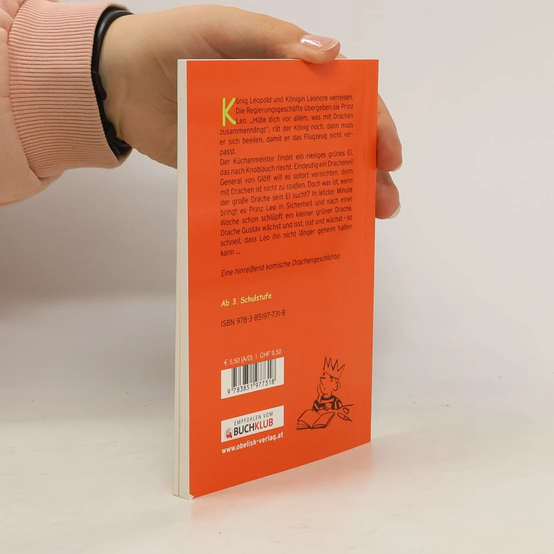 König Leopold und Königin Leonore verreisen. Die Regierungsgeschäfte übergeben sie Prinz Leo. „Hüte dich vor allem, was mit Drachen zusammenhängt“, rät der König noch, dann muss er sich beeilen, damit er das Flugzeug nicht verpasst. Der Küchenmeister findet ein riesiges grünes Ei, das nach Knoblauch riecht. Eindeutig ein Drachenei! General von Glöff will es sofort vernichten, denn mit Drachen ist nicht zu spaßen. Doch was ist, wenn der große Drache sein Ei sucht? In letzter Minute bringt es Prinz Leo in Sicherheit und nach einer Woche schon schlüpft ein kleiner grüner Drache. Drache Gustav wächst und isst, isst und wächst – so schnell, dass Leo ihn nicht länger geheim halten kann …