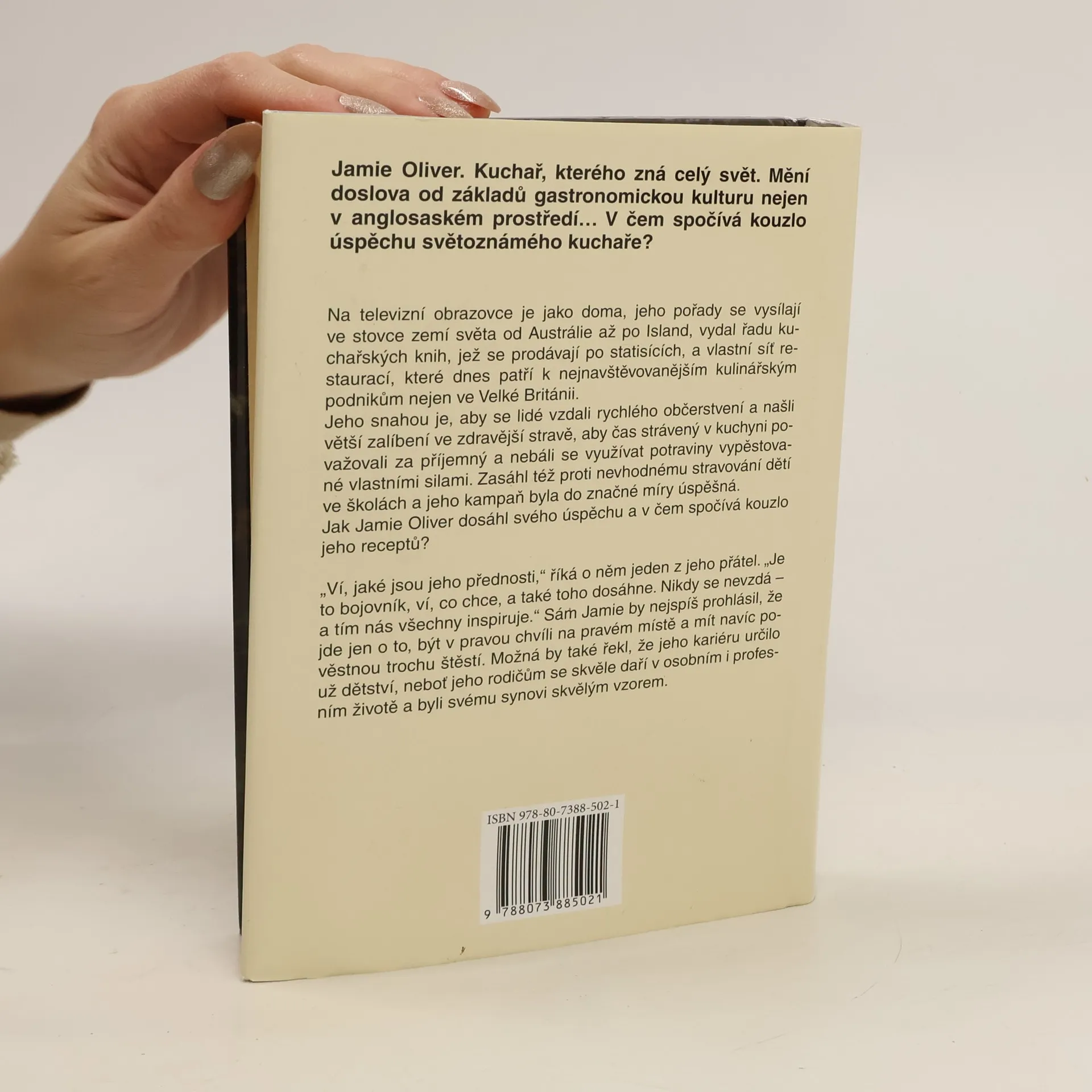 Jamie Oliver, teprve pětatřicetiletý britský kuchař, je známý po celém světě, zejména ve Velké Británii a USA. Jeho vliv na gastronomickou kulturu je značný, ačkoli se nevyhýbá kontroverzím. Jeho televizní pořady se vysílají ve stovce zemí, vydal úspěšné kuchařské knihy a založil vyhledávané restaurace ve Velké Británii. Oliver usiluje o to, aby lidé opustili rychlé občerstvení a objevili radost ze zdravější stravy, přičemž chce, aby čas strávený v kuchyni byl příjemný a lidé se nebáli používat vlastní suroviny. Také se angažoval v boji proti nevhodnému stravování dětí ve školách, což vedlo k úspěšným kampaním. Jeho přátelé ho popisují jako bojovníka, který ví, co chce, a nikdy se nevzdává, čímž inspiruje ostatní. Jamie sám by možná řekl, že úspěch je o správném načasování a troše štěstí, a že jeho kariéru ovlivnilo šťastné dětství s rodiči, kteří mu byli vzorem. Jamie Oliver vyrůstal na venkově a nyní žije v Londýně se svou manželkou a dětmi.