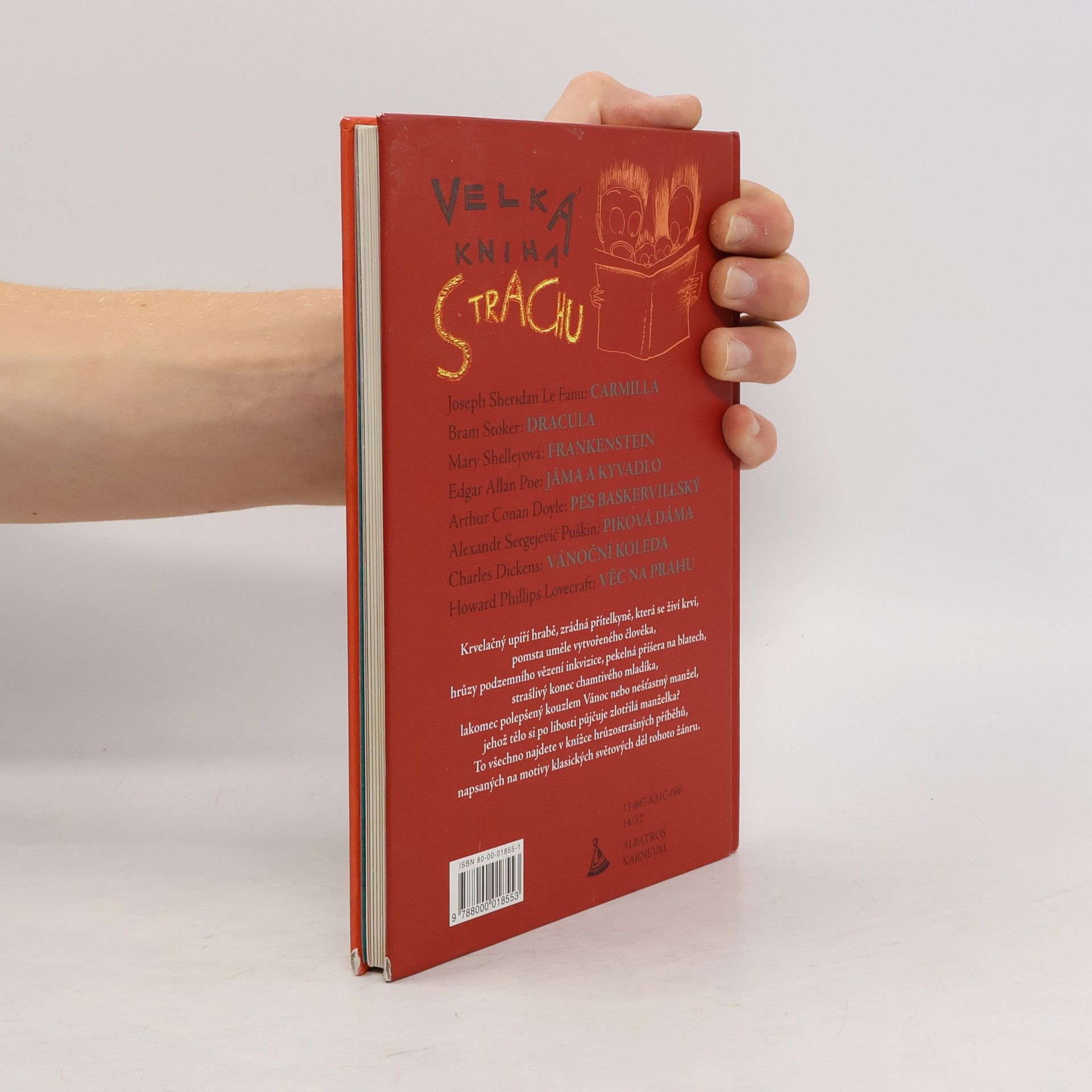 Krvelační upíří hrabě, zrádná přítelkyně, která se živí krví, pomsta uměle vytvořeného člověka, hrůzy podzemního vězení inkvizice, pekelná příšera na blatech, strašlivý konec chamtivého mladíka, lakomec polepšený kouzlem Vánoc nebo nešťastný manžel, jehož tělo si po libosti půjčuje zlotřilá manželka? To všechno najdete v knížce hrůzostrašných příběhů, napsaných na motivy klasických světových děl tohoto žánru. Příběhy, při jejichž čtení naskakuje husí kůže, lákaly a lákají autory od nepaměti. A čtenáři je s velikou oblibou hltají ve volných chvílích. Proto vznikl i sborník Velká kniha Strachu, ve kterém najdete zjednodušené verze klasických hrůzostrašných příběhů od slavných spisovatelů. Nepostradatelná knížka pro všechny, kdo se rádi bojí. Sestavila a převyprávěla Veronika Bohatá Povídky: - Joseph Sheridan Le Fanu: Carmilla - Bram Stoker: Dracula - Mary W. Shelley: Frankenstein - Edgar Allan Poe: Jáma a kyvadlo - Arthur Conan Doyle: Pes baskervillský - Alexandr Sergejevič Puškin: Piková dáma - Charles Dickens: Vánoční koleda - Howard Phillips Lovecraft: Věc na prahu