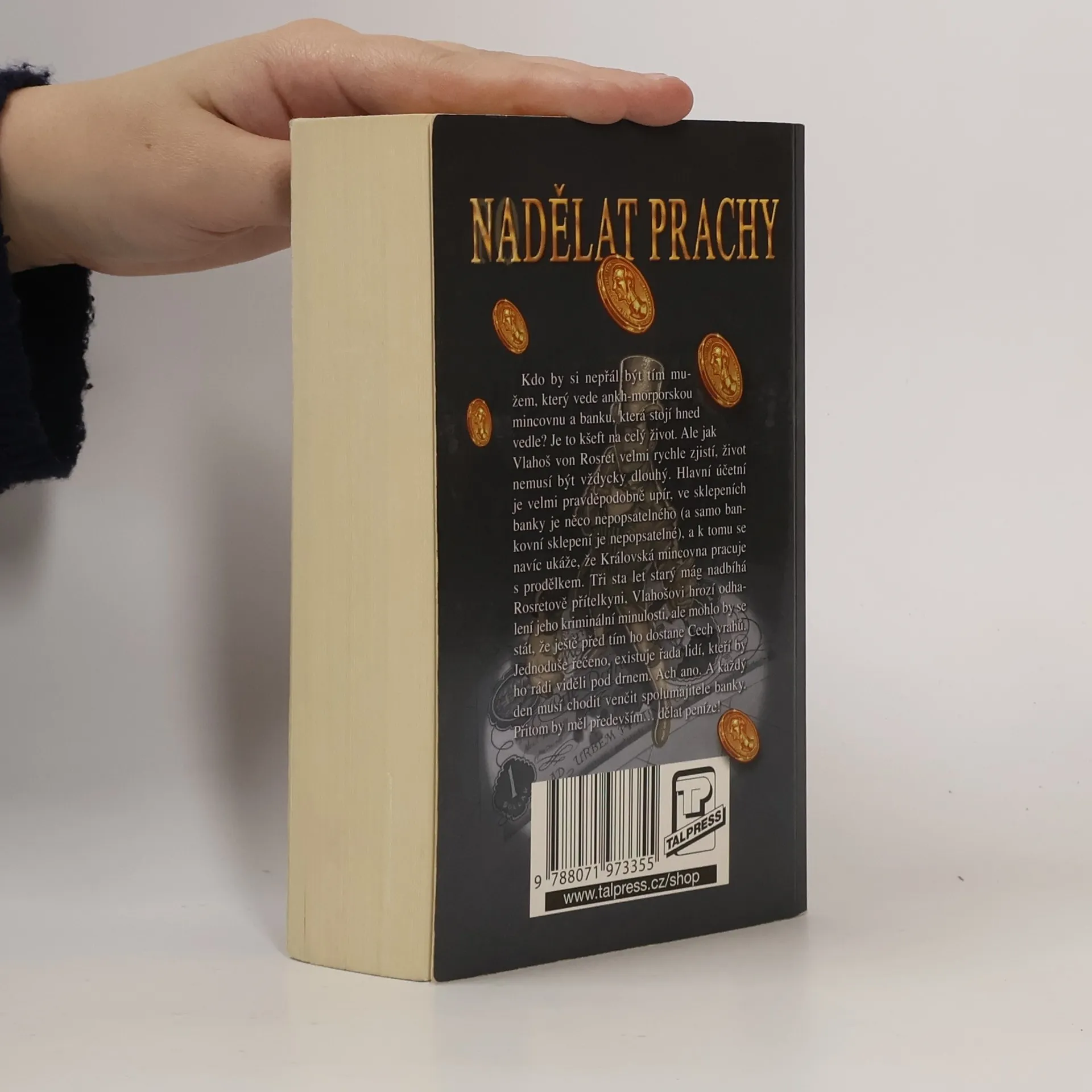 Kdo by si nepřál být tím mužem, který vede ankh-morporskou mincovnu a banku, která stojí hned vedle? Je to kšeft na celý život. Ale jak Vlahoš von Rosret velmi rychle zjistí, život nemusí být vždycky dlouhý. Hlavní účetní je velmi pravděpodobně upír, ve sklepeních banky je něco nepopsatelného (a samo bankovní sklepení je nepopsatelné), a k tomu navíc se ukáže, že Královská mincovna pracuje s prodělkem. Tři sta let starý mág nadbíhá Rosretově přítelkyni, Vlahošovi hrozí odhalení jeho kriminální minulosti, ale mohlo by se stát, že ještě před tím ho dostane Cech vrahů. Jednoduše řečeno, existuje řada lidí, kteří by ho rádi viděli pod drnem. Ach ano. A každý den musí chodit venčit spolumajitele banky. Přitom by měl především... dělat peníze! Úžasná Zeměplocha, kniha 32., přeložil Jan Kantůrek.