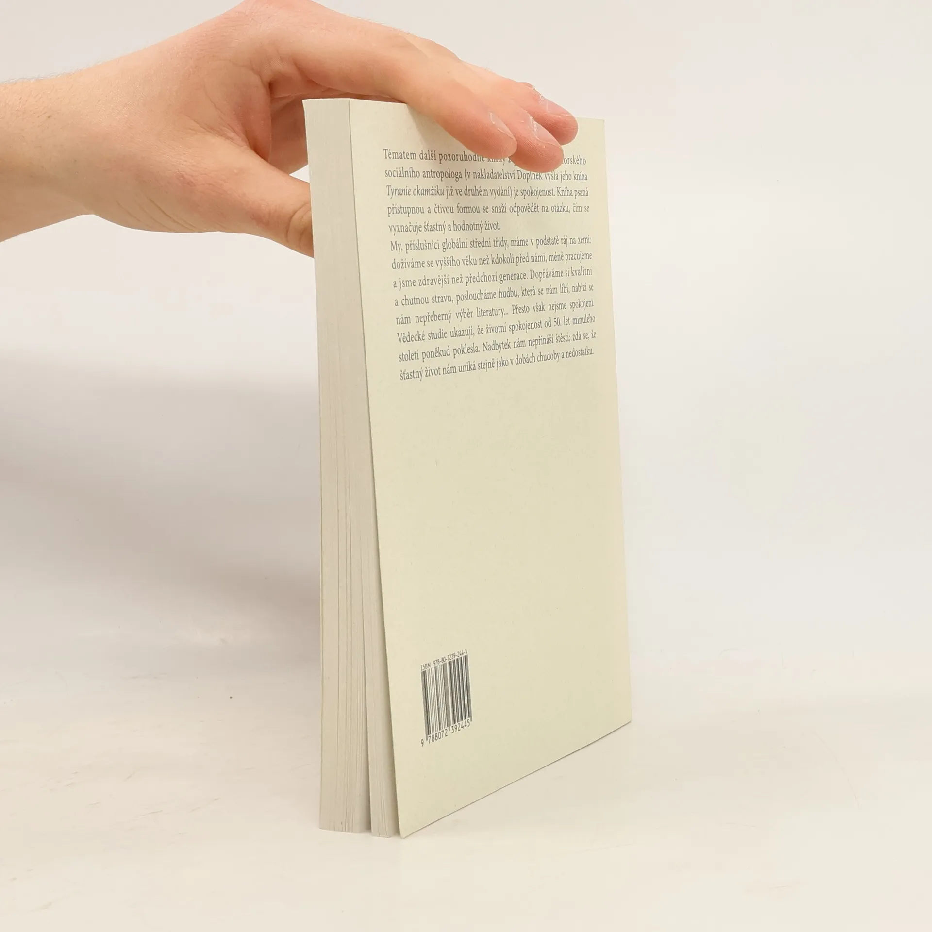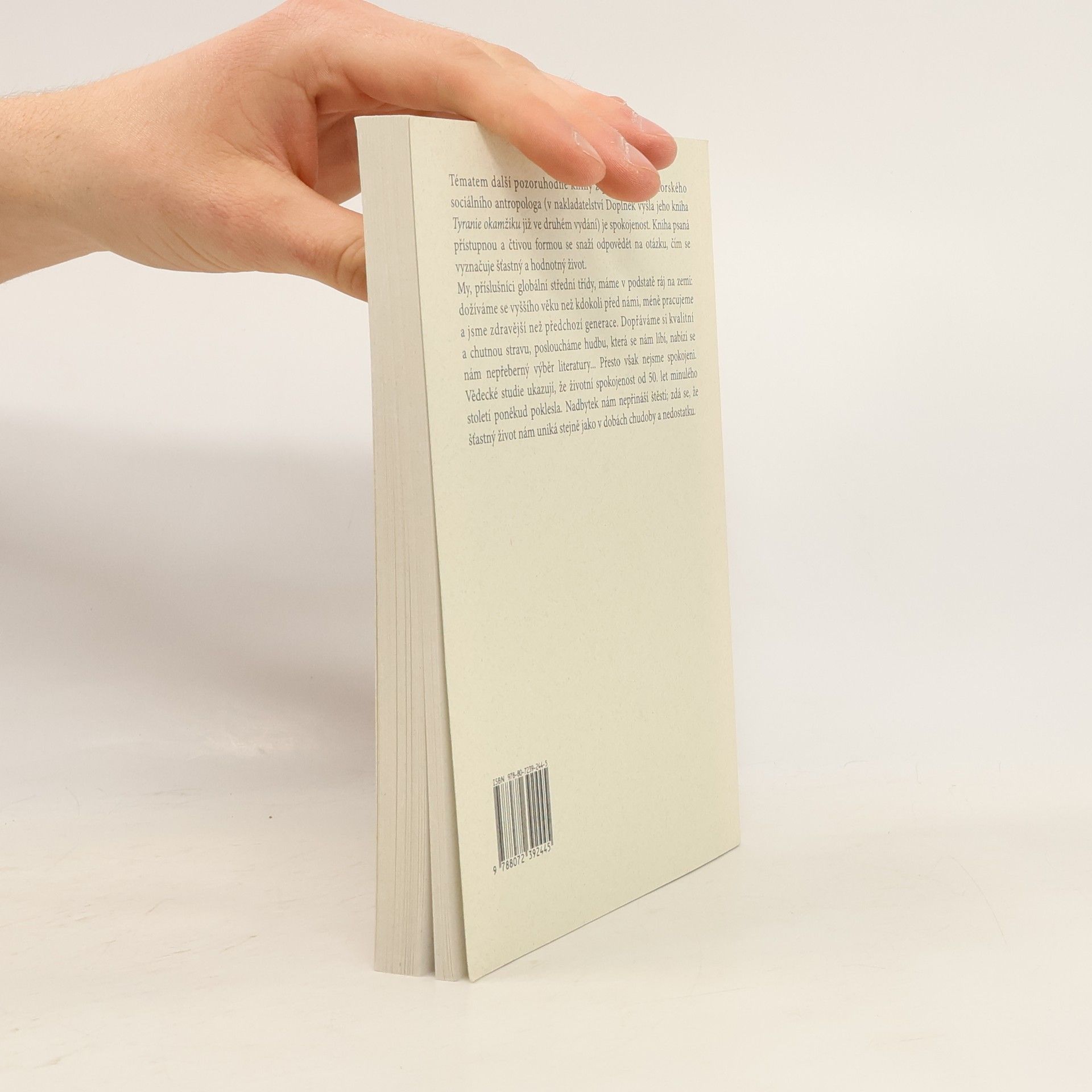 Tématem další pozoruhodné knihy z pera známého norského sociálního antropologa (v Doplňku již vyšla jeho kniha Tyranie okamžiku) je spokojenost. Kniha psaná přístupnou a čtivou formou se snaží odpovědět na otázku, čím se vyznačuje šťastný a hodnotný život. My, příslušníci globální střední třídy, máme v podstatě ráj na zemi: dožíváme se vyššího věku než kdokoli před námi, méně pracujeme a jsme zdravější než předchozí generace. Dopřáváme si kvalitní a chutnou stravu, posloucháme hudbu, která se nám líbí, nabízí se nám nepřeberný výběr literatury… Přesto však nejsme spokojeni. Vědecké studie ukazují, že životní spokojenost od 50. let minulého století poněkud poklesla. Nadbytek nám nepřináší štěstí. Zdá se, že šťastný život nám uniká stejně jako v dobách chudoby a nedostatku.
