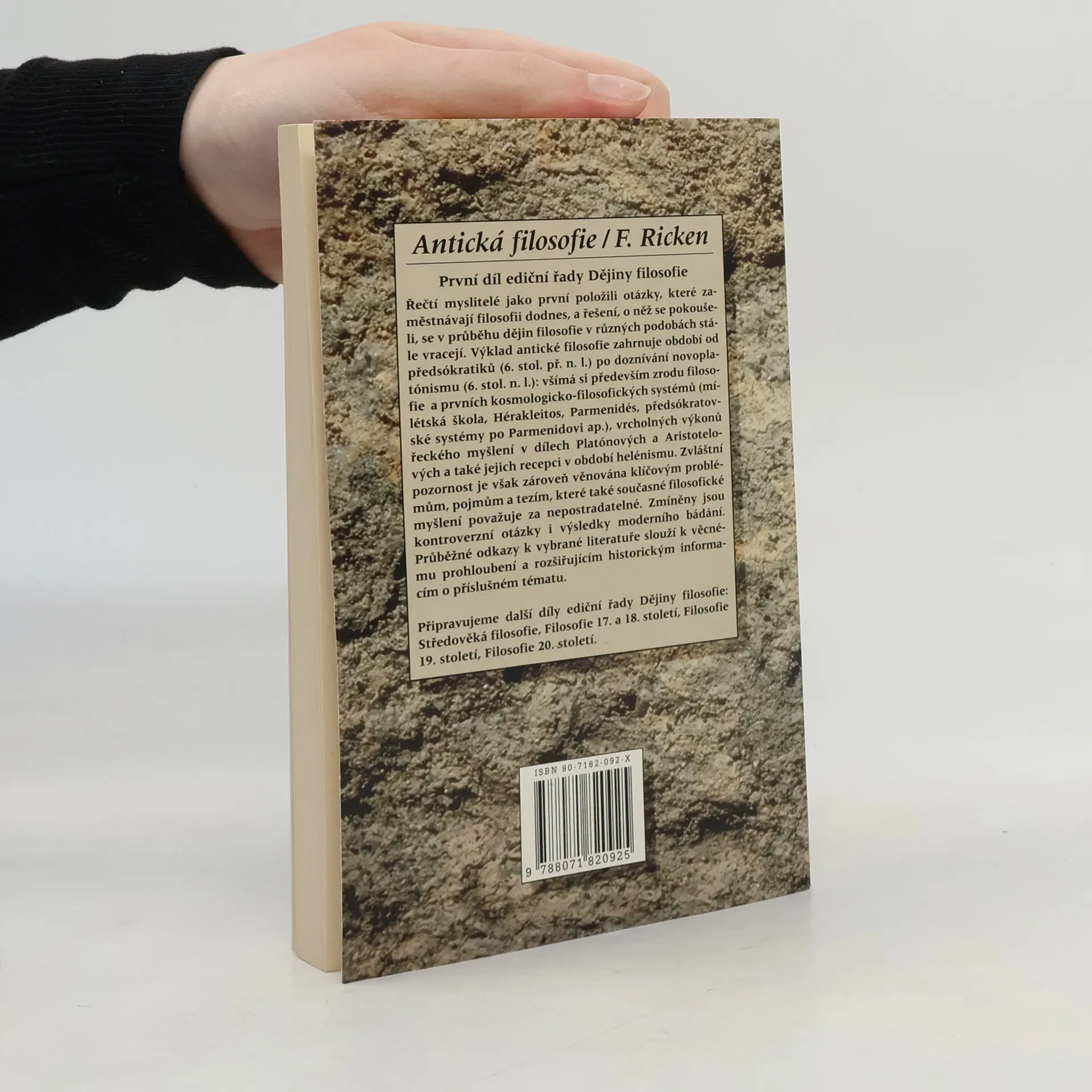 Řečtí myslitelé jako první položili otázky které zaměstnávají filosofii dodnes a řešení o něž se pokoušeli se v průběhu dějin filosofie v různých podobách stále vracejí. Výklad antické filosofie zahrnuje období od předsókratiků (6. stol. př. n. l.) po doznívání novoplatónizmu (6. stol. n. l.): všímá si především zrodu filosofie a prvních kosmologicko-filosofických systémů (mílétská škola Hérakleitos Parmenidés předsókratovské systémy po Parmenidovi ap.) vrcholných výkonů řeckého myšlení v dílech Platónových a Aristotelových a také jejich recepci v období helénizmu. Zvláštní pozornost je však zároveň věnována klíčovým problémům pojmům a tezím které také současné filosofické myšlení považuje za nepostradatelné. Zmíněny jsou kontroverzní otázky i výsledky moderního bádání. Průběžné odkazy k vybrané literatuře slouží k věcnému prohloubení a rozšiřujícím historickým informacím o příslušném tématu. 1. vydání.