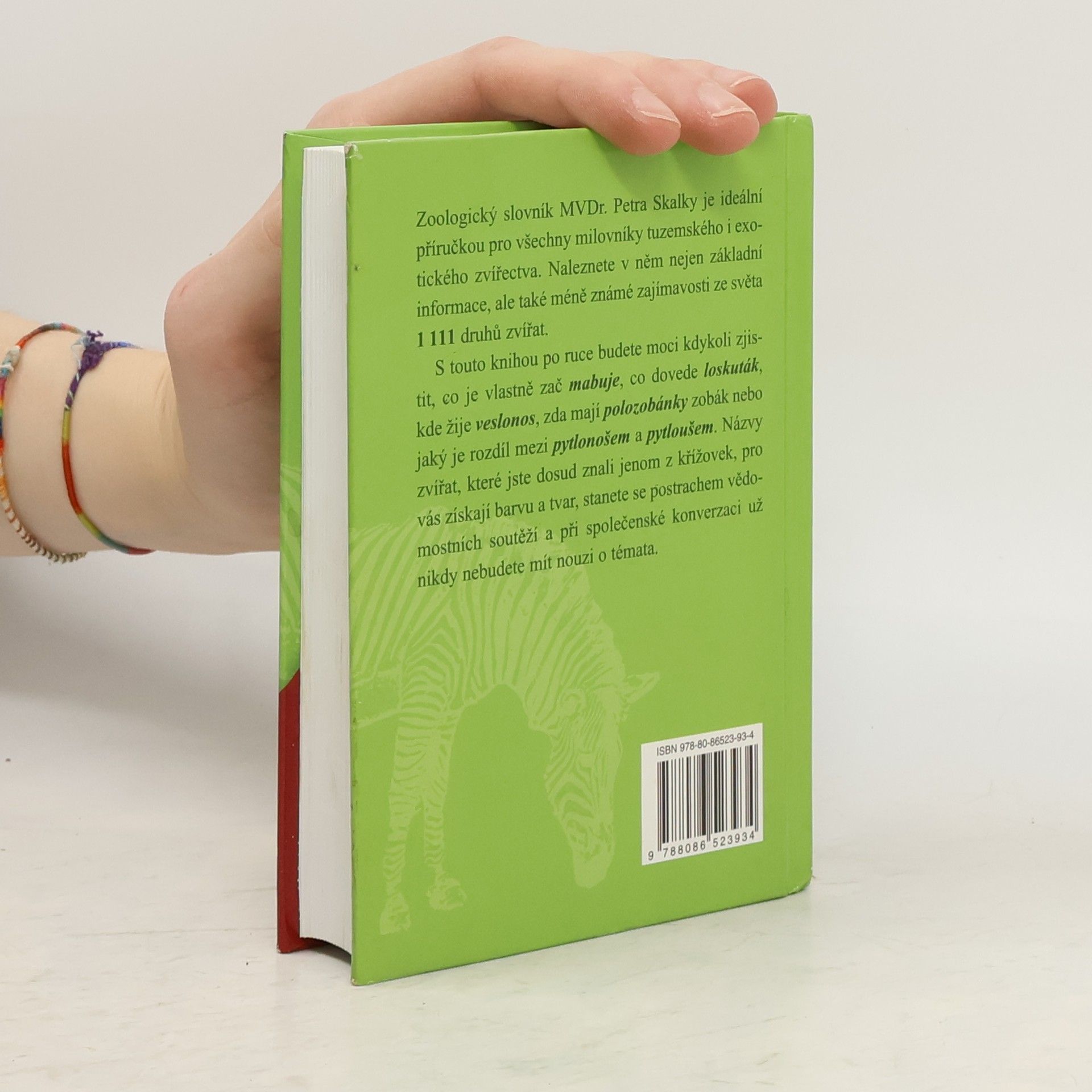 1111 hesel z živočišné říše. Zoologický slovník MVDr. Petra Skalky je ideální příručkou pro všechny milovníky tuzemského i exotického zvířectva. Naleznete v něm nejen základní informace, ale také méně známé zajímavosti ze světa 1111 vybraných druhů zvířat.S touto knihou po ruce budete moct kdykoli zjistit, co je vlastně zač mabuje, co dovede loskuták, kde žije veslonos, zda mají polozobánky zobák nebo jaký je rozdíl mezi pytlonošem a pytloušem. Suché názvy zvířat, které jste dosud znali jenom z křížovek, pro vás získají barvu a tvar, stanete se postrachem vědomostních soutěží a při společenské konverzaci už nikdy nebudete mít nouzi o témata.
