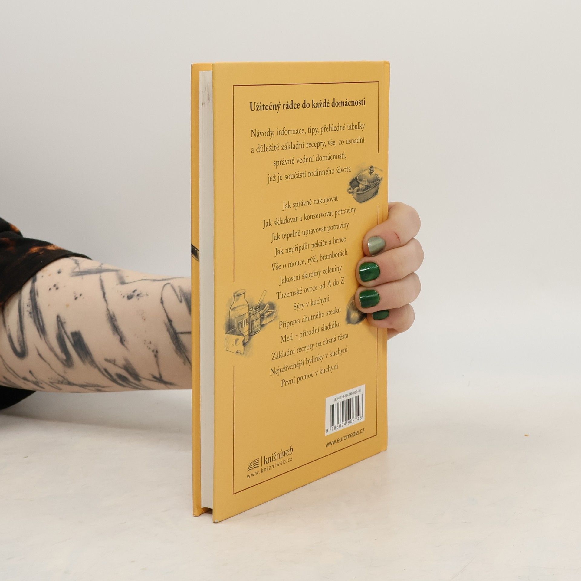 Užitečný rádce do každé domácnosti. Návody, informace, tipy, přehledné tabulky a důležité základní recepty, které usnadní správné vedení domácnosti, jež je součástí rodinného života. Jak správně nakupovat * Jak skladovat a konzervovat potraviny * Jak tepelně upravovat potraviny * Jak nepřipálit pekáče a hrnce * Vše o mouce, rýži, bramborách * Jakostní skupiny zeleniny * Tuzemské ovoce od A do Z * Sýry v kuchyni * Příprava chutného steaku * Med - přírodní sladidlo * Základní recepty na různá těsta * Nejužívanější bylinky v kuchyni * První pomoc v kuchyni od A do Z