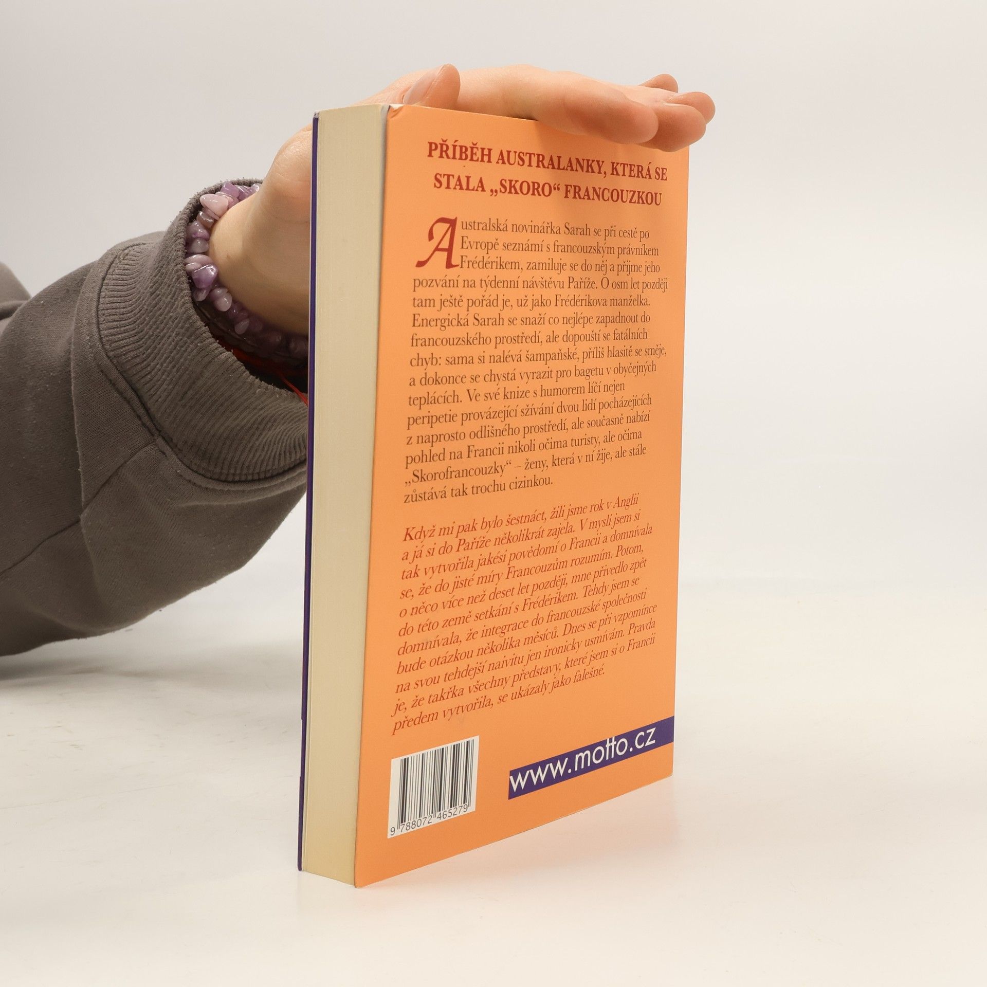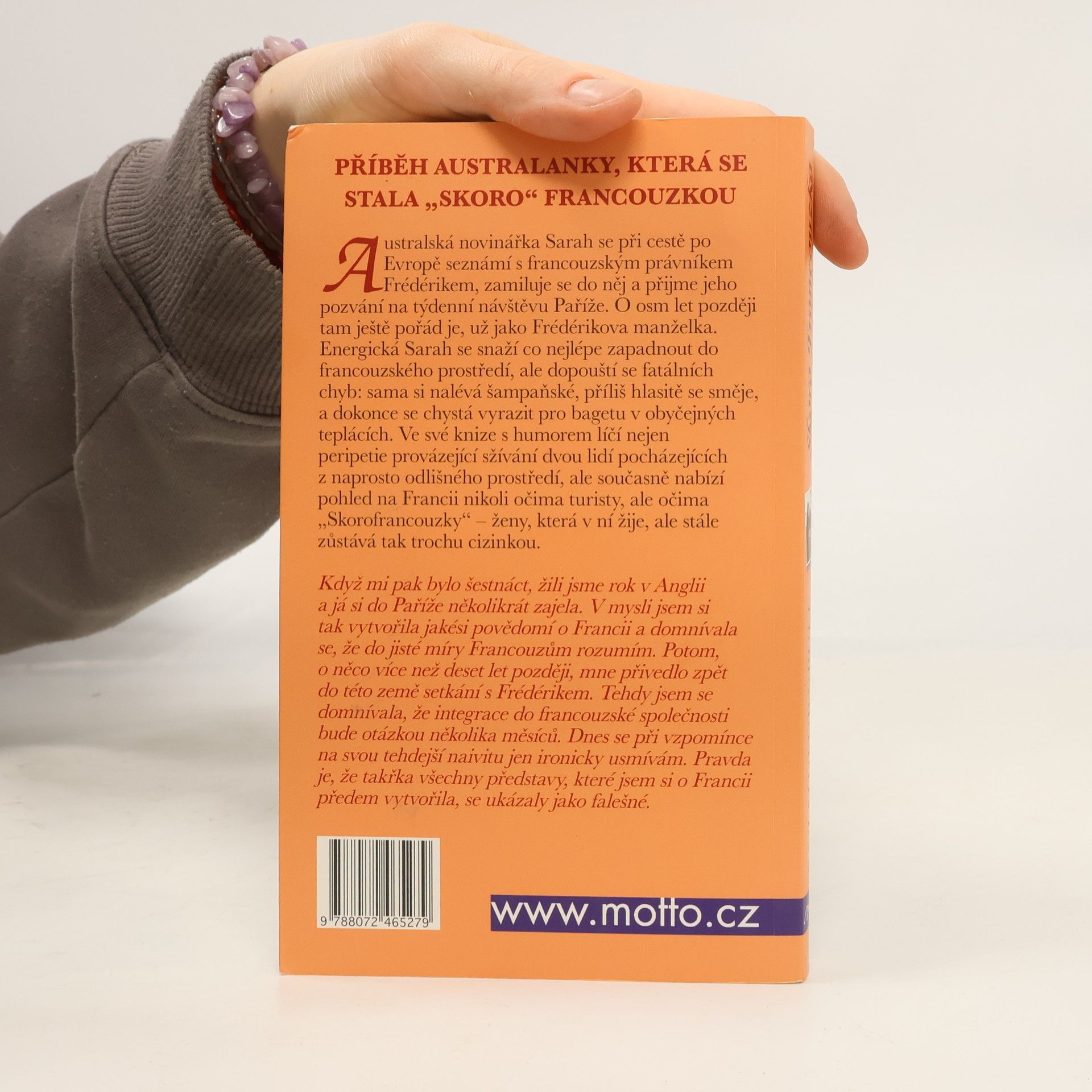 Příběh Australanky, která se stala „skoro“ Francouzkou. Australská novinářka Sarah se při cestě po Evropě seznámí s francouzským právníkem Frédérikem, zamiluje se do něj a přijme jeho pozvání na týdenní návštěvu Paříže. O osm let později tam ještě pořád je, už jako Frédérikova manželka. Energická Sarah se snaží co nejlépe zapadnout do francouzského prostředí, ale dopouští se fatálních chyb: sama si nalévá šampaňské, příliš hlasitě se směje, a dokonce se chystá vyrazit pro bagetu v obyčejných teplácích. Ve své knize s humorem líčí nejen peripetie provázející sžívání dvou lidí pocházejících z naprosto odlišného prostředí, ale současně nabízí pohled na Francii nikoli očima turisty, ale očima „Skorofrancouzky“ – ženy, která v ní žije, ale stále zůstává tak trochu cizinkou.
