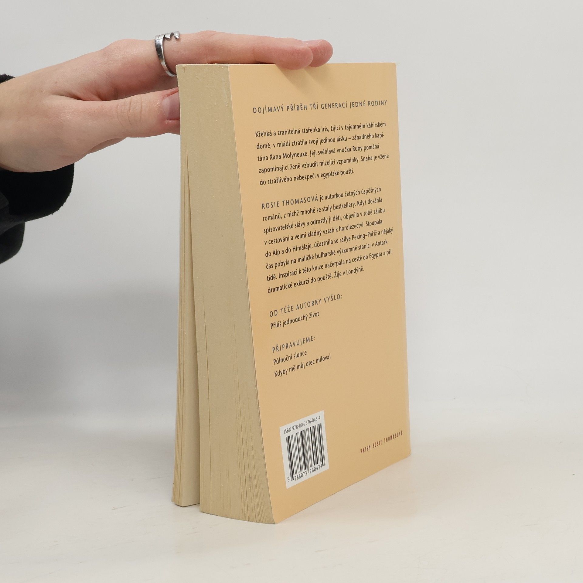Vzrušující a vysoce dojímavý příběh, ve kterém se mísí láska, ztráta a vzdálenost mezi třemi generacemi jedné rodiny. Dvaaosmdesátiletá Iris, křehká, zapomnětlivá a zranitelná, je odkázána na péči svého služebníka Mamdooha. Do jejího zadušeného a klaustrofobii budícího starého domu v Káhiře neočekávaně vtrhne její problematická a svéhlavá vnučka Ruby. Poměry v rodině ji přiměly utéci z Anglie a hledat útěchu u své babičky, kterou už mnoho let neviděla. Mezi oběma ženami vzniká až nečekané pouto. Ruby Iris pomáhá zachytit mizející vzpomínky na třpytné kosmopolitní město, jakým byla Káhira za druhé světové války, kdy Iris potkala svoji jedinou skutečnou lásku - záhadného kapitána Xana Molyneuxe - a poté ho ztratila ve válečné vřavě. Pohroma, která tak záhy stihla Irisino srdce, ovlivnila život nejen jí, ale i její dceři a vnučce. Potřeba odkrýt Irisinu minulost a vybudovat Rubyině přítomnosti pevné základy dožene dvě ženy do strašlivého nebezpečí v egyptské poušti.