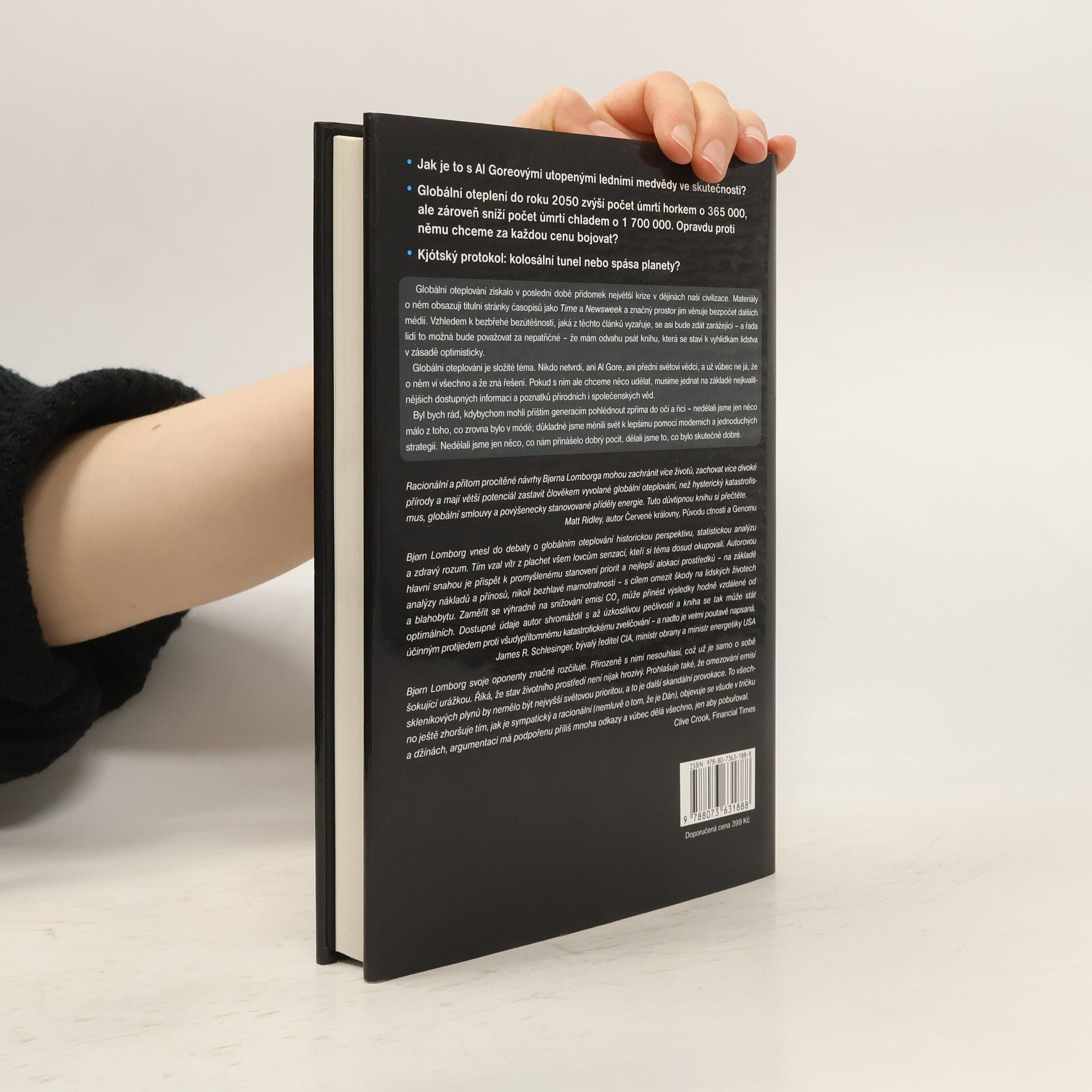 Skeptický ekolog o globálním oteplování. První kniha dánského statistika Bjørna Lomborga nás provádí po problematice globálního oteplování úplně jinak než ostatní práce. Lomborg není "klimatický skeptik" v tom smyslu, že by odmítal převládající názory na oteplování v důsledku lidské aktivity. Nezpochybňuje ani to, že globální oteplování bude mít ve svém souhrnu nakonec pro lidi, životní prostředí i ekonomiku negativní následky. Velkou skepsi však projevuje vůči všeobecně navrhovaným způsobům řešení v čele s Kjótským protokolem. Ukazuje, že objektivně doložitelným škodám oteplování lze snadno zabránit cílenými, rychlými a především relativně levnými zásahy. Tyto praktické kroky by přitom již za krátkou dobu pomohly nepoměrně více lidem a přinesly by světu daleko větší prospěch než nesmyslně drahé omezování emisí skleníkových plynů, které navíc stejně ničemu nepomůže. (Dokořán)
