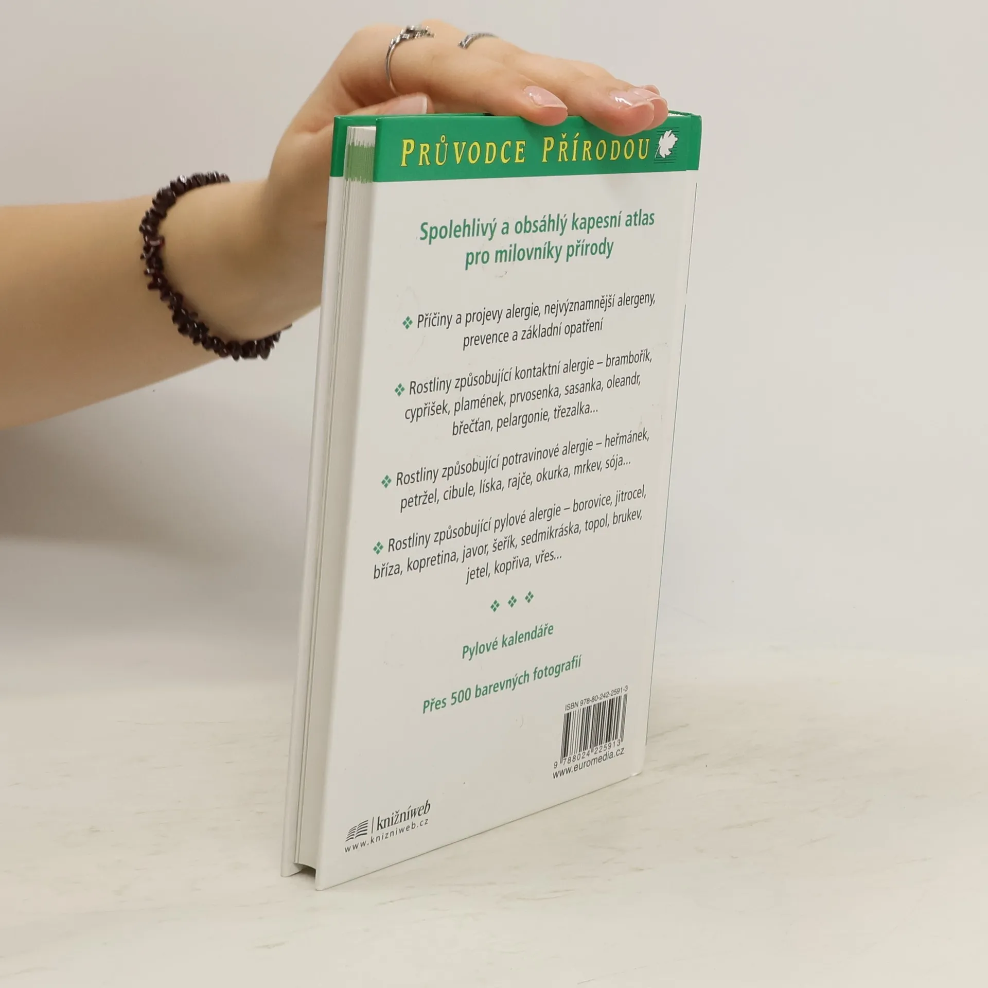 Spolehlivý a obsáhlý kapesní atlas pro milovníky přírody - Příčiny a projevy alergie, nejvýznamnější alergeny, prevence a základní opatření - Rostliny způsobující kontaktní alergie - brambořík, cypřišek, plamének, prvosenka, sasanka, oleandr, břečťan, pelargonie, třezalka... - Rostliny způsobující potravinové alergie - heřmánek, petržel, cibule, líska, rajče, okurka, mrkev, sója... - Rostliny způsobující pylové alergie - borovice, jitrocel, bříza, kopretina, javor, šeřík, sedmikráska, topol, brukev, jetel, kopřiva, vřes... Pylové kalendáře Přes 500 barevných fotografií