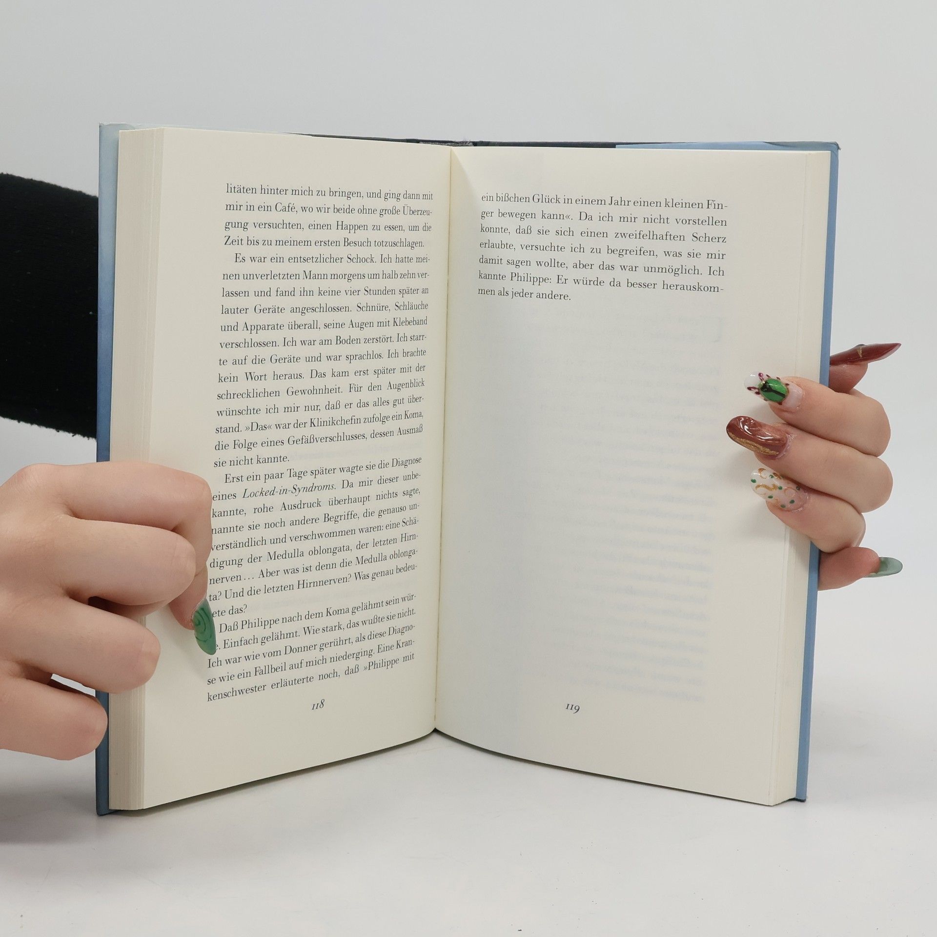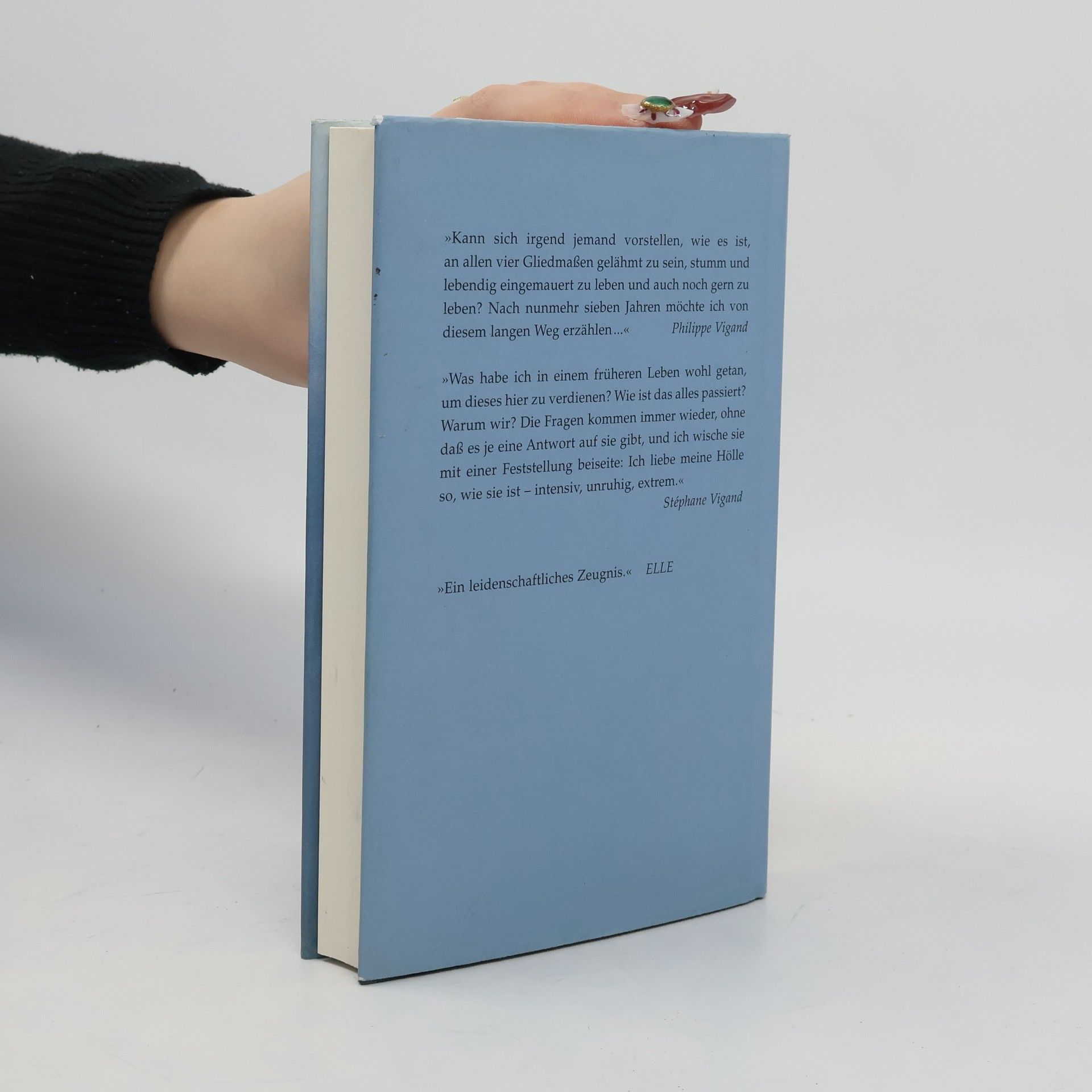 Nach einem Zusammenbruch und 2 Monaten Koma muß sich der 33jährige Philippe Vigand, Opfer des Locked-in-Syndroms, damit abfinden, als Gelähmter in völliger Abhängigkeit weiterzuleben. Mit Hilfe eines Sprachcodes kommuniziert er durch Augenzwinkern, später hilft ein Computer. Nach 2jähriger stationärer Pflege wird er zuhause von seiner Frau und verschiedenen, z.T. treuen Pflegekräften versorgt. Schonungslos offen schildert Stephane Vigand den schwierigen Alltag mit einem behinderten Mann, die Überlastung durch Pflege, Beruf und 3 Kinder. Besonders beeindruckend an dieser bewegenden Lebens-, Liebes- und Leidensgeschichte: Der tiefe Respekt des Ehepaares voreinander. Neben I.-D. Bauby: 'Schmetterling und Taucherglocke' (BA 10/97). (2).