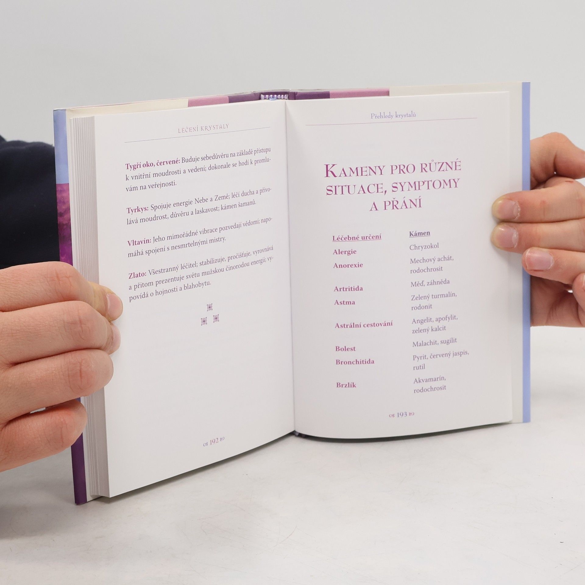 S podtitulem: Jak se vyléčit a jak dodat svému životu energii pomocí krystalů. Praktický průvodce léčením s pomocí 94 drahých kamenů, ilustrovaný krásnými barevnými fotografiemi každé rodiny krystalů. Kniha je vhodná pro začátečníky i pro zkušené praktiky a soustředí se na krystaly, které jsou snadno dostupné. Dozvíte se, který krystal použít na konkrétní zdravotní nebo životní problém, dostane se vám jasného vysvětlení pojmů týkajících se krystalů (jako například fantom a uchovavatel záznamů), zjistíte, jak si vybrat krystal, který byl vytěžen šetrným způsobem, a přečtete si fascinující poselství získané channelingem od samotných kamenů. Autorky pojednávají o tom, jak krystaly působí spolu s anděly a archanděly, a popisují, jak rozmístit konkrétní kameny ve vašem domově, a vybudovat tak energetické sítě, jež prospívají hojnosti, milostnému životu, dobrému spánku, ochraně a dalším záležitostem.