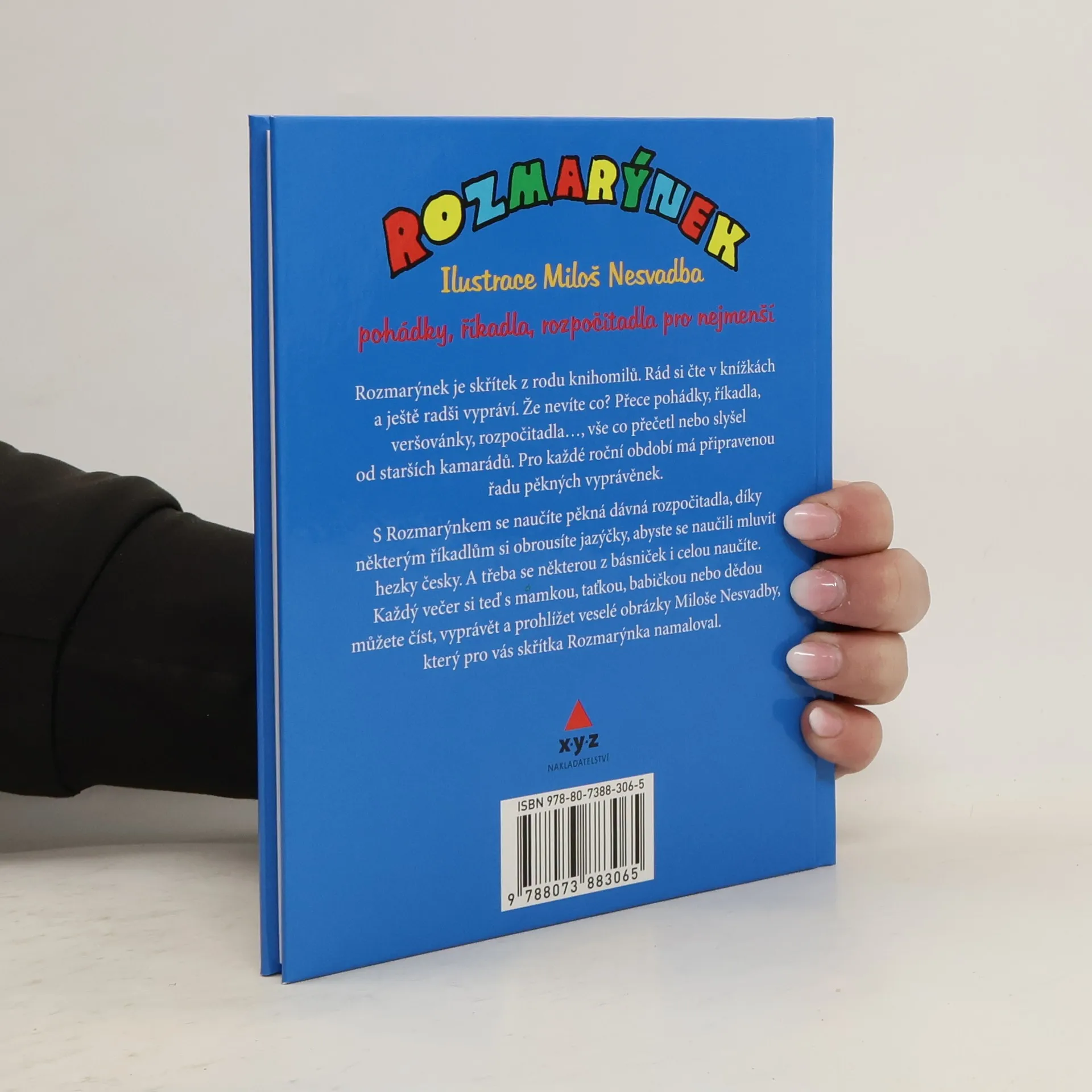 Pohádky, říkadla, rozpočitadla pro nejmenší čtenáře i jejich rodiče. Rozmarýnek je malý, neposedný skřítek, který dětem přináší veselé pohádky, svižná rozpočitadla a spoustu říkanek a veselých básniček. Je i pomocníčkem rodičů, kteří nějaký ten verš třeba už pozapomněli a ne a ne si vzpomenout. Co on vám už přečetl pohádek a bájí. Nevěřili byste, kolik básniček, říkánek, rozpočitadel a hádanek tenhle malý klučina zná. Protože není lakomý, tak se s vámi o některé příběhy podělí. Bude vám vyprávět pohádky dlouhé i docela kraťoulinké, připomene polozapomenuté básničky a naučí i řadu veselých rozpočitadel. To abyste na jaře, až si budete s ostatními dětmi hrát venku třeba na babu, se rychle dozvěděli, kdo půjde pikat. Rozmarýnek – kamarád – pohádky vypráví rád! S nimi také básničky, pro kluky i holčičky. Máma, táta, děda, babi s Rozmarýnkem ví si rady! Knížku jenom otevřou – a už jenom čtou a čtou…