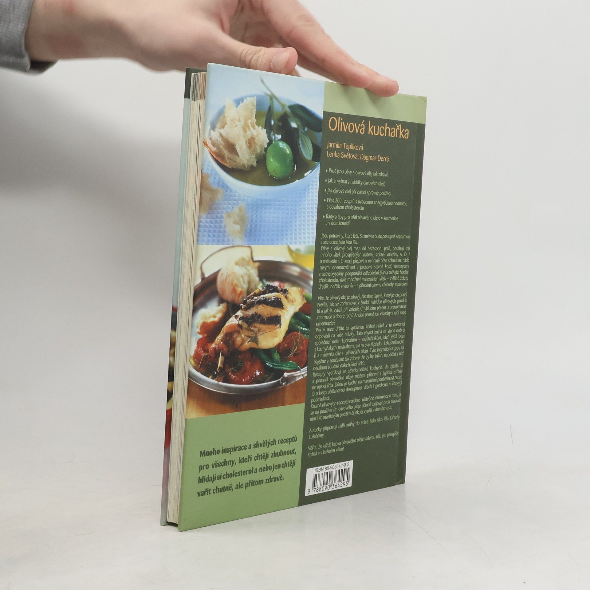 Olivová kuchařka seznamuje čtenáře s potravinami, které mají pozitivní vliv na naše zdraví. Olivy a olivový olej obsahují mnoho látek prospěšných našemu zdraví: vitaminy A, D, K a antioxidant E, který přispívá k ochraně před stárnutím, nádorovými onemocněními a prospívá stavbě kostí, nenasycené mastné kyseliny, podporující vstřebávání živin a snižující hladinu cholesterolu. Všichni víme, že olivy a olivový olej je zdravý, málokdo ale ví, jak jejich potenciálu co nejlépe využít. Olivy a olivové oleje nabízí nepřeberné možnosti využití nejen v kuchyni, ale i v kosmetice. V knize Olivová kuchařka najdete mnoho receptů, praktických informací, a především rady a tipy. Autorky Jarmila Teplíková, Lenka Světová, Dagmar Derré vám poradí jak si vybrat olivový olej, jak s ním vařit, smažit, péct. Recepty vycházejí ze středomořské kuchyně, ale zjistíte, že s pomocí olivového oleje můžete připravit i typická středoevropská jídla. Důraz je kladen na maximální použitelnost receptů a dostupnost ingrediencí v českých podmínkách. Recepty mají spočítánu energetickou hodnotu a obsah cholesterolu. Zajímavá je také kapitola o tom, jak s pomocí olivového oleje účinně bojovat proti zdravotním potížím a jak jej využít v kosmetice a domácnosti. Jak používat olivový olej, výrobky z oliv nejen v kuchyni, ale i v kosmetice, a především rady a tipy, jak potencionálu oliv co nejefektivněji využít. ... celý text
