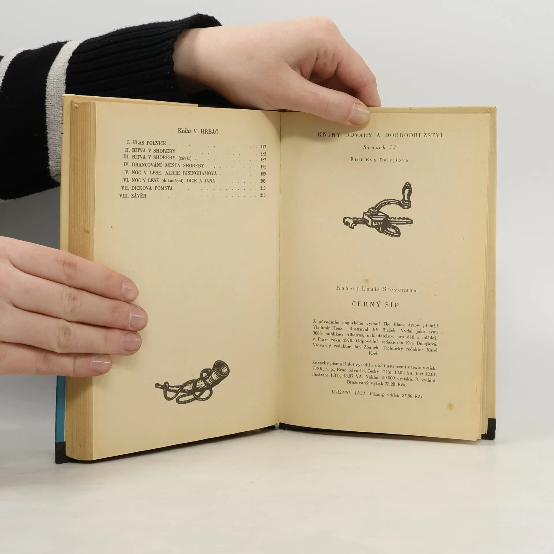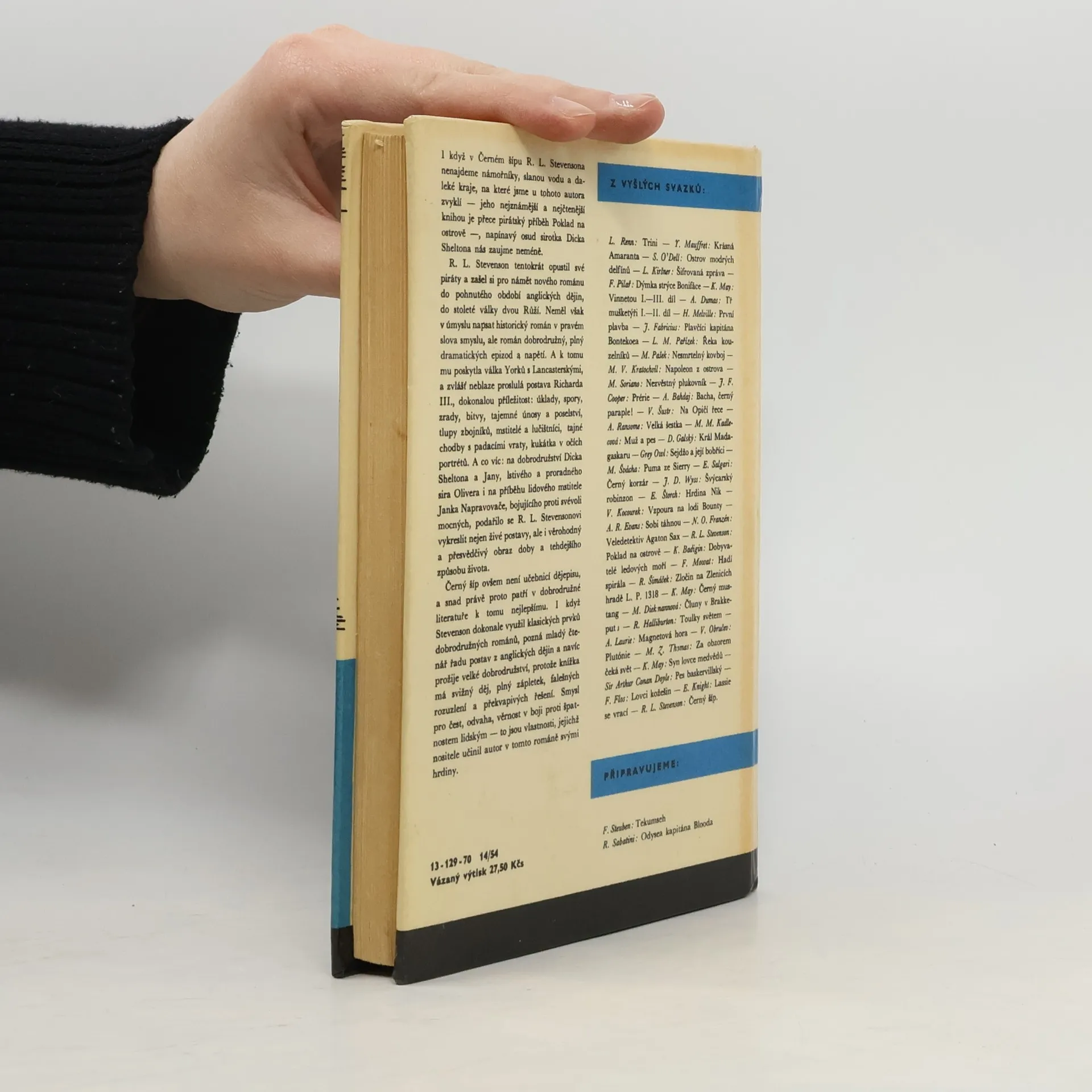 Kniha proslulého skotského spisovatele, bohéma a bouřliváka, jednoho z neslavnějších anglicky píšících autorů vůbec. V době, kdy už kdekdo znal jeho díla jako povídkový cyklus Nové příběhy tisíce a jedné noci s nesmrtelnou povídkou Klub sebevrahů nebo Podivný případ dr. Jekkyla a panaHyda, napsal historický román Černý šíp, jenž poprvé vyšel v roce 1888 a od jeho předchozí tvorby se v lecčem liší. Stevenson v něm vypráví dobrodružný příběh z války růží, a ačkoli chtěl knihou oslovit především mladé čtenáře, získal si svým Černým šípem i spoustu dospělých milovníků historické literatury. Příběh je totiž mistrovsky zasazen do dramatických časů druhé poloviny patnáctého století, kdy v Anglii zuří domácí válka. Verbují se pro ni i žoldnéři ve Francii a Švýcarech, ale o tom tahle knížka není. Vévodové z Yorku, ve znaku s rudou růží, si nárokují trůn na vládnoucí dynastii Lancasterů s růží bílou. A v oné krvavé a bezútěšné době se odehrává příběh mladého rytíře Richarda Sheltona. Snaží se u