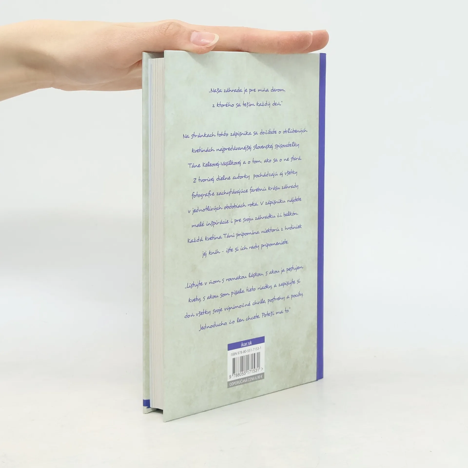 Miesto, kde sa spomalí čas. Kde sa dejú zázraky. Opojne to v nej vonia a svet zostáva bokom. Je len záhrada a ja. Šepkajúce kvety, motýle, ktoré sú trochu popletené a prelietajú z kvetinky na kvetinku, pretože by chceli sedieť naraz na všetkých. Čmeliaky popíjajúce sladký nektár. Záhrada je samostatný svet plný slobody, no aj v nej platia isté pravidlá. Je to ako so vzťahmi. Keď si človek záhradu nečičíka, nepestuje, nestará sa o ňu, časom stráca svoj pôvab. Zároveň jej treba ponechať aj určitú voľnosť, aby sa mohla rozrastať a potešiť srdce. Presne ako vo vzťahoch. Keby mi niekto v mojej tridsiatke povedal, že zo mňa bude záhradníčka, len by som sa neveriacky zasmiala. No ako plynul čas a mne pribúdali rôčky. .. Stalo sa. Na stránkach tohto zápisníka sa dočítate o mojich obľúbených kvetinkách aj o tom, ako sa o ne starám. Pripájam aj fotky, pretože na besedách sa ma na ne často pýtate. Nikdy nezabudnem na to, ako mi raz istá pani povedala, že svoju záhradu vysadila podľa jednej z mojich kníh. Aj v tomto zápisníku nájdete nejaké malé inšpirácie. Listujte v ňom s rovnakou láskou, s akou ja pestujem kvety, s akou som písala tieto riadky, a zapisujte si doň všetky svoje výnimočné chvíle, postrehy a pocity. Jednoducho, čo len chcete. Poteší ma to.