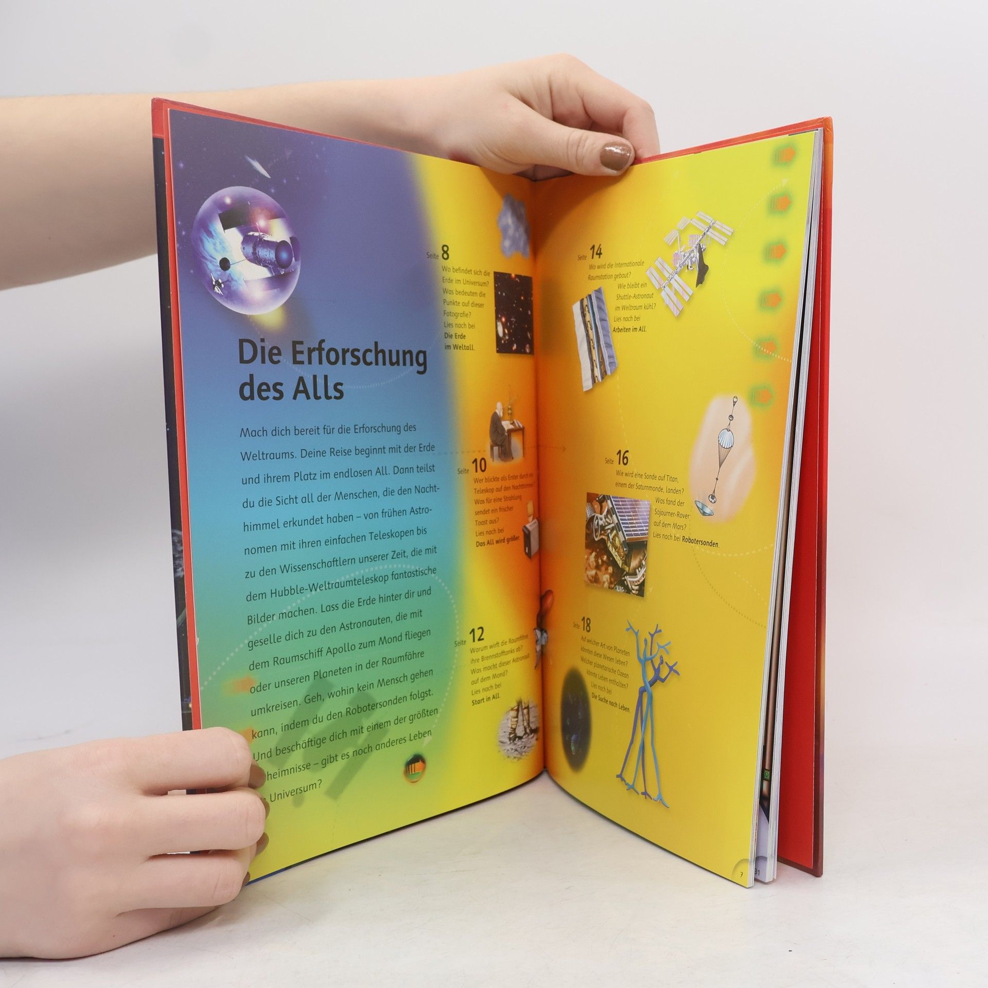 Mit vielen Bildern bietet das Buch spannende Informationen über das Weltall, Sterne und Planeten, das Sonnensystem und andere Galaxien und die Erforschung des Alls durch Spaceshuttles, Raumsonden und Satelliten.