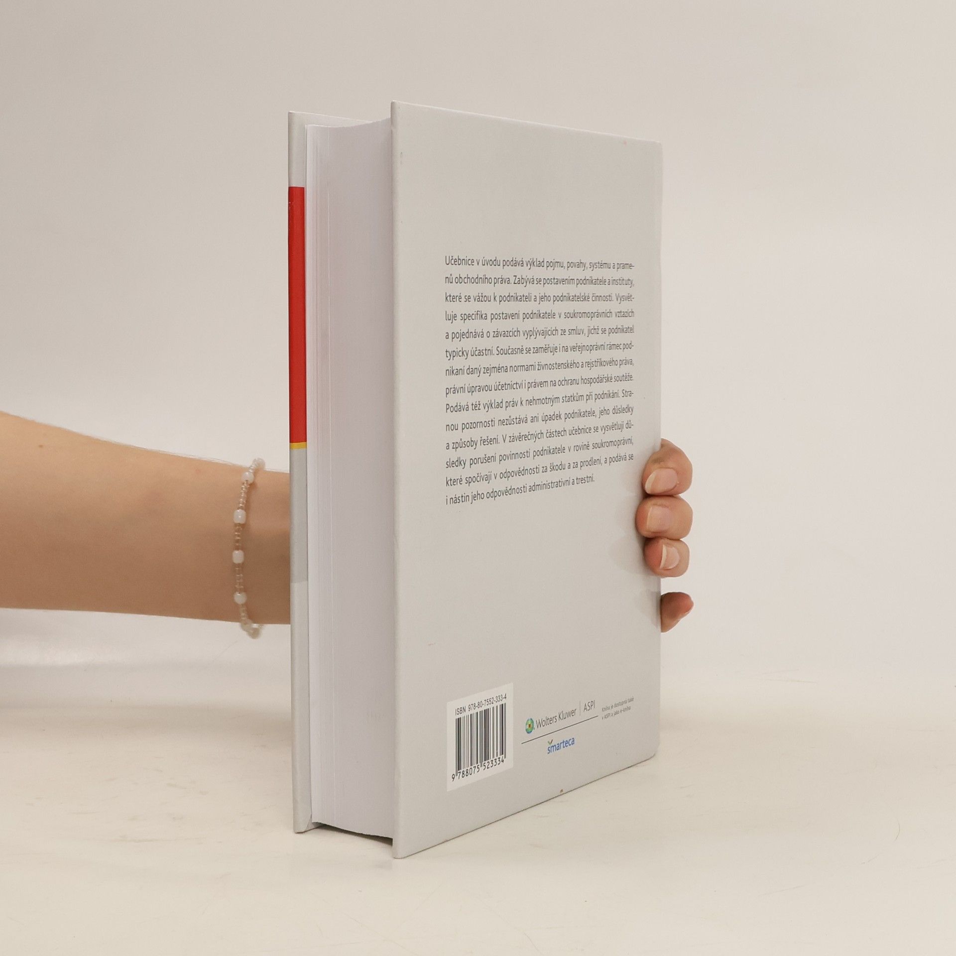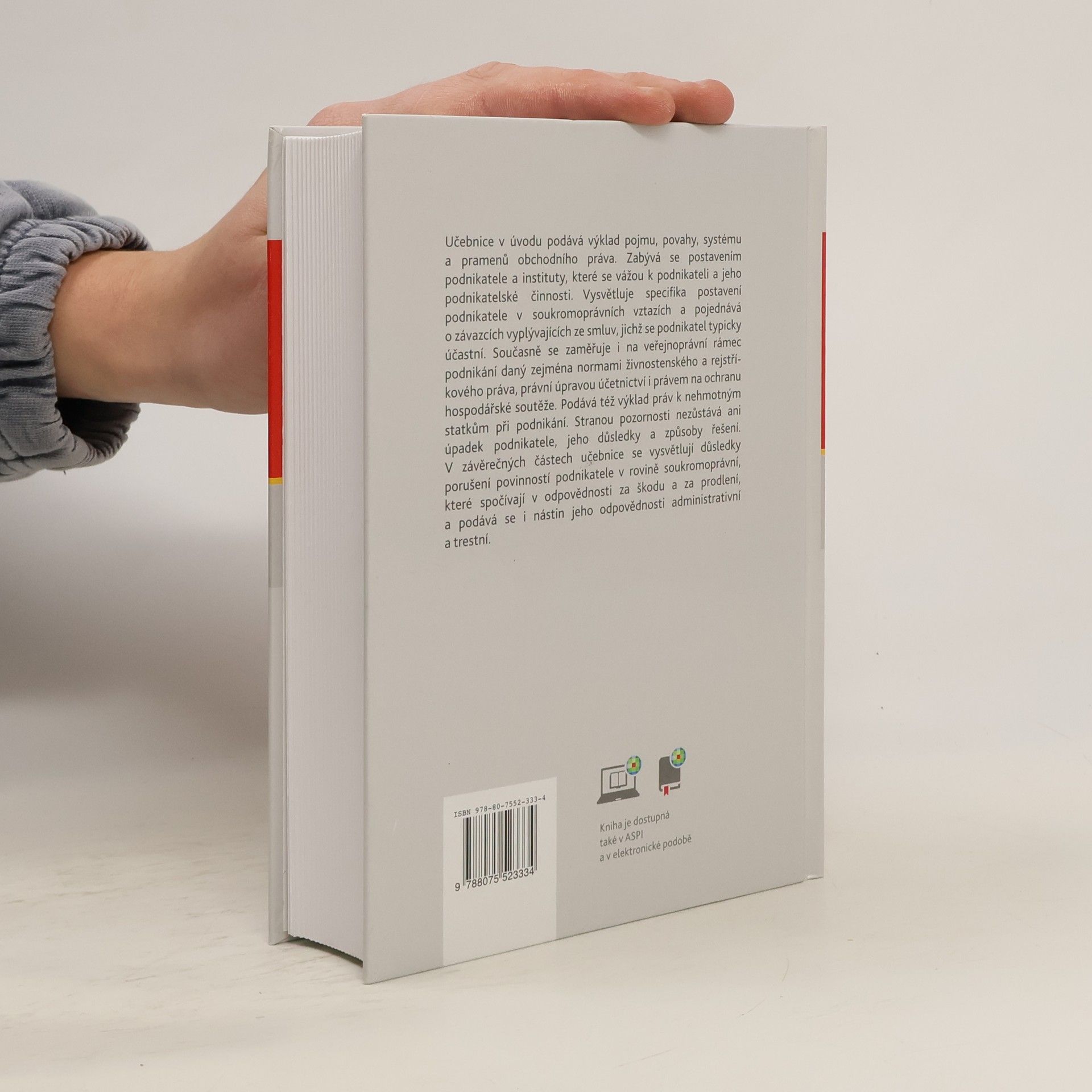 Učebnice v úvodu podává výklad pojmu, povahy, systému a pramenů obchodního práva. Zabývá se postavením podnikatele a instituty, které se vážou k podnikateli a jeho podnikatelské činnosti. Vysvětluje specifika postavení podnikatele v soukromoprávních vztazích a pojednává o závazcích vyplývajících ze smluv, jichž se podnikatel typicky účastní. Současně se zaměřuje i na veřejnoprávní rámec podnikání daný zejména normami živnostenského a rejstříkového práva, právní úpravou účetnictví i právem na ochranu hospodářské soutěže. Podává též výklad práv k nehmotným statkům při podnikání. Stranou pozornosti nezůstává ani úpadek podnikatele, jeho důsledky a způsoby řešení. V závěrečných částech učebnice se vysvětlují důsledky porušení povinností podnikatele v rovině soukromoprávní, které spočívají v odpovědnosti za škodu a za prodlení, a podává se i nástin jeho odpovědnosti administrativní a trestní.