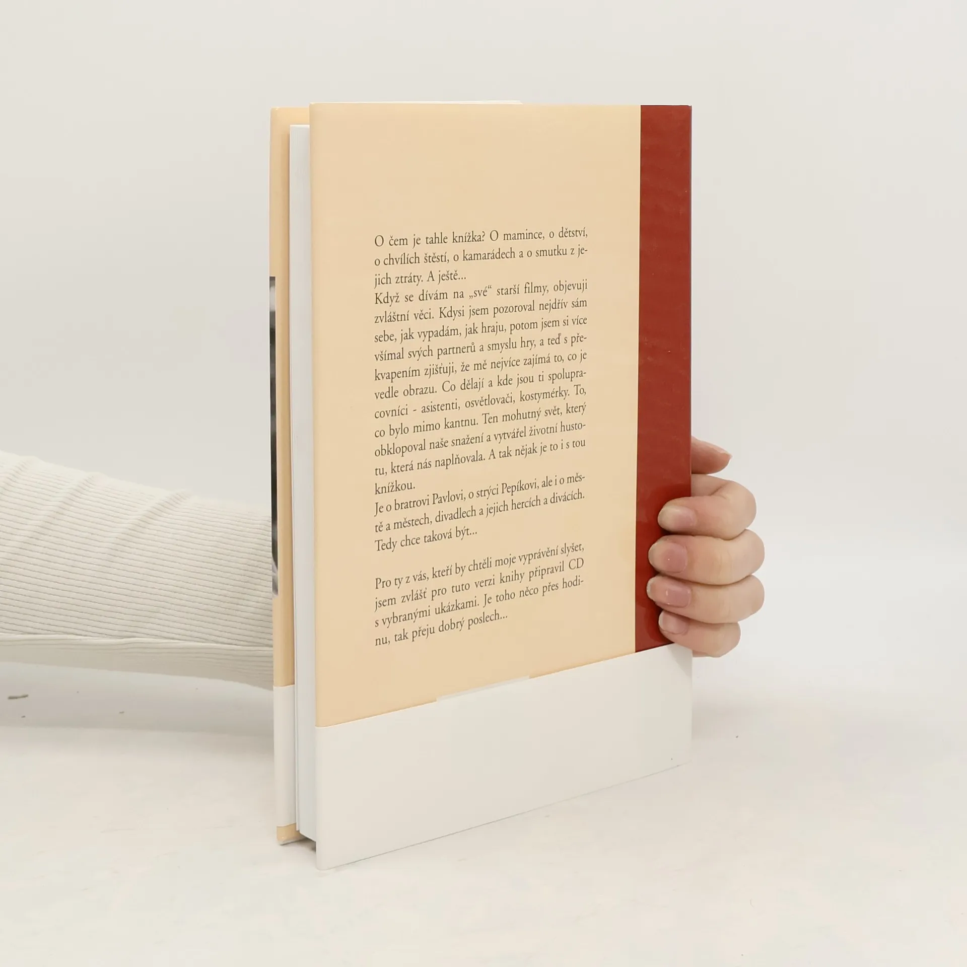 Když se dívám na \'své\' starší filmy, objevuji zvláštní věci. Kdysi jsem pozoroval nejdřív sám sebe, jak vypadám, jak hraju, potom jsem si více všímal svých partnerů a smyslu hry, a teď s překvapením zjišťuji, že mě nejvíce zajímá to, co je vedle obrazu. Co dělají a kde jsou ti spolupracovníci – asistenti, osvětlovači, kostymérky. To, co bylo mimo kantnu. Ten mohutný svět, který obklopoval naše snažení a vytvářel životní hustotu, která nás naplňovala. A tak nějak je to i s tou knížkou. Je o bratrovi Pavlovi, o strýci Pepíkovi, ale i o městě a městech, divadlech a jejich hercích a divácích. Tedy chce taková být... O čem je tato knížka, O mamince, o dětství, o chvílích štěstí, o kamarádech a o smutku z jejich ztráty.