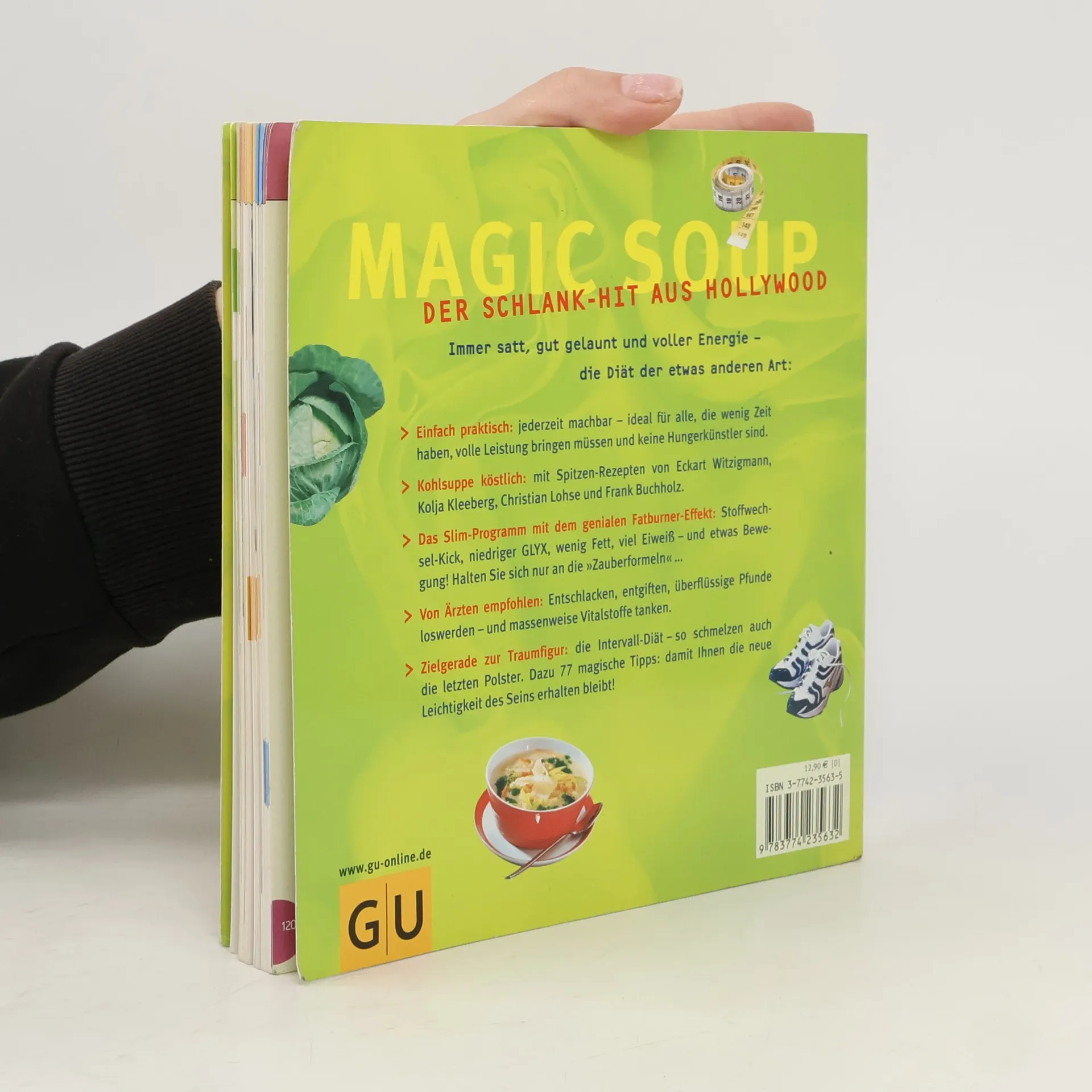 Mit Kohlsuppe lässt sich prima abnehmen. Sie ist gesund und schmeckt auch noch gut. Erfolgsautorin Marion Grillparzer erklärt in ihrem neuen Buch genau, wie die "magische Diät" funktioniert (niedriger GLYX, wenig Fett, viel Eiweiß). Die Sterneköche Witzigmann, Kleeberg, Lohse und Buchholz liefern die besten Kohlsuppenrezepte. Dazu kommen noch neue Rezepte aus aller Welt, damit einem bei der 7-Tage-Diät bestimmt nicht langweilig wird. Wer noch mehr Pfunde loswerden will, für den gibt es die ebenfalls 7 Tage dauernde Intervall-Diät, bei der abwechselnd Kohlsuppe und andere leckere Fatburner-Gerichte gegessen werden.