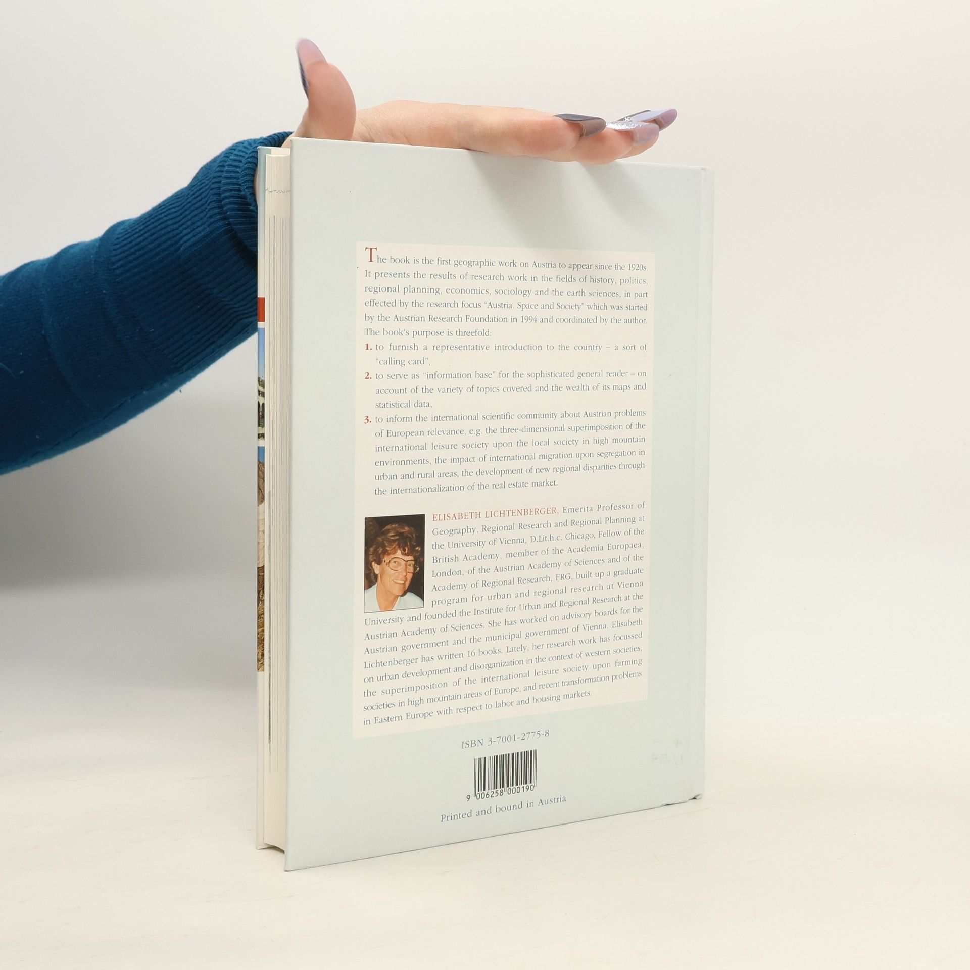 The book is the first geographic work on Austria to appear since the 1920s. It presents the results of research work in the fields of history, politics, regional planning, economics, sociology and the earth sciences, in part effected by the research focus Austria. Space and Society„ which was started by the Austrian Research Foundation in 1994 and coordinated by the author. The book´s purpose is threefold:\n1. to furnish a representative introduction to the country - a sort of a “calling card„,\n2. to serve as “information base for the sophisticated general reader - on account ot the variety of topics covered and the wealth of its maps and statistical data,\n3. to inform the international scientific community about Austrian problems of European relevance, e. g. the three-dimensional superimposition of the international leisure society upon the local society in high mountain environments, the impact of international migration upon segregation in urban and rural areas, the development of new regional disparities through the internationalization of the real estate market.