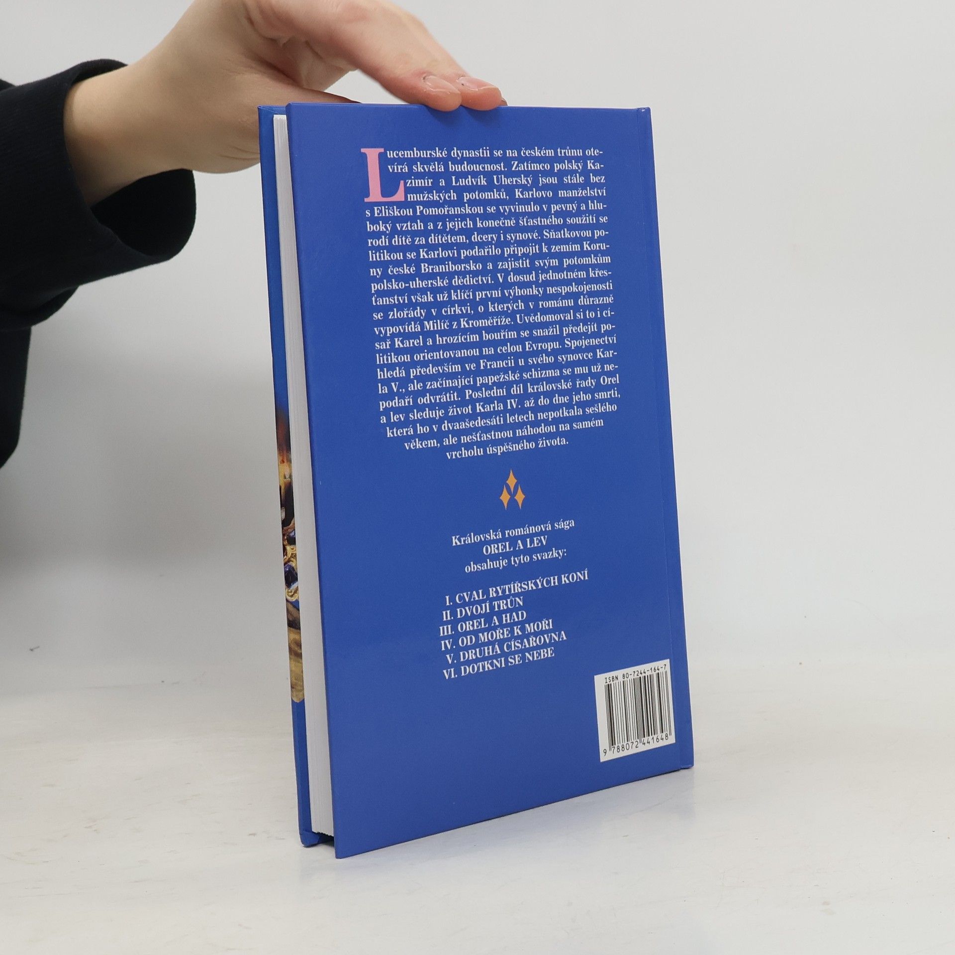Závěrečný díl šestidílné románové ságy o Karlu IV. a jeho době. Lucemburské dynastii se na českém trůnu otevírá skvělá budoucnost. Zatímco polský Kazimír a Ludvík Uherský jsou stále bez mužských potomků, z Karlova konečně šťastného manželství s Eliškou Pomořanskou se rodí dcery i synové, kterým bude patřit polsko-uherské dědictví. V dosud jednotném křesťanství však už klíčí první výhonky nespokojenosti se zlořády v církvi. Kdo se však dotknou nebe, aby poznal pravdu? Děj posledního dílu královské ságy Orel a lev pokračuje až do dne Karlovy smrti, která ho v dvaašedesáti letech nepotkala sešlého věkem, ale nešťastnou náhodou na samém vrcholu úspěšného života.