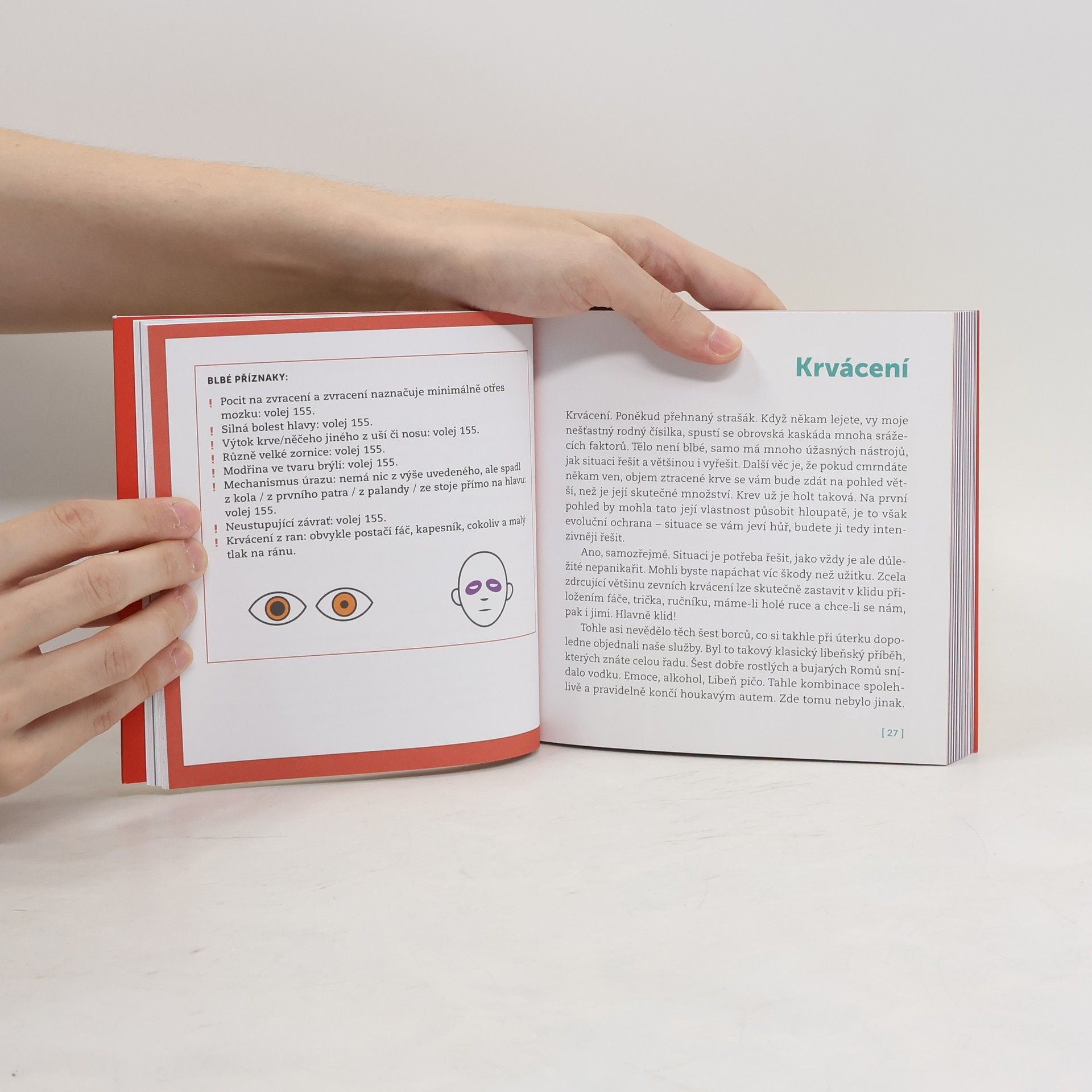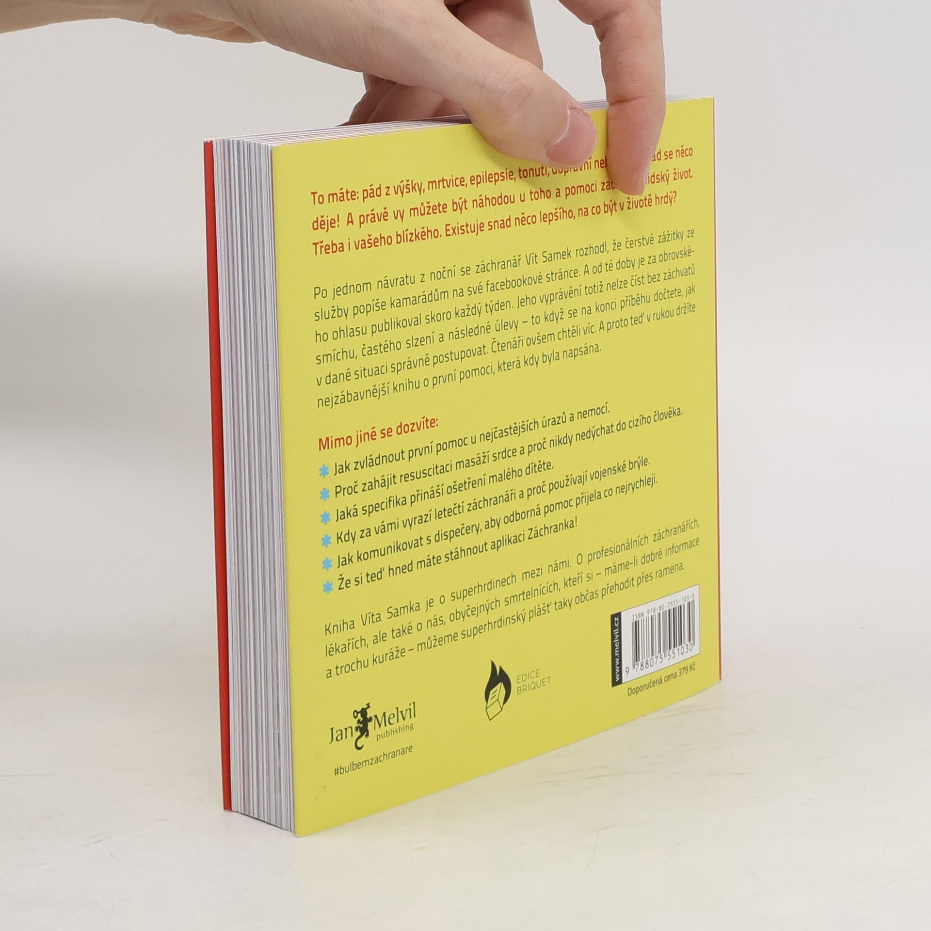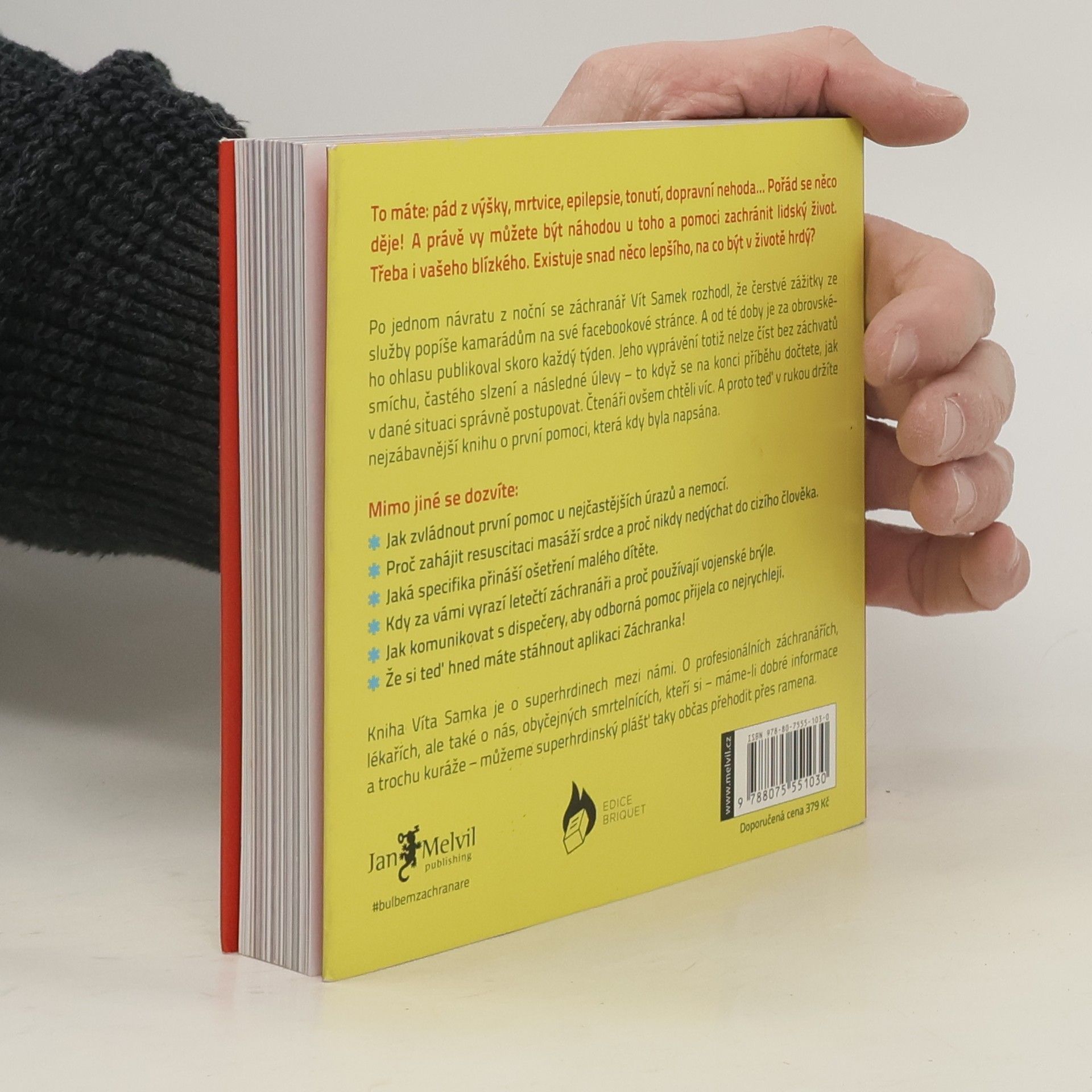 To máte: pád z výšky, mrtvice, epilepsie, tonutí, dopravní nehoda... Pořád se něco děje! A právě vy můžete být náhodou u toho a pomoci zachránit lidský život. Třeba i vašeho blízkého. Existuje snad něco lepšího, na co být v životě hrdý? Po jednom návratu z noční se záchranář Vít Samek rozhodl, že čerstvé zážitky ze služby popíše kamarádům na své facebookové stránce. A od té doby je za obrovského ohlasu publikoval skoro každý týden. Jeho vyprávění totiž nelze číst bez záchvatů smíchu, častého slzení a následné úlevy – to když se na konci příběhu dočtete, jak v dané situaci správně postupovat. Čtenáři ovšem chtěli víc. A proto teď v rukou držíte nejzábavnější knihu o první pomoci, která kdy byla napsána. Mimo jiné se dozvíte Jak zvládnout první pomoc u nejčastějších úrazů a nemocí. Proč zahájit resuscitaci masáží srdce a proč nikdy nedýchat do cizího člověka. Jaká specifika přináší ošetření malého dítěte. Kdy za vámi vyrazí letečtí záchranáři a proč používají vojenské brýle. Jak komunikovat s dispečery, aby odborná pomoc přijela co nejrychleji. Že si teď hned máte stáhnout aplikaci Záchranka! Kniha Víta Samka je o superhrdinech mezi námi. O profesionálních záchranářích, lékařích, ale také o nás, obyčejných smrtelnících, kteří si – máme-li dobré informace a trochu kuráže – můžeme superhrdinský plášť taky občas přehodit přes ramena.
