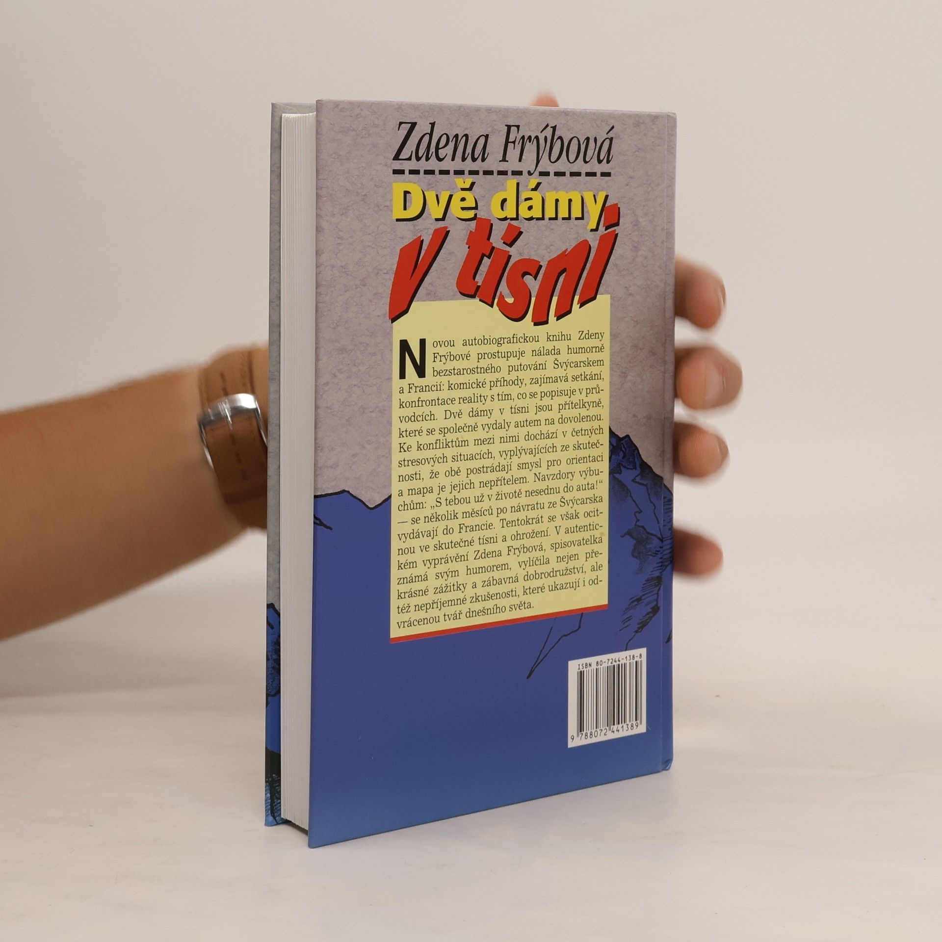 Autobiografickou knihu Zdeny Frýbové prostupuje nálada humorně bezstarostného putování Švýcarskem a Francií: komické příhody, zajímavá setkání, konfrontace reality s tím, co se popisuje v průvodcích. Dvě dámy v tísni jsou přítelkyně, které se společně vydaly autem na dovolenou. Ke konfliktům mezi nimi dochází v četných stresových situacích, vyplývajících ze skutečnosti, že obě postrádají smysl pro orientaci a mapa je jejich nepřítelem. V autentické vyprávění o vlastních cestách autorka vylíčila nejen krásné zážitky a zábavná dobrodružství, ale též nepříjemné zkušenosti, které ukazují i odvrácenou tvář dnešního světa. 2. vydání