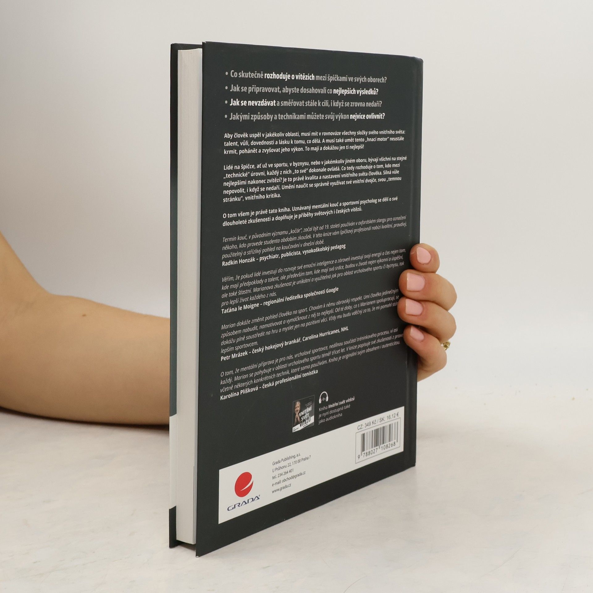 Co skutečně rozhoduje o vítězích mezi špičkami ve svých oborech? Jak se připravovat, abyste dosahovali co nejlepších výsledků? Jak se nevzdávat a směřovat stále k cíli, i když se zrovna nedaří? Jakými způsoby a technikami můžete svůj výkon nejvíce ovlivnit? Aby člověk uspěl v jakékoliv oblasti, musí mít v rovnováze všechny složky svého vnitřního světa: talent, vůli, dovednosti a lásku k tomu, co dělá. A musí také umět tento „hnací motor“ neustále krmit, pohánět a zvyšovat jeho výkon. To mají a dokážou jen ti nejlepší! Lidé na špičce, ať už ve sportu, v byznysu, nebo v jakémkoliv jiném oboru, bývají všichni na stejné „technické“ úrovni, každý z nich „to své“ dokonale ovládá. Co tedy rozhoduje o tom, kdo mezi nejlepšími nakonec zvítězí? Je to právě kvalita a nastavení vnitřního světa člověka. Silná vůle nepovolit, i když se nedaří. Umění naučit se správně využívat své vnitřní dvojče, svou „temnou stránku“, vnitřního kritika. O tom všem je právě tato kniha. Uznávaný mentální kouč a sportovní psycholog se dělí o své dlouholeté zkušenosti a doplňuje je příběhy světových i českých vítězů.