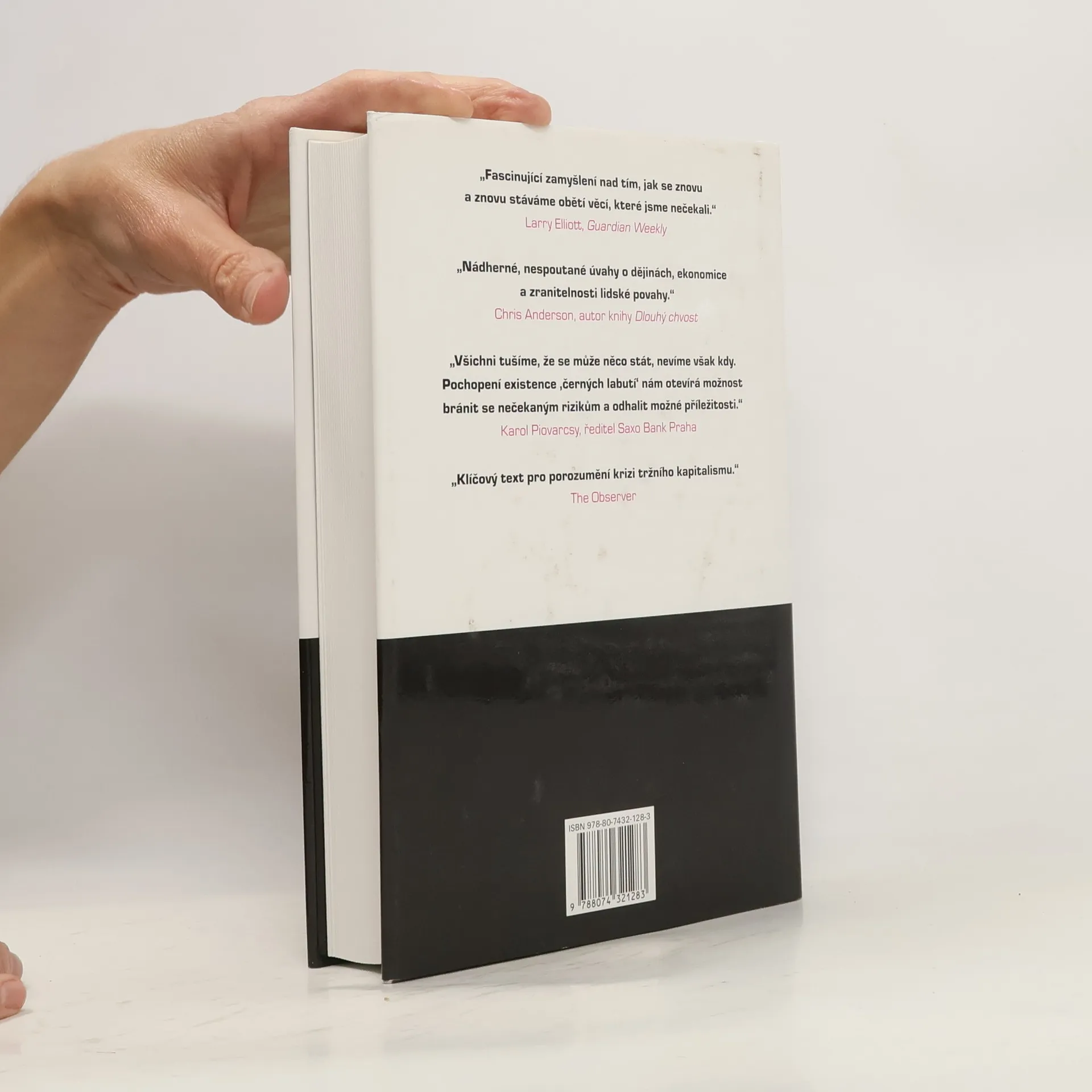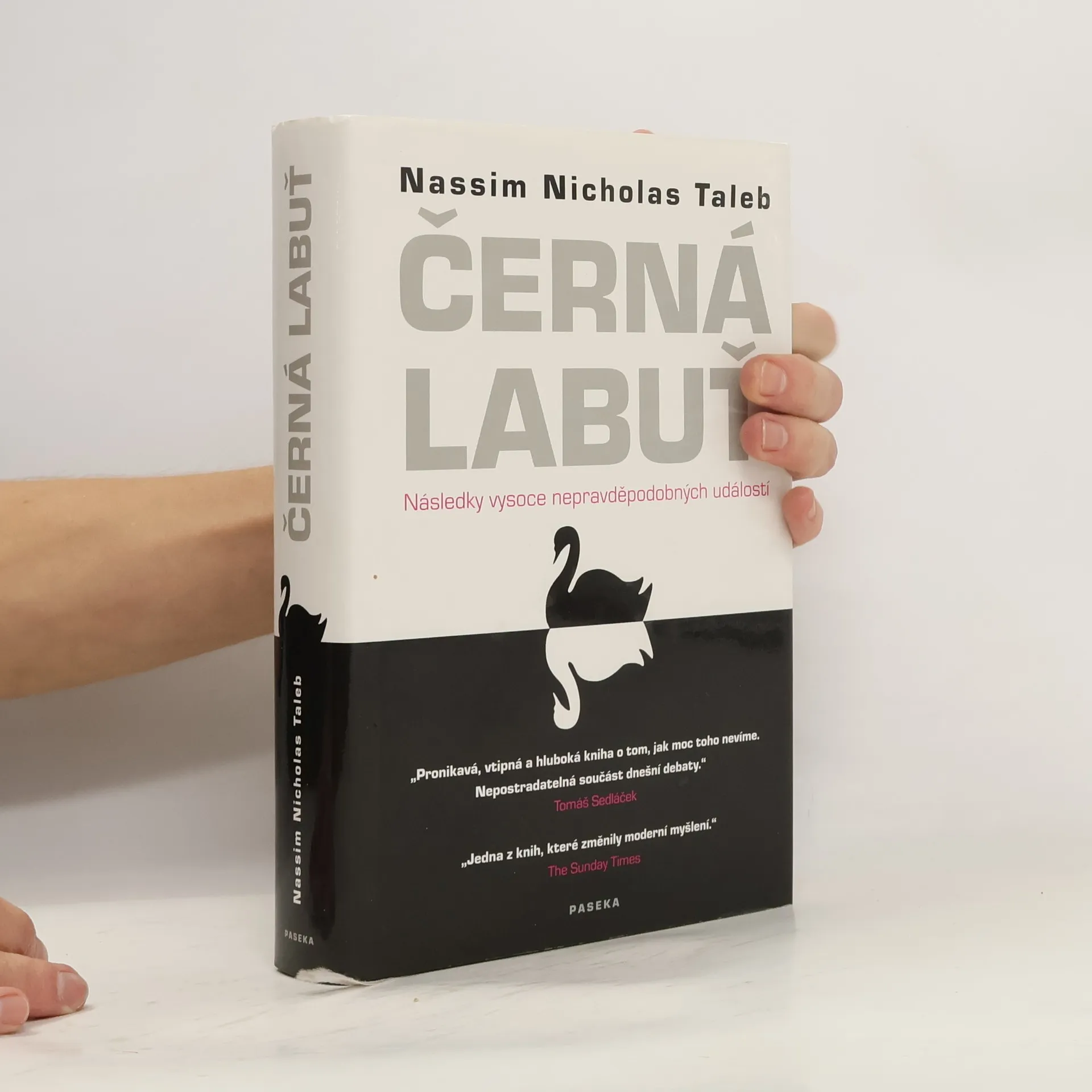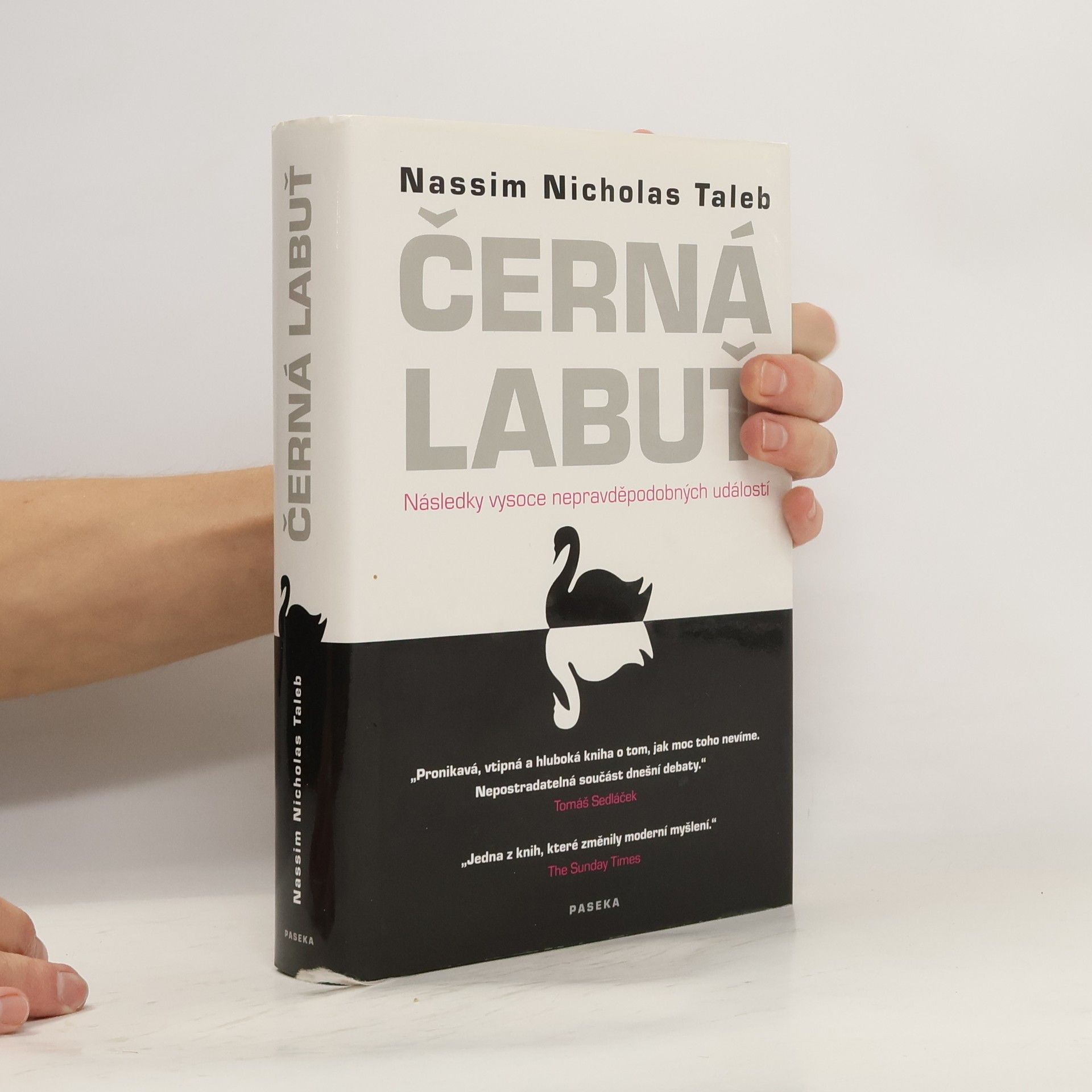 Následky vysoce nepravěpodobných událostí Bestseller amerického akademika a investičního poradce libanonského původu analyzuje fenomén „černých labutí“, tj. nepředvídaných jevů a událostí s významným dopadem na život jedince nebo celé společnosti, jakým byl např. teroristický útok z 11. září 2001, fenomenální úspěch společnosti Google či nedávná globální finanční a ekonomická krize. Autor – jeden z mála odborníků, kteří nástup krize předvídali – věří, že příčinou naší nepřipravenosti na podobné zlomové události je především setrvačnost našeho myšlení v podobě přílišné důvěry ve statistiky a prognostiky, přehnaného kategorizování, hledání „logiky“ vývoje či soustřeďování se na specifika tam, kde bychom měli přemýšlet spíše v obecných kontextech. Jeho kniha, vyzývající k tomu, abychom přehodnotili náš ustálený pohled na svět a přiznali si, jak málo o něm víme, patří dnes k nejdiskutovanějším pracím ve svém žánru, deníkem Times byla označena za jedno z nejvlivnějších děl posledních šedesáti let a díky autorovu širokému rozhledu, smyslu pro humor a zdravé provokativnosti je i velkým čtenářským zážitkem.
