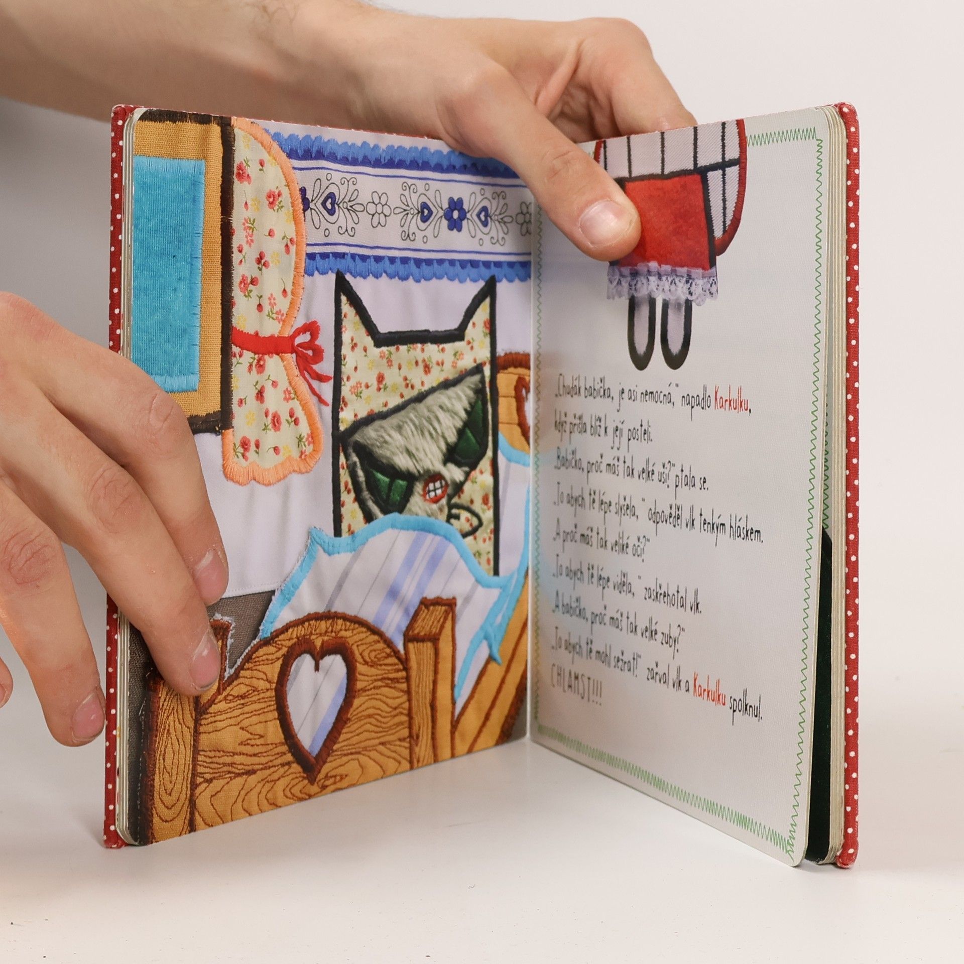 Červenou karkulku zná každý a každý ji jako rodič vypráví svým dětem. Pokusili jsme se pro vás připravit tuhle klasickou pohádku v netradičním provedení. Každá ilustrace byl speciálně vyšita pro tuto knihu, obálka je potažena barevným plátnem s plastickou výšivkou Karkulky. Přinášíme vašim dětem nový rozměr známého příběhu a doufáme, že se jim bude líbit.