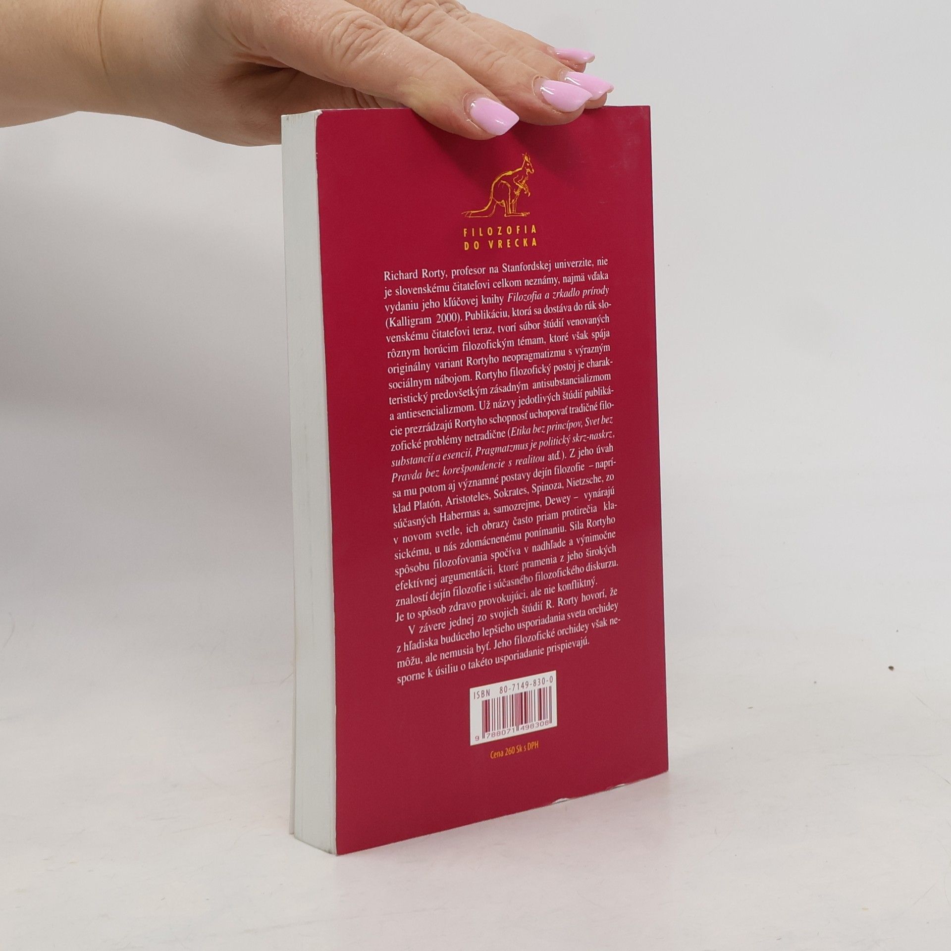 Richard Rorty, profesor na Standforskej univerzite, nie je slovenskému čitateľovi celkom neznámy, najmä vďaka vydaniu jeho kľúčovej knihy Filozofia a zrkadlo prírody (Kalligram 2000). Publikáciu, ktorá sa dostáva do rúk slovenskému čitateľovi teraz, tvorí súbor štúdií venovaných rôznym horúcim filozofickým témam, ktoré však spája originálny variant Rortyho neopragmatizmu s výrazným sociálnym nábojom. Rortyho filozofický postoj je charakteristický predovšetkým zásadným antisubstancionalizmom a antiesencionalizmom. Z jeho úvah sa mu potom aj významné postavy dejín filozofie - napríklad Platón, Aristoteles, Sokrates, Spinoza, Nietzsche, zo súčasných Habermas a, samozrejme Dewey - vynárajú v novom svetle. V závere jednej zo svojich štúdií R. Rorty hovorí, že z hľadiska budúceho lepšieho usporiadania sveta orchidey môžu, ale nemusia byť. Jeho filozofické orchidey však nesporne k úsiliu o takéto usporoadanie prispievajú.