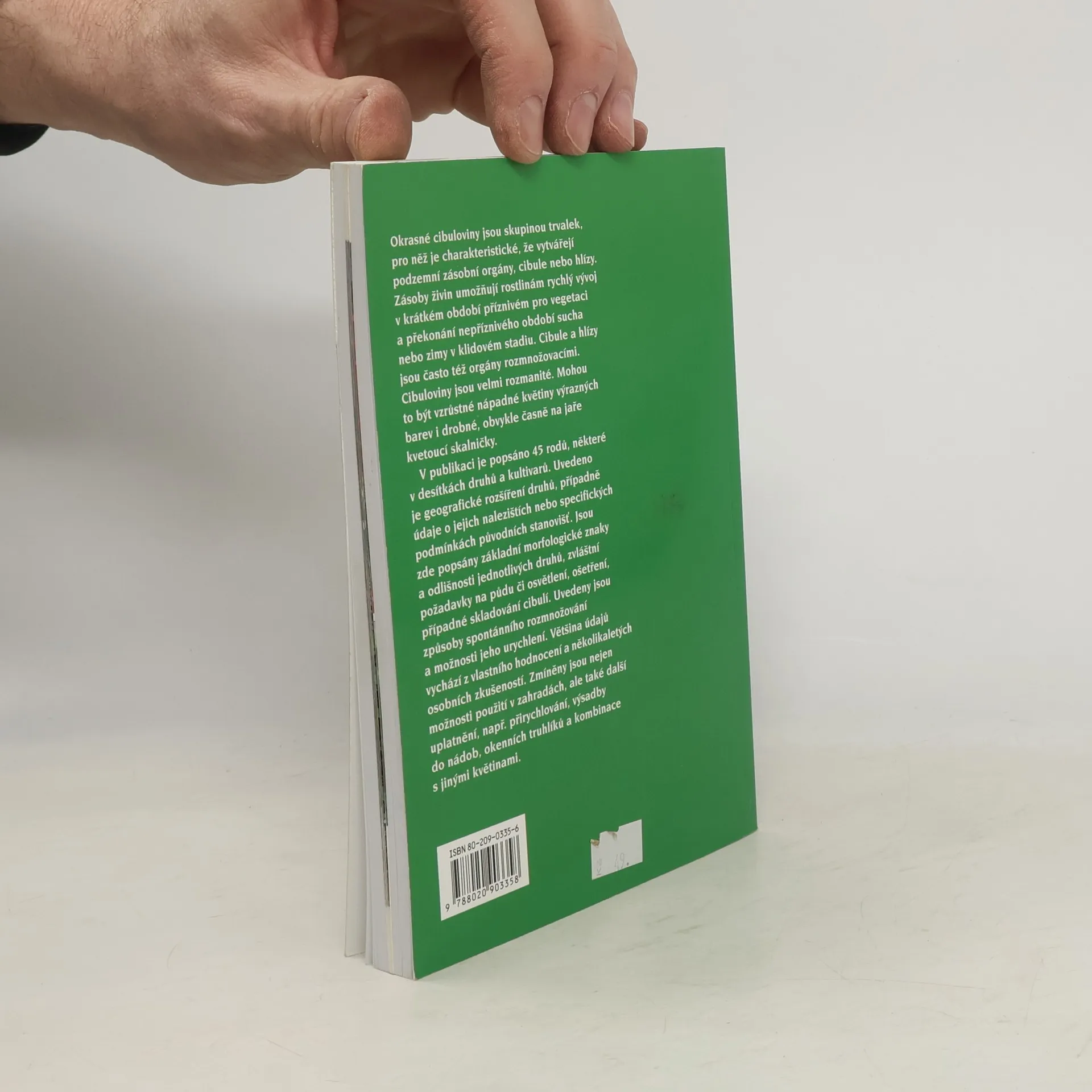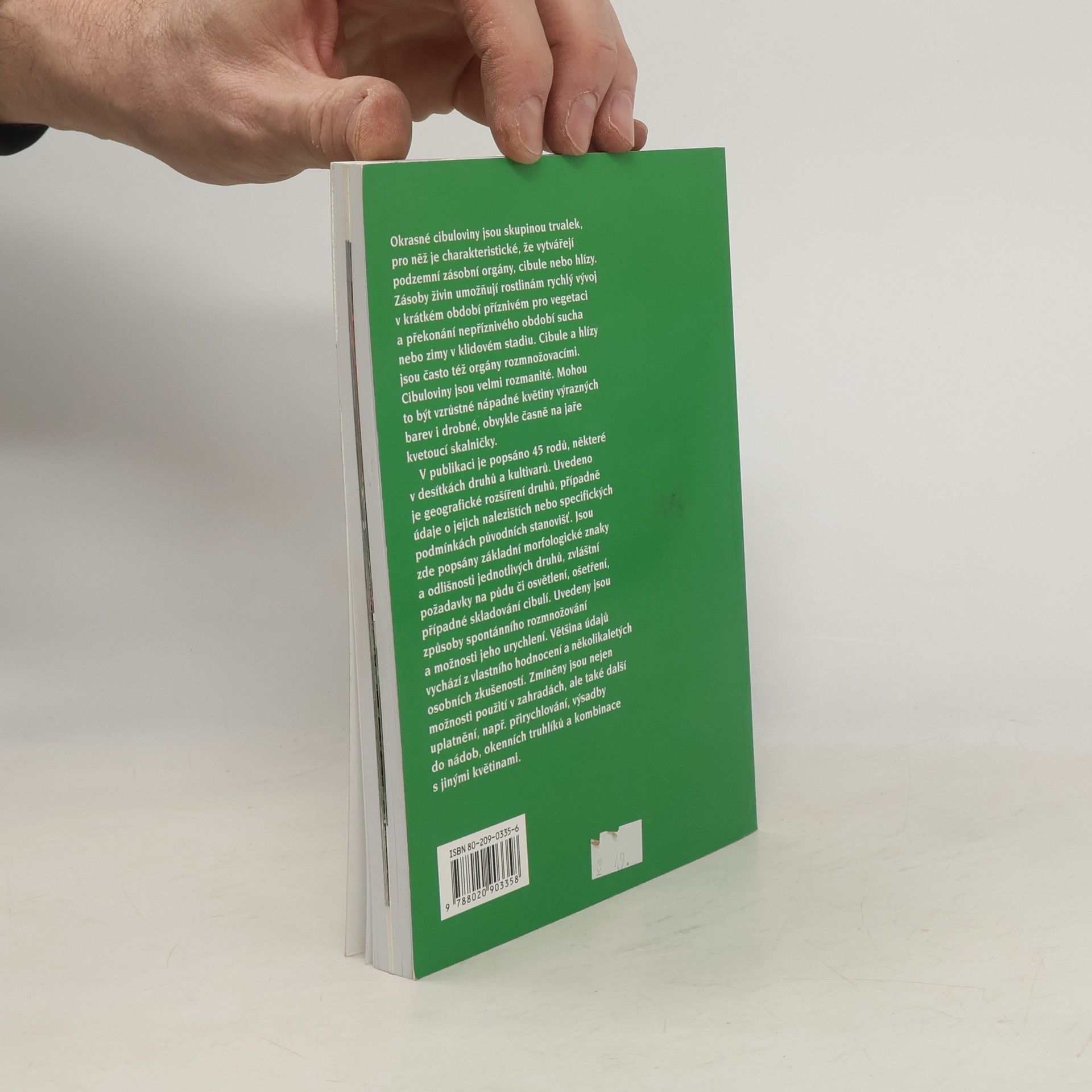 Okrasné cibuloviny jsou skupinou trvalek, pro něž je charakteristické, že vytvářejí podzemní zásobní orgány, cibule nebo hlízy. Cibuloviny jsou velmi rozmanité.Mohou to být vzrůstné nápadné květiny výrazných barev i drobné, obvykle časně na jaře kvetoucí skalničky. V publikaci je popsáno 45 rodů, některé v desítkách druhů a kultivarů. Uvedeno je geografické rozšíření druhů, případně údaje o jejich nalezištích . nebo specifických podmínkách původních stanovišť. Jsou zde popsány základní morfologické znaky a odlišnosti jednotlivých druhů, zvláštní požadavky na půdu či osvětlení, ošetření, případně skladování cibulí. Uvedeny jsou způsoby spontánního rozmnožování a možnosti jeho urychlení. Většina údajů vychází z vlastního hodnocení a několikaletých osobních zkušeností. Zmíněny jsou nejen možnosti použití v zahradách, ale také další uplatnění, např.přirychlování,výsadby do nádob, okenních truhlíků a kombinace s jinými květinami.