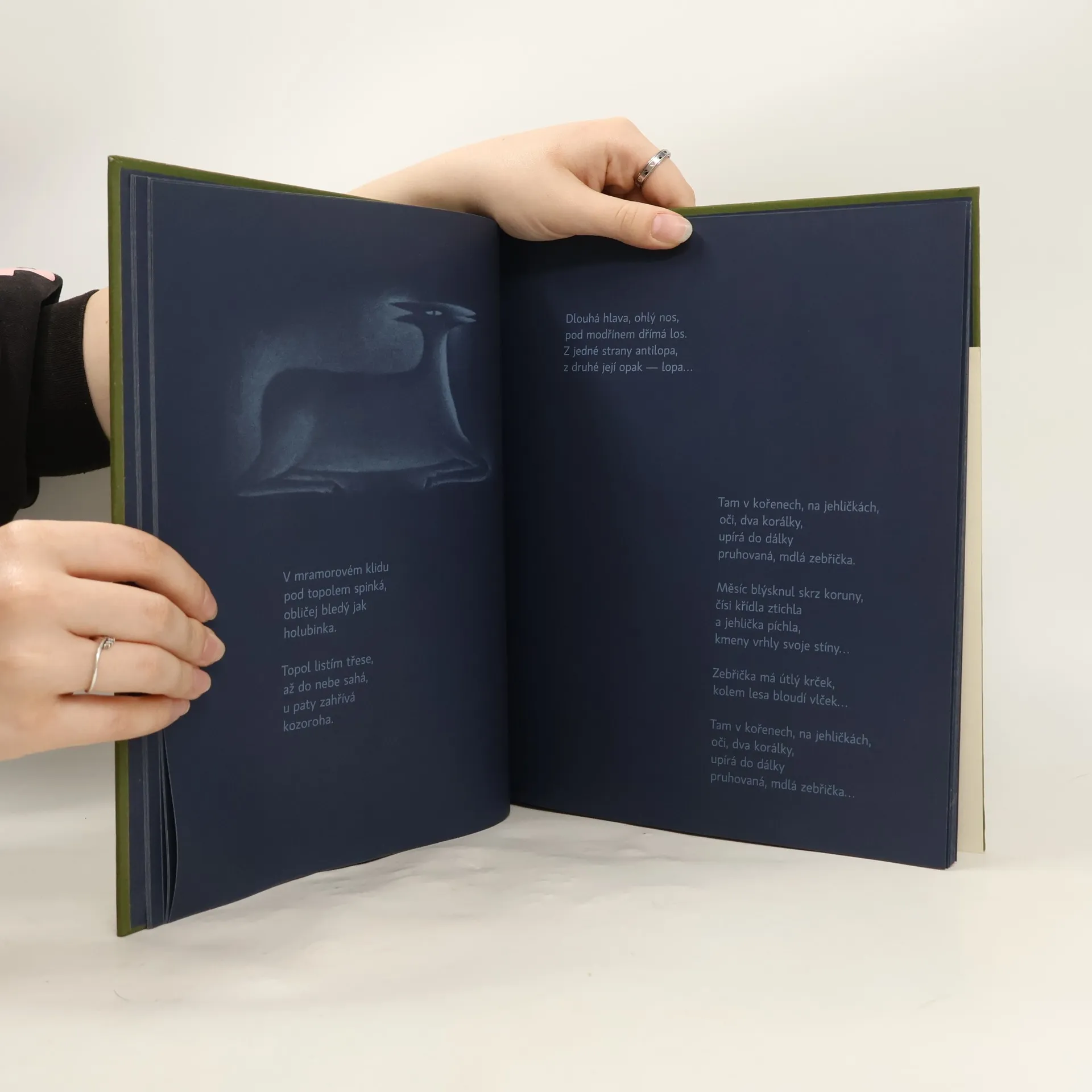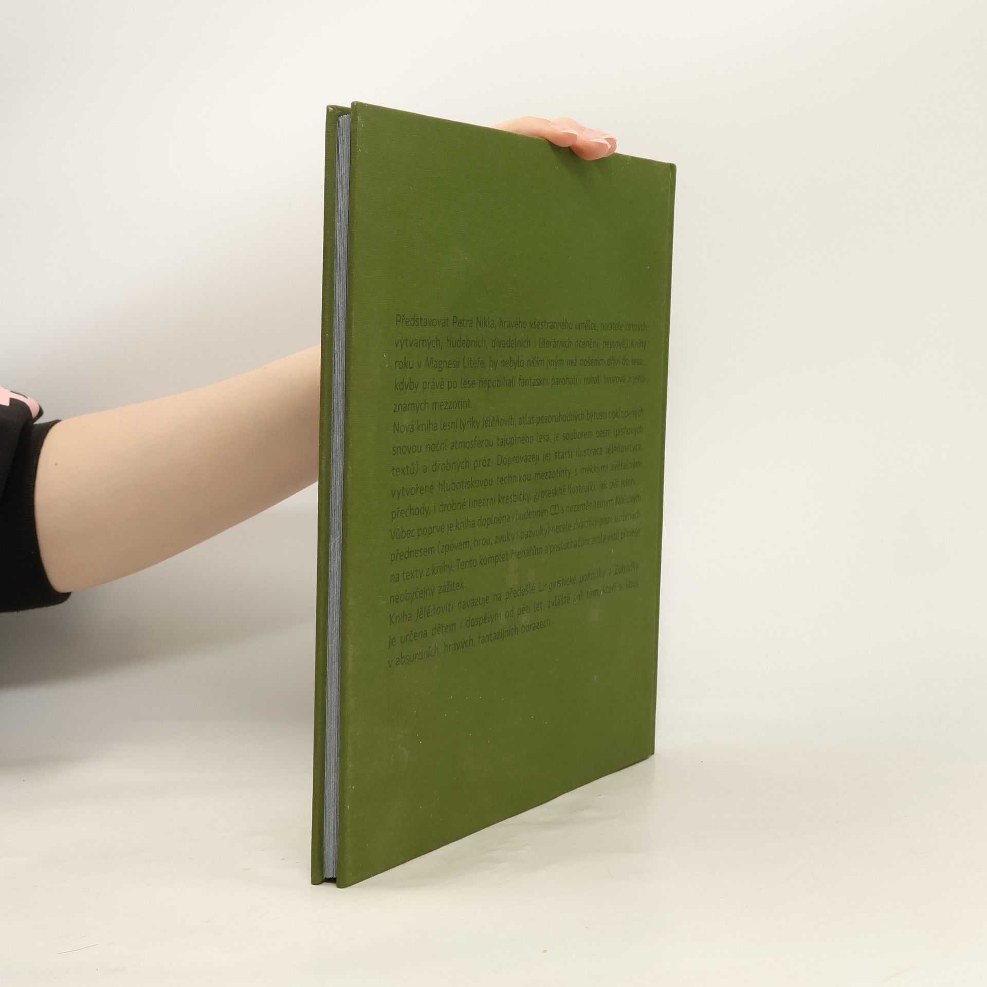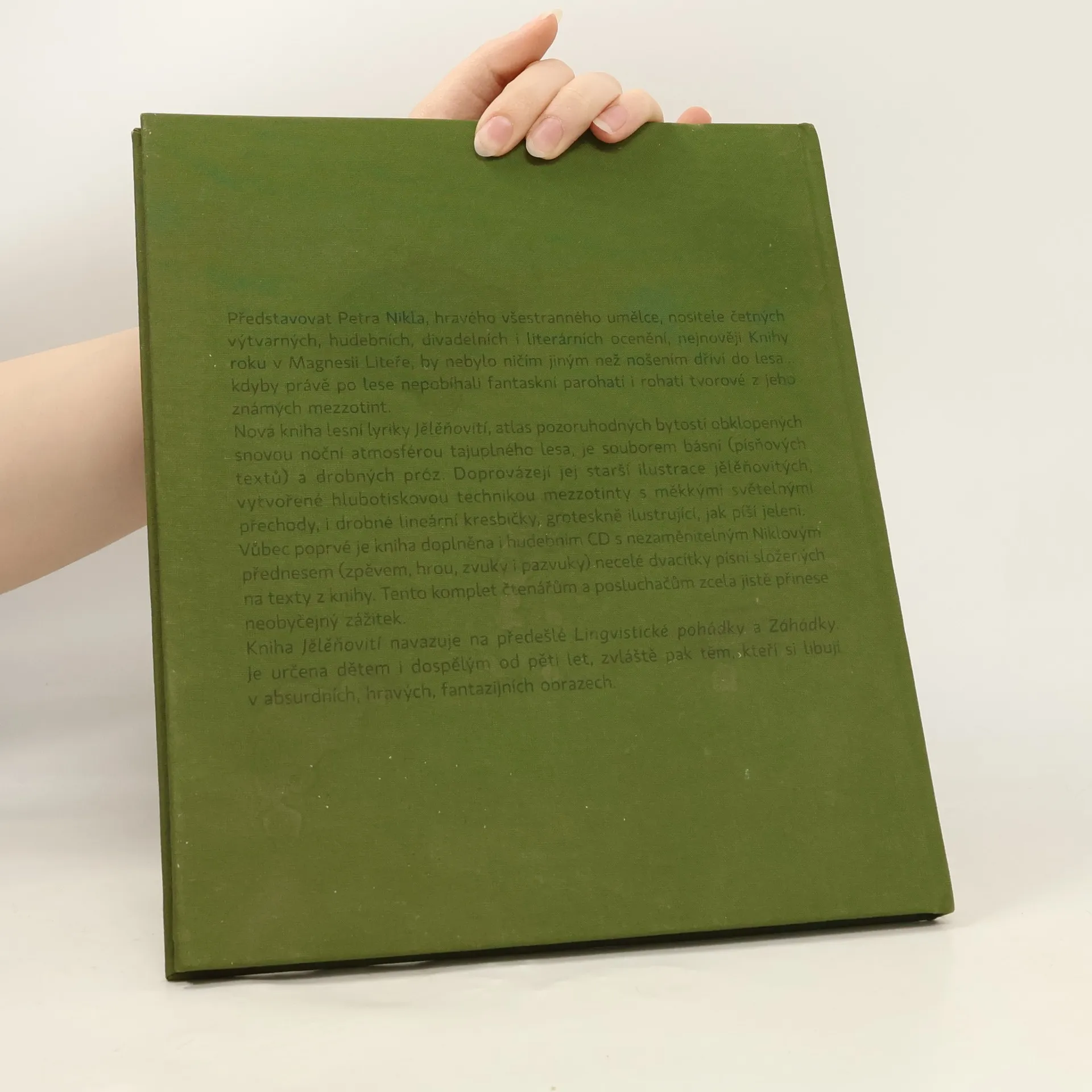 Představovat Petra Nikla, hravého všestranného umělce, nositele četných výtvarných, hudebních, divadelních i literárních ocenění, nejnověji Knihy roku v Magnesii Liteře, by nebylo ničím jiným než nošením dříví do lesa... kdyby právě po lese nepobíhali fantaskní parohatí i rohatí tvorové z jeho známých mezzotint. Nová kniha lesní lyriky Jělěňovití, atlas pozoruhodných bytostí obklopených snovou noční atmosférou tajůplného lesa, je souborem básní (písňových textů) a drobných próz. Doprovázejí jej starší ilustrace jělěňovitých, vytvořené hlubotiskovou technikou mezzotinty s měkkými světelnými přechody, i drobné lineární kresbičky, groteskně ilustrující, jak píší jeleni. Tento komplet čtenářům a posluchačům zcela jistě přinese neobyčejný zážitek. Kniha Jělěňovití navazující na předešlé Lingvistické pohádky a Záhádky je určena dětem i dospělým od pěti let, zvláště pak těm, kteří si libují v absurdních, hravých a fantazijních obrazech. --------------------------------------------------------------------------------