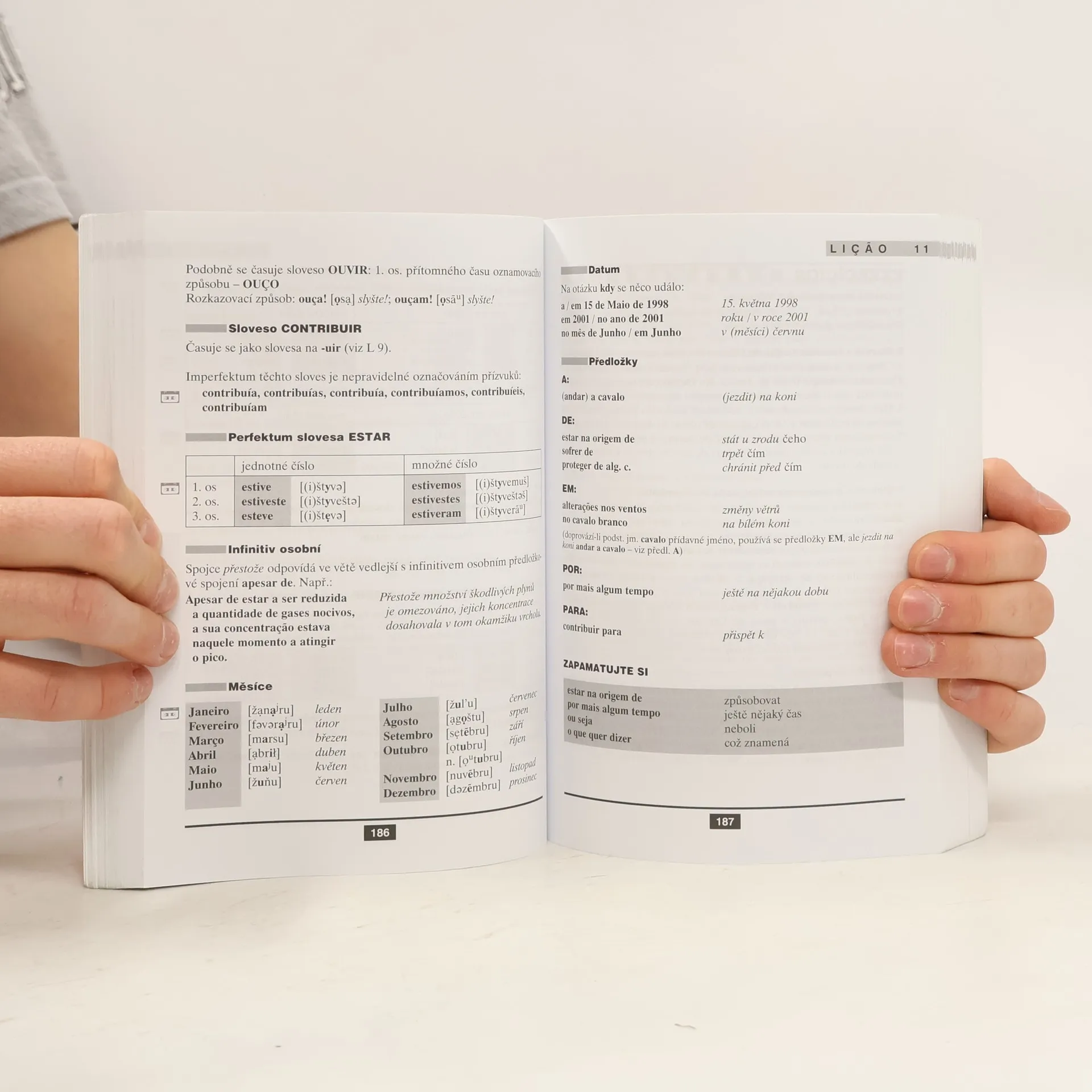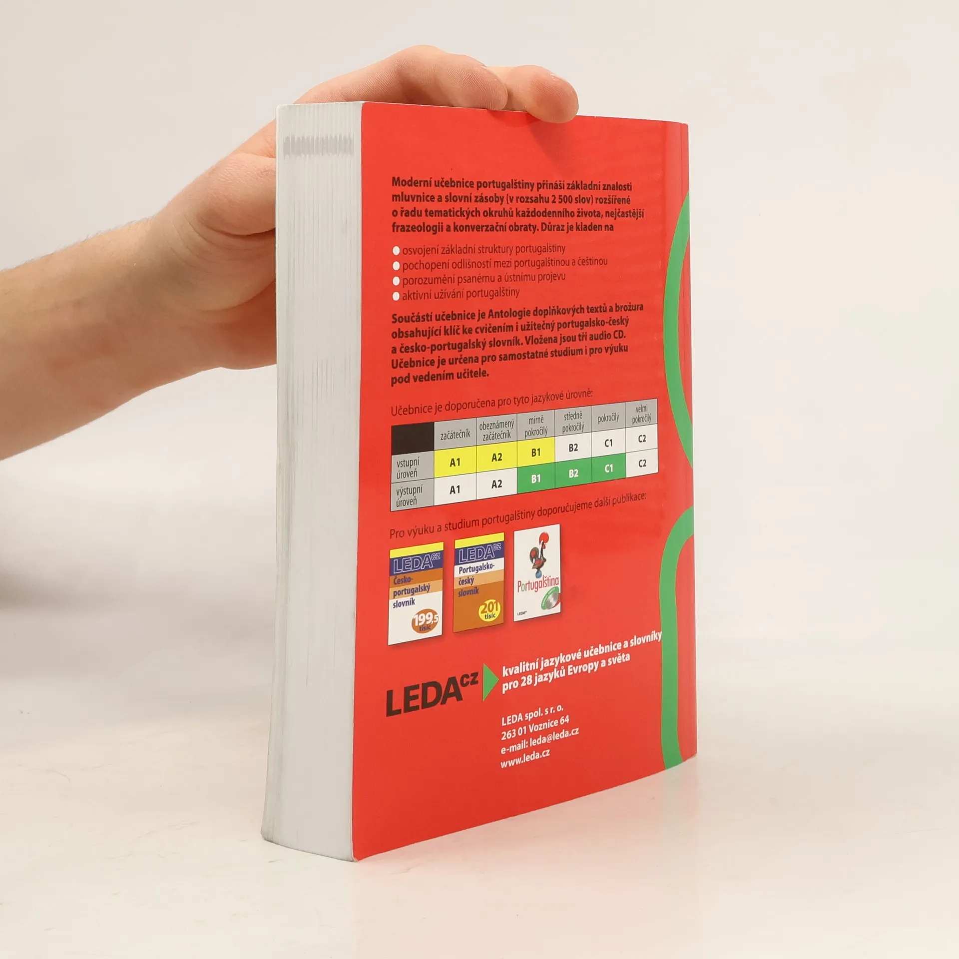 Učebnici určenou jak pro samostatné studium, tak pro výuku pod vedením učitele, tvoří 31 lekcí plus lekce úvodní se zásadami výslovnosti. Je zaměřena na evropskou portugalštinu a hlavními odlišnostmi portugalštiny brazilské se zabývá pouze ve dvou závěrečných lekcích. Každá lekce se skládá z úvodních textů, slovníčku k lekci (základního a doplňkového), mluvnického výkladu a řady cvičení s klíčem. Do učebnice je začleněna též Antologie doplňkových textů. Studující mají k dispozici portugalsko-český slovník, který obsahuje základní slovní zásobu učebnice (2 500 slov), i slovník česko-portugalský (stejného rozsahu). Orientaci v učebnici usnadňuje Mluvnický rejstřík, seznam konverzačních okruhů a odkazy na reálie Portugalska a zemí portugalského jazyka.