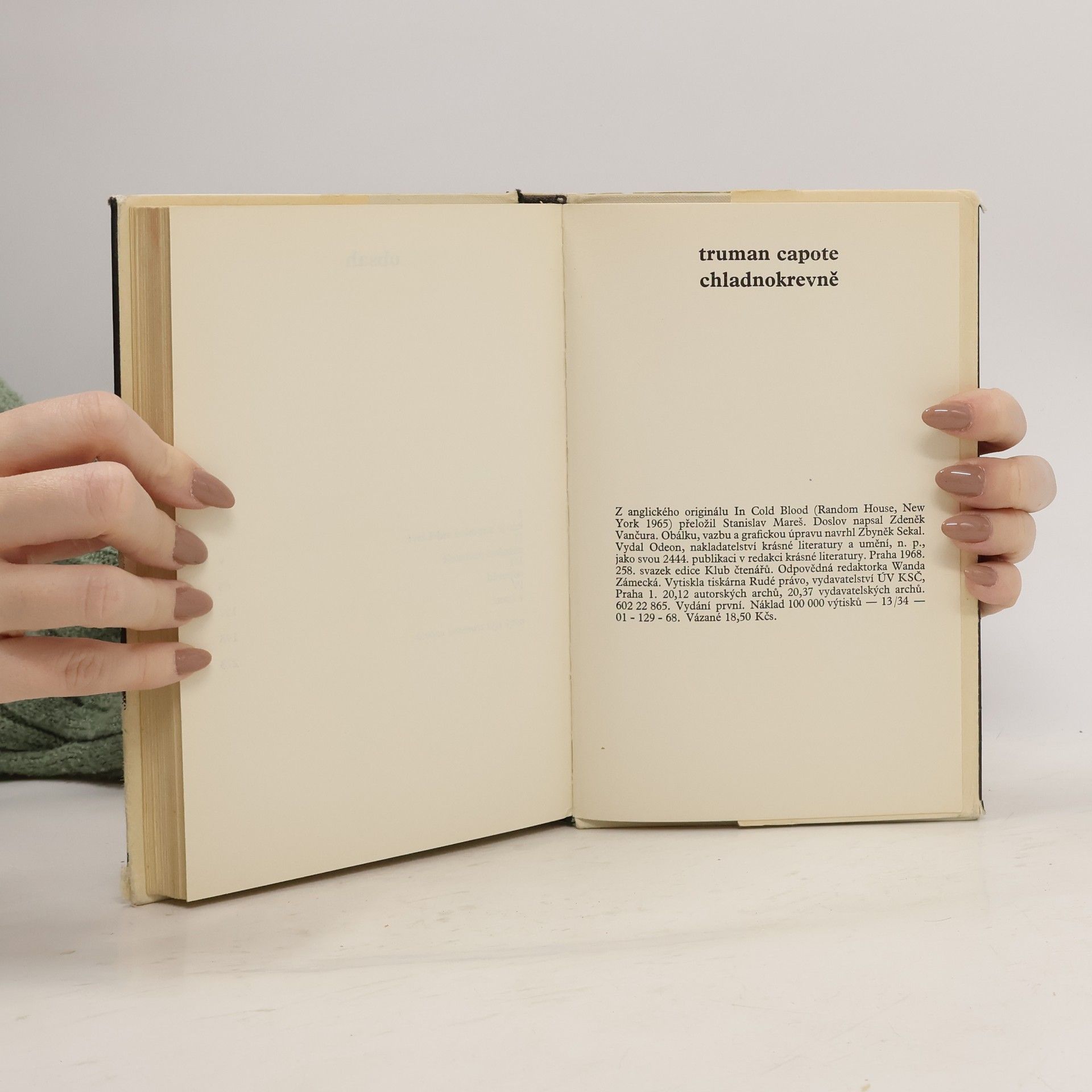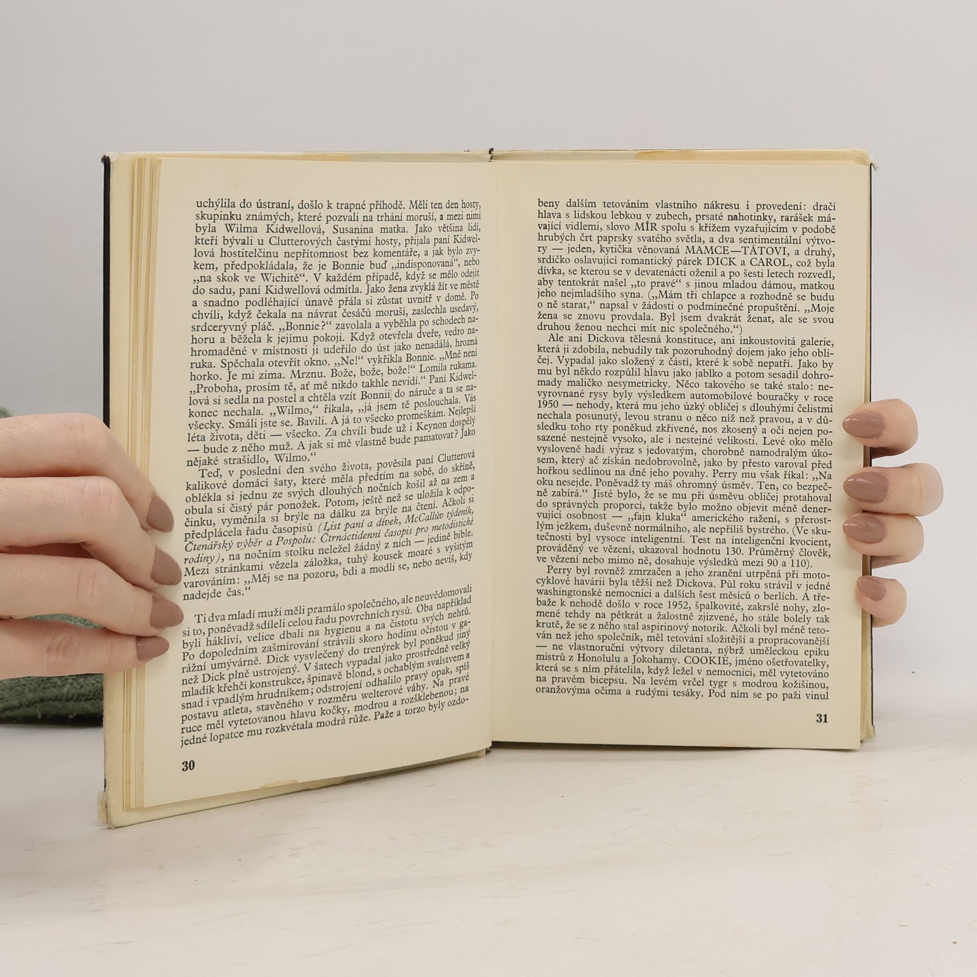 Umělecká, románově pojatá reportáž o čtyřnásobné vraždě v Americe r. 1959 a o dopadení, vyšetřování a potrestání vrahů; román z pera významného amerického spisovatele, považovaný za vrchol současné americké prózy. Autor v něm výběrem a dramatickým řazením faktů rekonstruje bestiální vraždu čtyř členů farmářské rodiny v zapadlé vesnici v Kansasu dvěma patologicky zrůdnými chuligány, a to od motivu vraždy, přes vraždu samu, až po potrestání zločinců... Edice: Klub čtenářů ; sv. 258. Obálka a vazba: Zbyněk Sekal