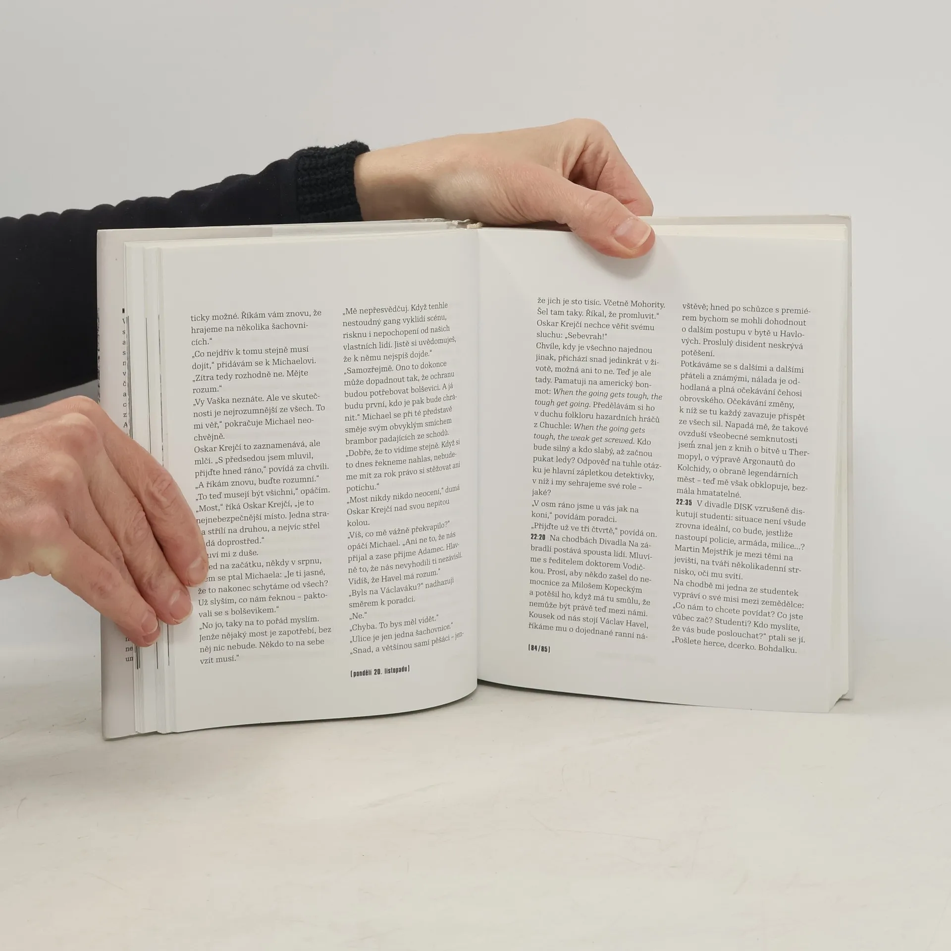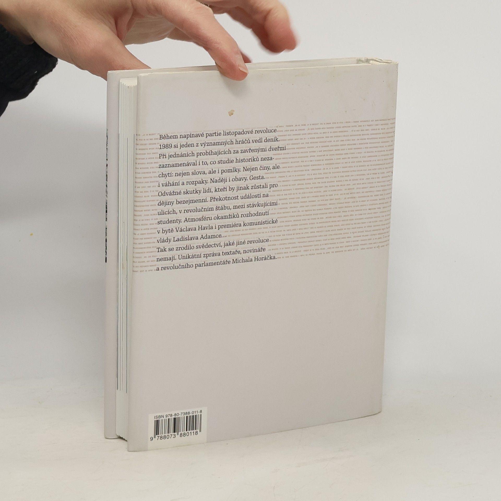 Během napínavé partie listopadové revoluce si jeden z významných hráčů vedl deník. Při jednáních, vedených za zavřenými dveřmi, zaznamenával i to, co studie historiků nezachytí: nejen slova, ale i pomlky. Nejen činy, ale i váhání a rozpaky. Naději i obavy. Gesta. Odvážné skutky lidí, kteří by jinak zůstali pro dějiny bezejmenní. Překotnost událostí na ulicích, v revolučním štábu, mezi stávkujícími studenty. Atmosféru okamžiků rozhodnutí v bytě Václava Havla i premiéra komunistické vlády Ladislava Adamce… Tak se zrodilo svědectví, jaké jiné revoluce nemají. Unikátní zpráva textaře, novináře a revolučního parlamentáře Michala Horáčka.