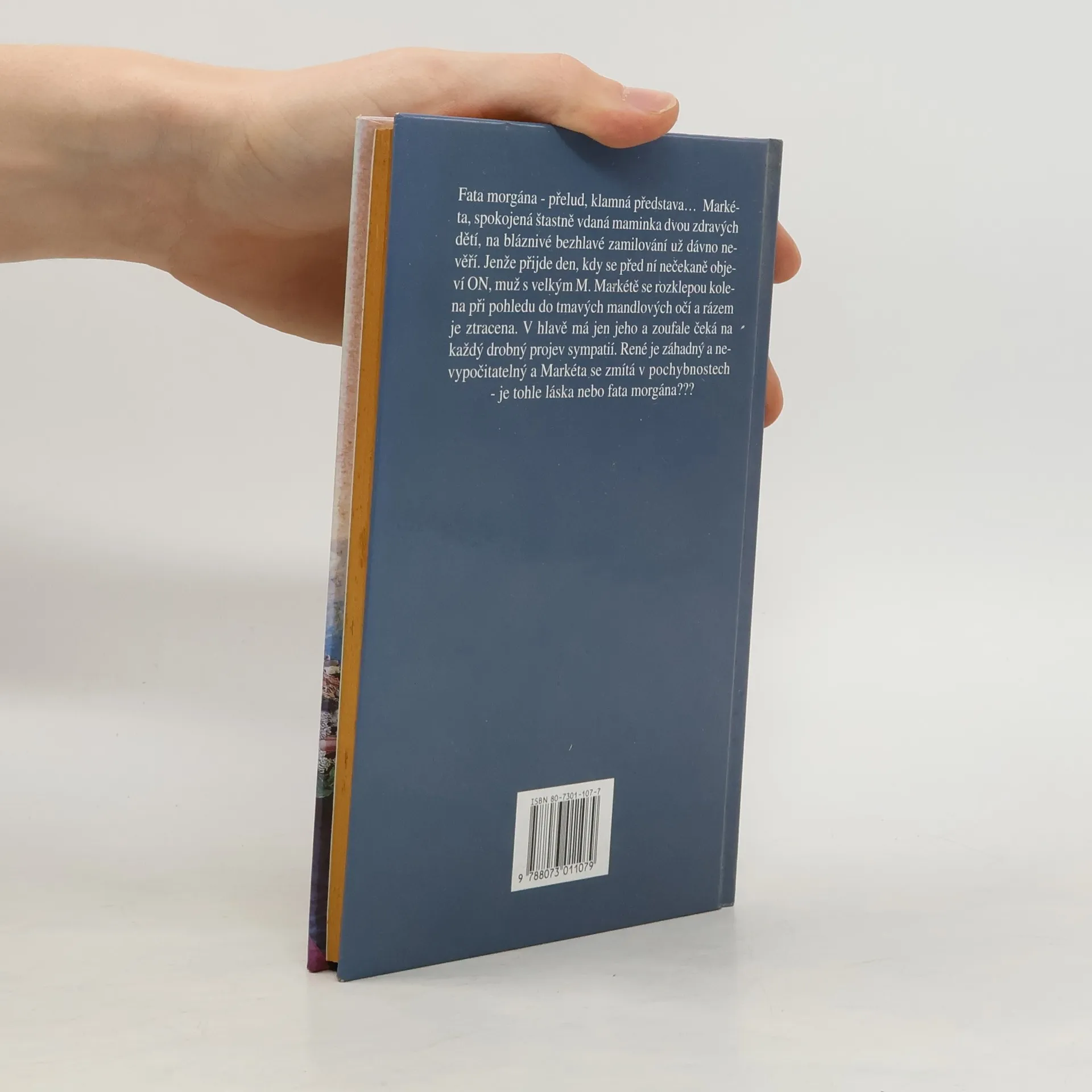 Fata morgána - přelud, klamná představa... Markéta, spokojená štastně vdaná maminka dvou zdravých dětí, na bláznivé bezhlavé zamilování už dávno nevěří. Jenže přijde den, kdy se před ní nečekaně objeví ON, muž s velkým M. Markétě se rozklepou kolena při pohledu do tmavých mandlových očí a rázem je ztracena. V hlavě má jen jeho a zoufale čeká na každý drobný projev sympatií. René je záhadný a nevypočitatelný a Markéta se zmítá v pochybnostech - je tohle láska nebo fata morgána???