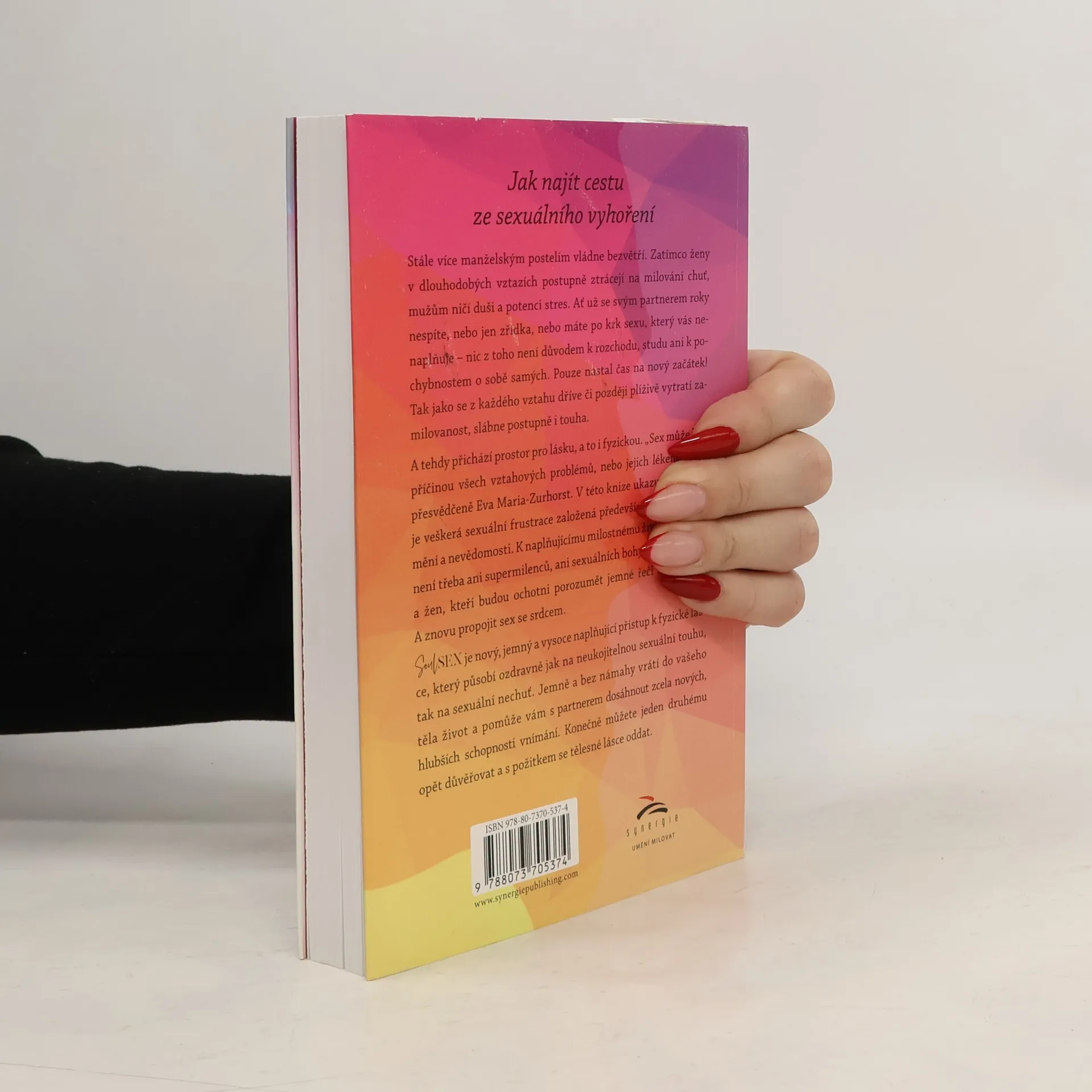 Stále více manželským postelím vládne bezvětří. Ženy v dlouhodobých vztazích ztrácejí chuť na milování, zatímco muži trpí stresem. Ať už se svým partnerem nespíte roky, nebo máte po krk nenaplňujícího sexu, není to důvod k rozchodu ani k pochybnostem o sobě. Přichází čas na nový začátek! Zamilovanost se z každého vztahu postupně vytrácí, stejně jako touha. Právě tehdy nastává prostor pro lásku, včetně fyzické. Eva Maria-Zurhorst tvrdí, že „sex může být příčinou všech vztahových problémů, nebo jejich lékem“. V této knize ukazuje, jak moc je sexuální frustrace založena na nedorozumění a nevědomosti. K naplňujícímu milostnému životu není třeba supermilenců, ale mužů a žen ochotných porozumět jemné řeči svého těla a znovu propojit sex se srdcem. Soulsex představuje nový, jemný a vysoce naplňující přístup k fyzické lásce, který ozdravně působí na sexuální touhu i nechuť. Pomůže vám s partnerem dosáhnout hlubších schopností vnímání a obnovit důvěru. Skrze pochopení a praktické návody pro intimní lásku se otevře nový svět, kde můžete znovu prožívat vyživující lásku a vášeň, i ve vztahu, který jste možná vzdali.