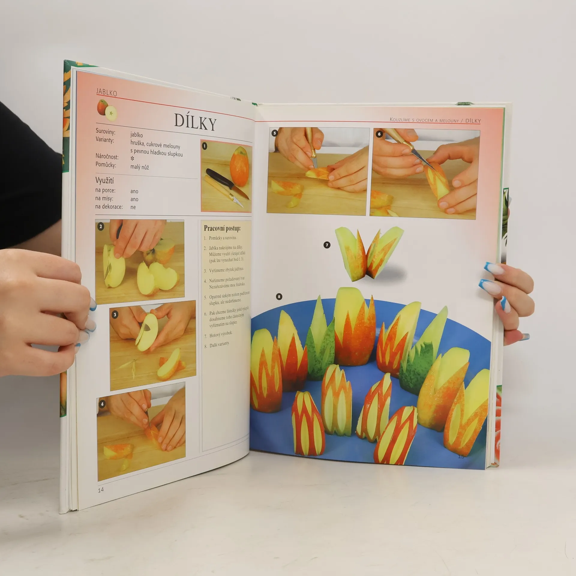 Kniha nabízí seznámení s východoasijskou technikou vytváření ozdob z nejrozmanitějších druhů ovoce a melounů a řadu námětů jak je využít a překvapit své přátele, jak při slavnostních příležitostech pořádání domácích oslav, tak i při skutečně reprezentativních slavnostních tabulích. Podle podrobných popisů i názorných barevných fotografií, zachycujících jednotlivé fáze vzniku ovocných ozdob, může tuto techniku vyřezávání „malých zázraků“ z ovoce a melounů zvládnout s příslušnou dávkou trpělivosti i úplný začátečník. Přitom je postupováno od nejjednodušších námětů až k náročným dekorativním kompozicím.