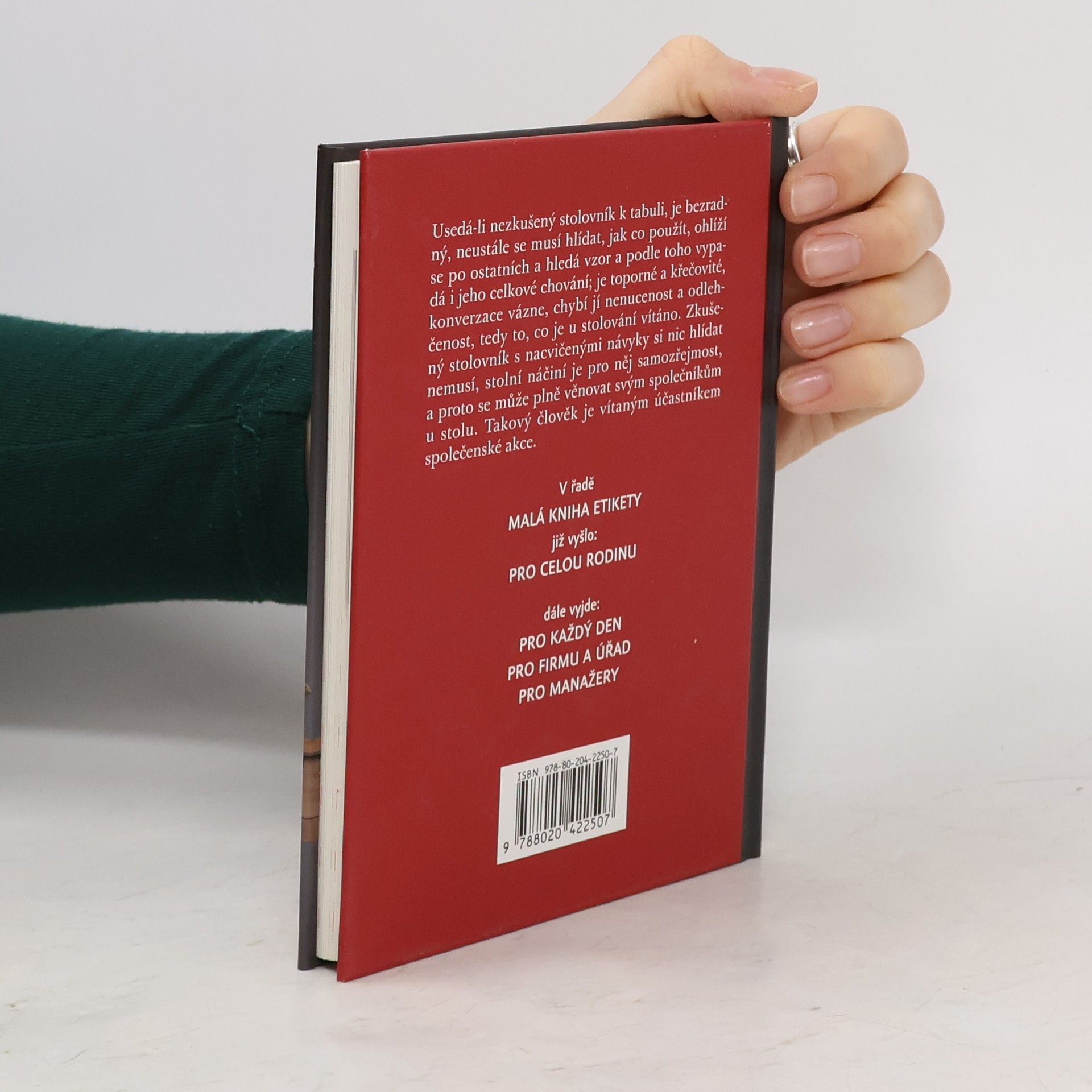 Malá kniha etikety u stolu je druhým dílem série malých a praktických rádců z pera Ladislava Špačka. Tu by si měli přečíst všichni bez ohledu na věk a společenské postavení, protože právě při stolování se projeví, jak je kdo zběhlý ve společenském životě. Seznámíme se s pravidly zasedacího pořádku, se správným chováním u stolu, dozvíme se, jak správně prostřít, jak nakládat s ubrouskem, jak držet příbor, jak jíst polévku, krevety, mušle, těstoviny, co s párátkem. V závěru se dozvíme více o různých typech stolování - banketu, rautu, nebo u nás méně známý revéllion.