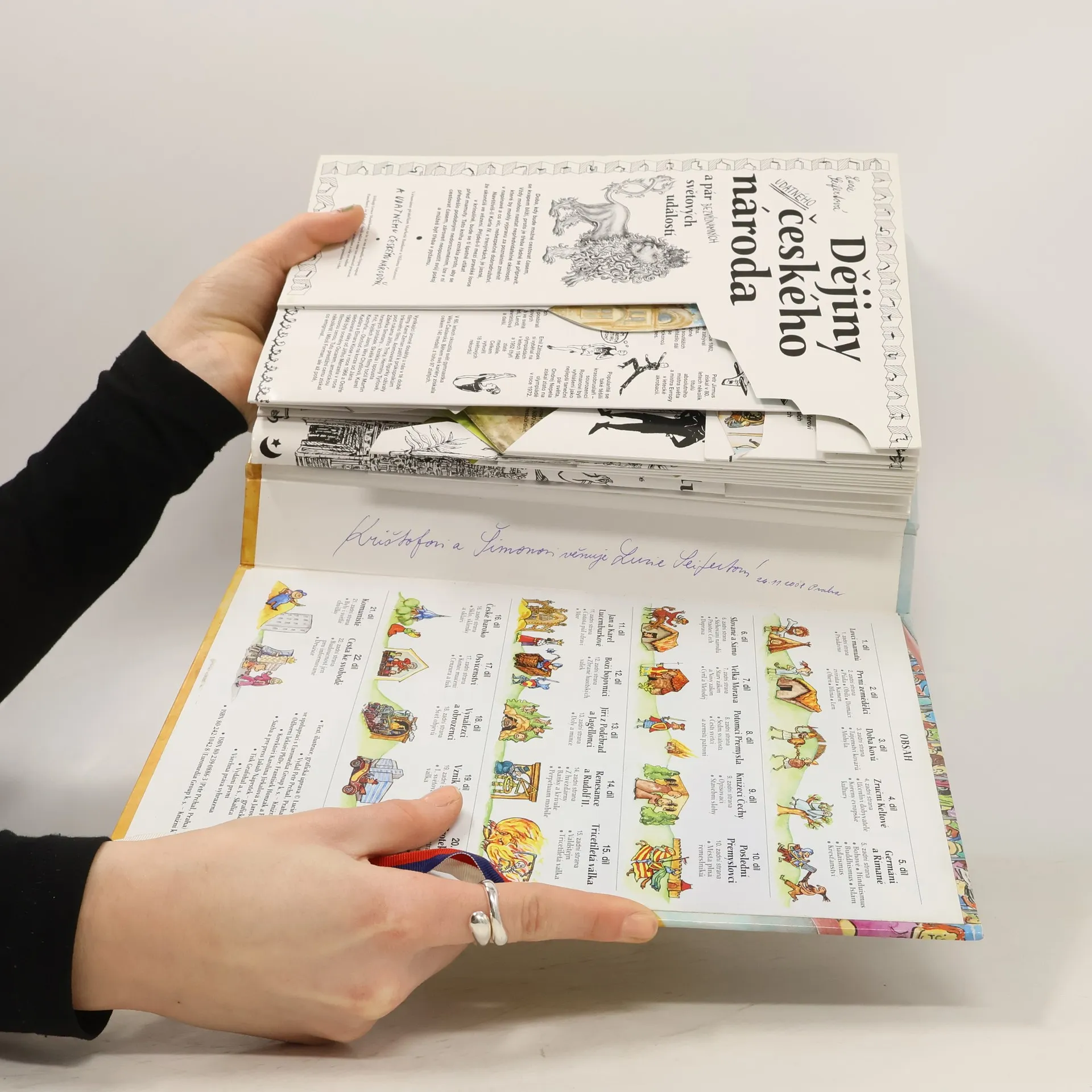 Tato „rodinná“ knížka pro děti i dospělé je určena nejen těm, co nedávali ve škole pozor (dozvědí se překvapivé informace z naší historie), ale i šprtům, ty zase pobaví (pro tyto vzdělanější čtenáře jsou připraveny zadní strany s podrobnějšími informacemi a zajímavostmi). Když rozložíme knihu jako harmonikovité leporelo, otevře se před námi 9 metrů dlouhá krajina v níž se odehrávají drobné děje od pravěkých lovců po současnost. Fakta, informace, chronologické tabulky ke všem obdobím nechybí a komixové textíky a kreslené postavičky umožní hledět na minulost a naše předky s humorem, nadsázkou a ironií. Tato kniha získala Magnesii Literu za knihu roku 2003 pro děti a mládež, Zlatou stuhu v kategorii Literatura faktu a populárně naučná literatura pro děti (za rok 2003) a Zlatů pečeť za polygrafické zpracování.