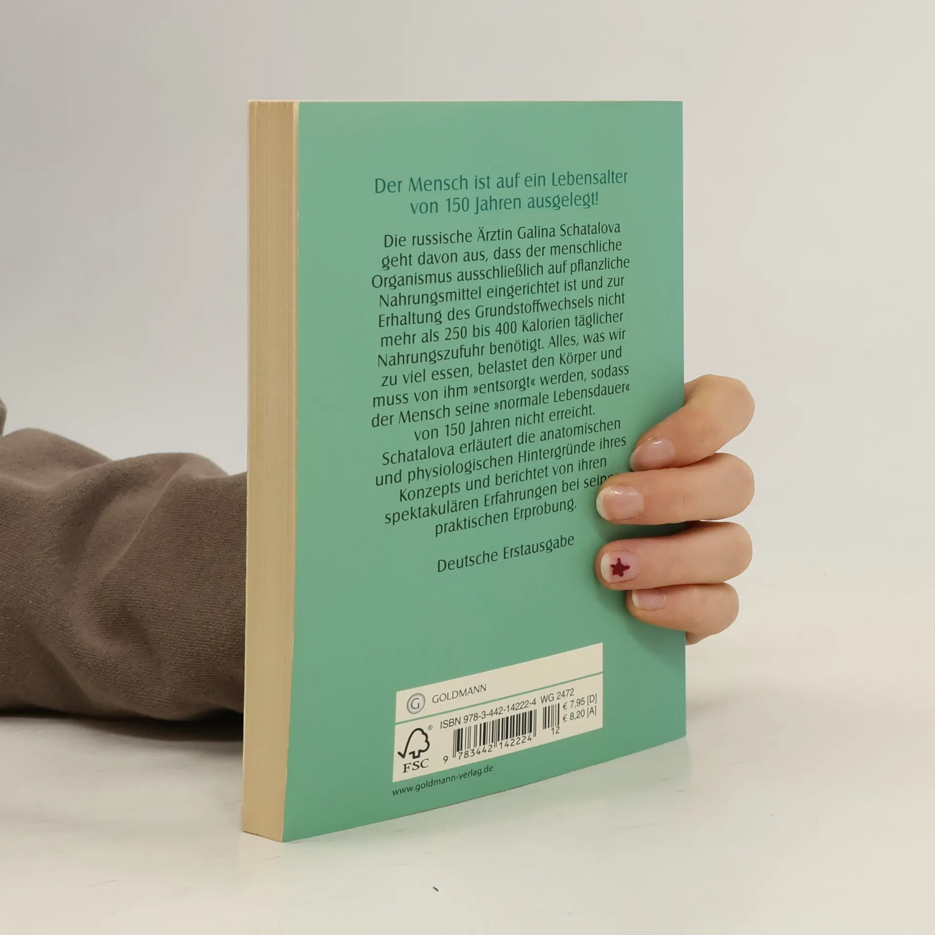 Die russische Ärztin Galina Schatalova geht davon aus, dass der menschliche Organismus ausschließlich auf pflanzliche Nahrungsmittel eingerichtet ist und zur Erhaltung des Grundstoffwechsels nicht mehr als 250 bis 400 Kalorien täglicher Nahrungszufuhr benötigt. Alles, was wir zu viel essen, belastet den Körper und muss von ihm \"entsorgt\" werden, sodass der Mensch seine \"normale Lebensdauer\" von 150 Jahren nicht erreicht. Schatalova erläutert die anatomischen und physiologischen Hintergründe ihres Konzepts und berichtet von ihren spektakulären Erfahrungen bei seiner praktischen Erprobung. (Verlagsangabe)